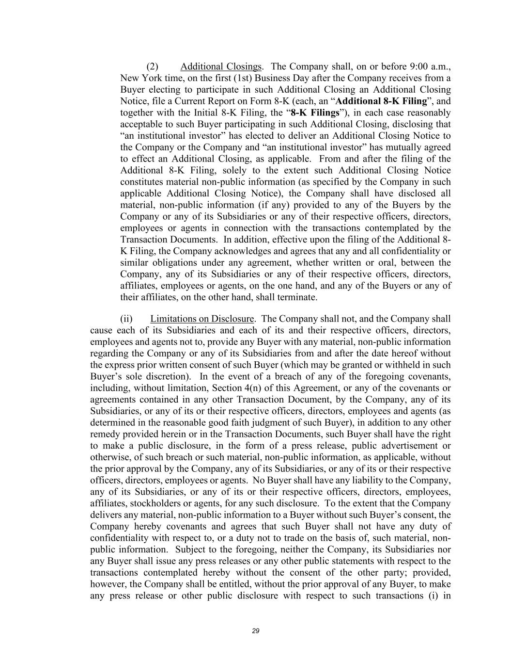 29 (2) Additional Closings. The Company shall, on or before 9:00 a.m., New York time, on the first (1st) Business Day after the Company receives from a Buyer electing to participate in such Additional Closing an Additional Closing Notice, file a Current Report on Form 8-K (each, an “Additional 8-K Filing”, and together with the Initial 8-K Filing, the “8-K Filings”), in each case reasonably acceptable to such Buyer participating in such Additional Closing, disclosing that “an institutional investor” has elected to deliver an Additional Closing Notice to the Company or the Company and “an institutional investor” has mutually agreed to effect an Additional Closing, as applicable. From and after the filing of the Additional 8-K Filing, solely to the extent such Additional Closing Notice constitutes material non-public information (as specified by the Company in such applicable Additional Closing Notice), the Company shall have disclosed all material, non-public information (if any) provided to any of the Buyers by the Company or any of its Subsidiaries or any of their respective officers, directors, employees or agents in connection with the transactions contemplated by the Transaction Documents. In addition, effective upon the filing of the Additional 8- K Filing, the Company acknowledges and agrees that any and all confidentiality or similar obligations under any agreement, whether written or oral, between the Company, any of its Subsidiaries or any of their respective officers, directors, affiliates, employees or agents, on the one hand, and any of the Buyers or any of their affiliates, on the other hand, shall terminate. (ii) Limitations on Disclosure. The Company shall not, and the Company shall cause each of its Subsidiaries and each of its and their respective officers, directors, employees and agents not to, provide any Buyer with any material, non-public information regarding the Company or any of its Subsidiaries from and after the date hereof without the express prior written consent of such Buyer (which may be granted or withheld in such Buyer’s sole discretion). In the event of a breach of any of the foregoing covenants, including, without limitation, Section 4(n) of this Agreement, or any of the covenants or agreements contained in any other Transaction Document, by the Company, any of its Subsidiaries, or any of its or their respective officers, directors, employees and agents (as determined in the reasonable good faith judgment of such Buyer), in addition to any other remedy provided herein or in the Transaction Documents, such Buyer shall have the right to make a public disclosure, in the form of a press release, public advertisement or otherwise, of such breach or such material, non-public information, as applicable, without the prior approval by the Company, any of its Subsidiaries, or any of its or their respective officers, directors, employees or agents. No Buyer shall have any liability to the Company, any of its Subsidiaries, or any of its or their respective officers, directors, employees, affiliates, stockholders or agents, for any such disclosure. To the extent that the Company delivers any material, non-public information to a Buyer without such Buyer’s consent, the Company hereby covenants and agrees that such Buyer shall not have any duty of confidentiality with respect to, or a duty not to trade on the basis of, such material, non- public information. Subject to the foregoing, neither the Company, its Subsidiaries nor any Buyer shall issue any press releases or any other public statements with respect to the transactions contemplated hereby without the consent of the other party; provided, however, the Company shall be entitled, without the prior approval of any Buyer, to make any press release or other public disclosure with respect to such transactions (i) in