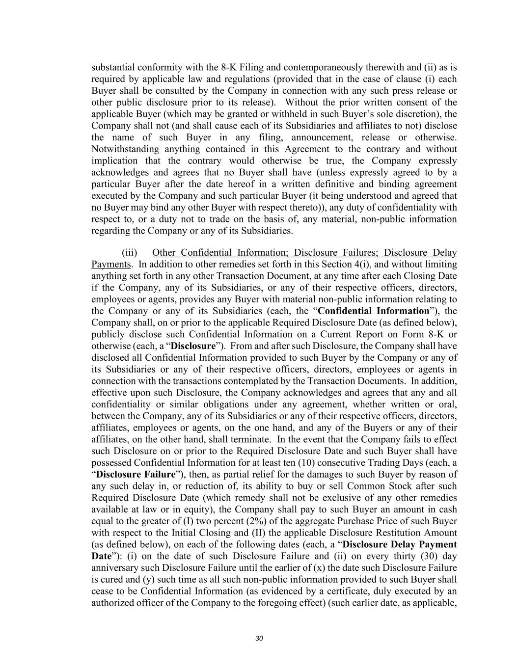 30 substantial conformity with the 8-K Filing and contemporaneously therewith and (ii) as is required by applicable law and regulations (provided that in the case of clause (i) each Buyer shall be consulted by the Company in connection with any such press release or other public disclosure prior to its release). Without the prior written consent of the applicable Buyer (which may be granted or withheld in such Buyer’s sole discretion), the Company shall not (and shall cause each of its Subsidiaries and affiliates to not) disclose the name of such Buyer in any filing, announcement, release or otherwise. Notwithstanding anything contained in this Agreement to the contrary and without implication that the contrary would otherwise be true, the Company expressly acknowledges and agrees that no Buyer shall have (unless expressly agreed to by a particular Buyer after the date hereof in a written definitive and binding agreement executed by the Company and such particular Buyer (it being understood and agreed that no Buyer may bind any other Buyer with respect thereto)), any duty of confidentiality with respect to, or a duty not to trade on the basis of, any material, non-public information regarding the Company or any of its Subsidiaries. (iii) Other Confidential Information; Disclosure Failures; Disclosure Delay Payments. In addition to other remedies set forth in this Section 4(i), and without limiting anything set forth in any other Transaction Document, at any time after each Closing Date if the Company, any of its Subsidiaries, or any of their respective officers, directors, employees or agents, provides any Buyer with material non-public information relating to the Company or any of its Subsidiaries (each, the “Confidential Information”), the Company shall, on or prior to the applicable Required Disclosure Date (as defined below), publicly disclose such Confidential Information on a Current Report on Form 8-K or otherwise (each, a “Disclosure”). From and after such Disclosure, the Company shall have disclosed all Confidential Information provided to such Buyer by the Company or any of its Subsidiaries or any of their respective officers, directors, employees or agents in connection with the transactions contemplated by the Transaction Documents. In addition, effective upon such Disclosure, the Company acknowledges and agrees that any and all confidentiality or similar obligations under any agreement, whether written or oral, between the Company, any of its Subsidiaries or any of their respective officers, directors, affiliates, employees or agents, on the one hand, and any of the Buyers or any of their affiliates, on the other hand, shall terminate. In the event that the Company fails to effect such Disclosure on or prior to the Required Disclosure Date and such Buyer shall have possessed Confidential Information for at least ten (10) consecutive Trading Days (each, a “Disclosure Failure”), then, as partial relief for the damages to such Buyer by reason of any such delay in, or reduction of, its ability to buy or sell Common Stock after such Required Disclosure Date (which remedy shall not be exclusive of any other remedies available at law or in equity), the Company shall pay to such Buyer an amount in cash equal to the greater of (I) two percent (2%) of the aggregate Purchase Price of such Buyer with respect to the Initial Closing and (II) the applicable Disclosure Restitution Amount (as defined below), on each of the following dates (each, a “Disclosure Delay Payment Date”): (i) on the date of such Disclosure Failure and (ii) on every thirty (30) day anniversary such Disclosure Failure until the earlier of (x) the date such Disclosure Failure is cured and (y) such time as all such non-public information provided to such Buyer shall cease to be Confidential Information (as evidenced by a certificate, duly executed by an authorized officer of the Company to the foregoing effect) (such earlier date, as applicable,