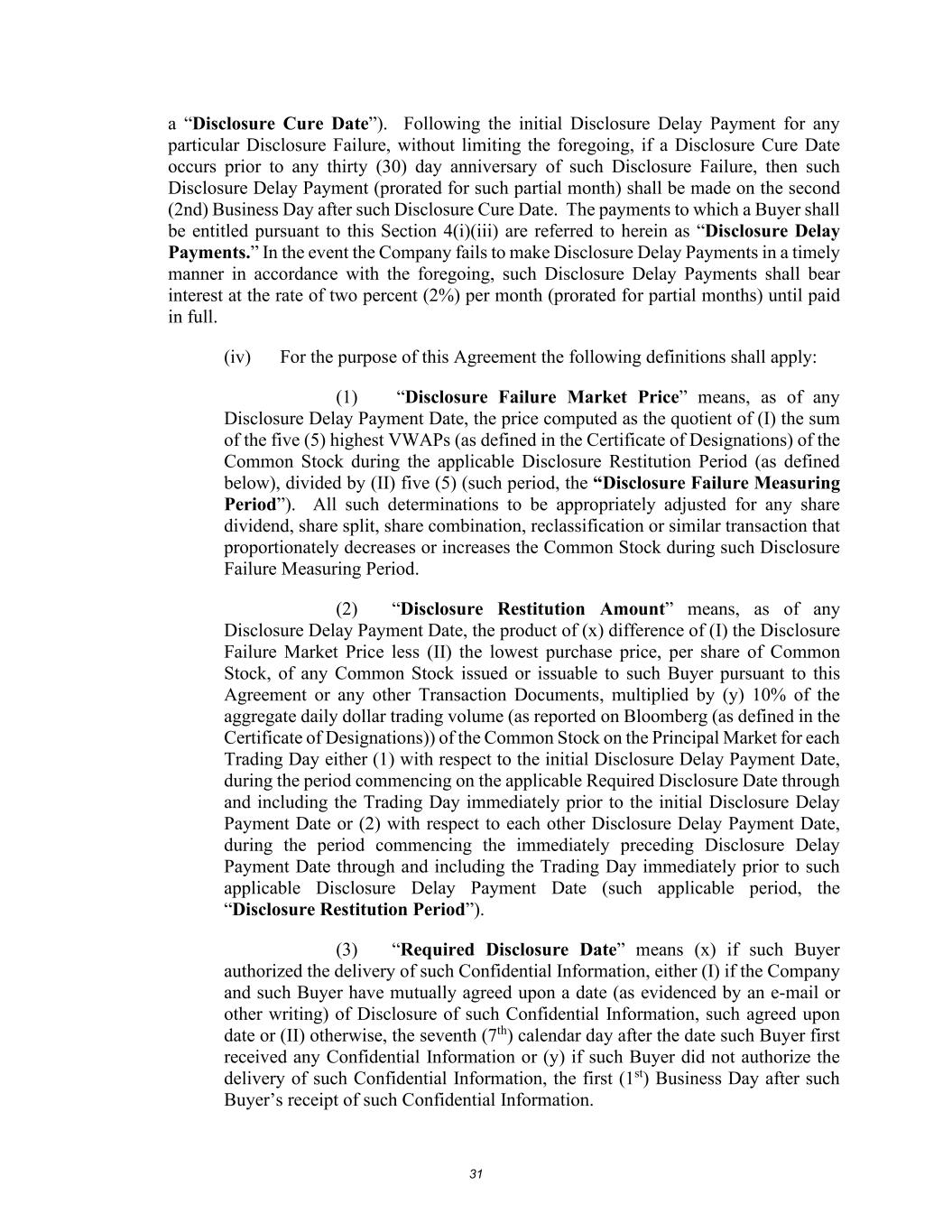 31 a “Disclosure Cure Date”). Following the initial Disclosure Delay Payment for any particular Disclosure Failure, without limiting the foregoing, if a Disclosure Cure Date occurs prior to any thirty (30) day anniversary of such Disclosure Failure, then such Disclosure Delay Payment (prorated for such partial month) shall be made on the second (2nd) Business Day after such Disclosure Cure Date. The payments to which a Buyer shall be entitled pursuant to this Section 4(i)(iii) are referred to herein as “Disclosure Delay Payments.” In the event the Company fails to make Disclosure Delay Payments in a timely manner in accordance with the foregoing, such Disclosure Delay Payments shall bear interest at the rate of two percent (2%) per month (prorated for partial months) until paid in full. (iv) For the purpose of this Agreement the following definitions shall apply: (1) “Disclosure Failure Market Price” means, as of any Disclosure Delay Payment Date, the price computed as the quotient of (I) the sum of the five (5) highest VWAPs (as defined in the Certificate of Designations) of the Common Stock during the applicable Disclosure Restitution Period (as defined below), divided by (II) five (5) (such period, the “Disclosure Failure Measuring Period”). All such determinations to be appropriately adjusted for any share dividend, share split, share combination, reclassification or similar transaction that proportionately decreases or increases the Common Stock during such Disclosure Failure Measuring Period. (2) “Disclosure Restitution Amount” means, as of any Disclosure Delay Payment Date, the product of (x) difference of (I) the Disclosure Failure Market Price less (II) the lowest purchase price, per share of Common Stock, of any Common Stock issued or issuable to such Buyer pursuant to this Agreement or any other Transaction Documents, multiplied by (y) 10% of the aggregate daily dollar trading volume (as reported on Bloomberg (as defined in the Certificate of Designations)) of the Common Stock on the Principal Market for each Trading Day either (1) with respect to the initial Disclosure Delay Payment Date, during the period commencing on the applicable Required Disclosure Date through and including the Trading Day immediately prior to the initial Disclosure Delay Payment Date or (2) with respect to each other Disclosure Delay Payment Date, during the period commencing the immediately preceding Disclosure Delay Payment Date through and including the Trading Day immediately prior to such applicable Disclosure Delay Payment Date (such applicable period, the “Disclosure Restitution Period”). (3) “Required Disclosure Date” means (x) if such Buyer authorized the delivery of such Confidential Information, either (I) if the Company and such Buyer have mutually agreed upon a date (as evidenced by an e-mail or other writing) of Disclosure of such Confidential Information, such agreed upon date or (II) otherwise, the seventh (7th) calendar day after the date such Buyer first received any Confidential Information or (y) if such Buyer did not authorize the delivery of such Confidential Information, the first (1st) Business Day after such Buyer’s receipt of such Confidential Information.
