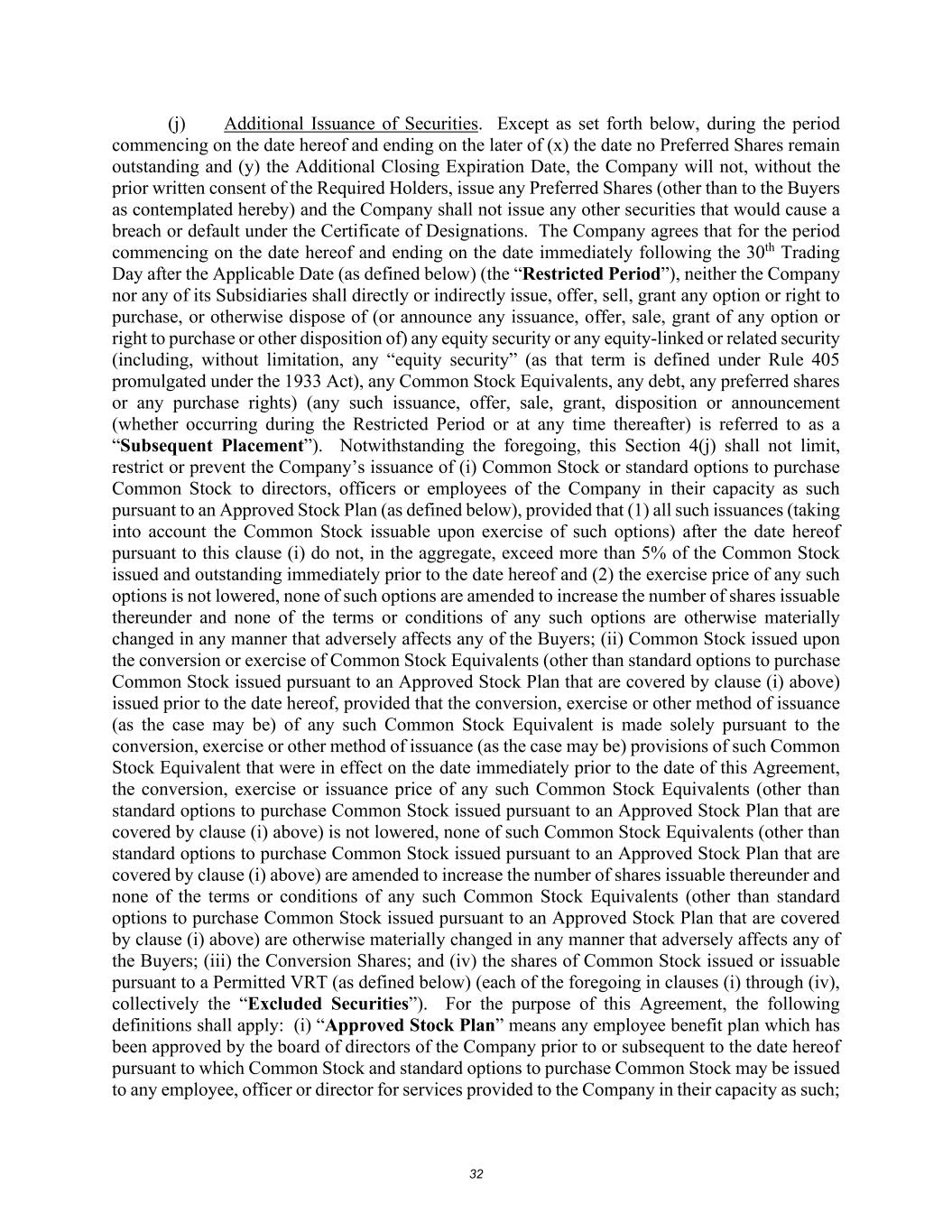 32 (j) Additional Issuance of Securities. Except as set forth below, during the period commencing on the date hereof and ending on the later of (x) the date no Preferred Shares remain outstanding and (y) the Additional Closing Expiration Date, the Company will not, without the prior written consent of the Required Holders, issue any Preferred Shares (other than to the Buyers as contemplated hereby) and the Company shall not issue any other securities that would cause a breach or default under the Certificate of Designations. The Company agrees that for the period commencing on the date hereof and ending on the date immediately following the 30th Trading Day after the Applicable Date (as defined below) (the “Restricted Period”), neither the Company nor any of its Subsidiaries shall directly or indirectly issue, offer, sell, grant any option or right to purchase, or otherwise dispose of (or announce any issuance, offer, sale, grant of any option or right to purchase or other disposition of) any equity security or any equity-linked or related security (including, without limitation, any “equity security” (as that term is defined under Rule 405 promulgated under the 1933 Act), any Common Stock Equivalents, any debt, any preferred shares or any purchase rights) (any such issuance, offer, sale, grant, disposition or announcement (whether occurring during the Restricted Period or at any time thereafter) is referred to as a “Subsequent Placement”). Notwithstanding the foregoing, this Section 4(j) shall not limit, restrict or prevent the Company’s issuance of (i) Common Stock or standard options to purchase Common Stock to directors, officers or employees of the Company in their capacity as such pursuant to an Approved Stock Plan (as defined below), provided that (1) all such issuances (taking into account the Common Stock issuable upon exercise of such options) after the date hereof pursuant to this clause (i) do not, in the aggregate, exceed more than 5% of the Common Stock issued and outstanding immediately prior to the date hereof and (2) the exercise price of any such options is not lowered, none of such options are amended to increase the number of shares issuable thereunder and none of the terms or conditions of any such options are otherwise materially changed in any manner that adversely affects any of the Buyers; (ii) Common Stock issued upon the conversion or exercise of Common Stock Equivalents (other than standard options to purchase Common Stock issued pursuant to an Approved Stock Plan that are covered by clause (i) above) issued prior to the date hereof, provided that the conversion, exercise or other method of issuance (as the case may be) of any such Common Stock Equivalent is made solely pursuant to the conversion, exercise or other method of issuance (as the case may be) provisions of such Common Stock Equivalent that were in effect on the date immediately prior to the date of this Agreement, the conversion, exercise or issuance price of any such Common Stock Equivalents (other than standard options to purchase Common Stock issued pursuant to an Approved Stock Plan that are covered by clause (i) above) is not lowered, none of such Common Stock Equivalents (other than standard options to purchase Common Stock issued pursuant to an Approved Stock Plan that are covered by clause (i) above) are amended to increase the number of shares issuable thereunder and none of the terms or conditions of any such Common Stock Equivalents (other than standard options to purchase Common Stock issued pursuant to an Approved Stock Plan that are covered by clause (i) above) are otherwise materially changed in any manner that adversely affects any of the Buyers; (iii) the Conversion Shares; and (iv) the shares of Common Stock issued or issuable pursuant to a Permitted VRT (as defined below) (each of the foregoing in clauses (i) through (iv), collectively the “Excluded Securities”). For the purpose of this Agreement, the following definitions shall apply: (i) “Approved Stock Plan” means any employee benefit plan which has been approved by the board of directors of the Company prior to or subsequent to the date hereof pursuant to which Common Stock and standard options to purchase Common Stock may be issued to any employee, officer or director for services provided to the Company in their capacity as such;