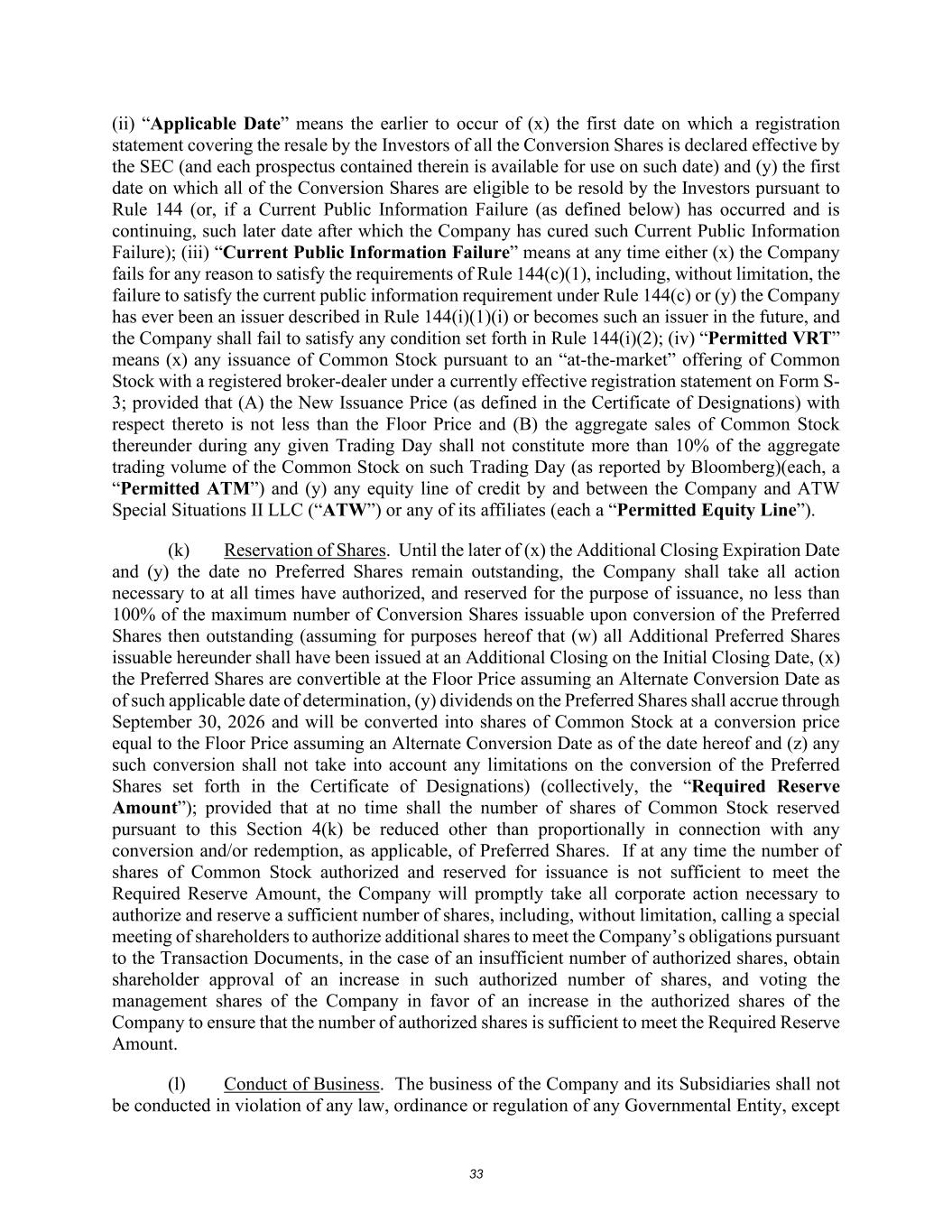33 (ii) “Applicable Date” means the earlier to occur of (x) the first date on which a registration statement covering the resale by the Investors of all the Conversion Shares is declared effective by the SEC (and each prospectus contained therein is available for use on such date) and (y) the first date on which all of the Conversion Shares are eligible to be resold by the Investors pursuant to Rule 144 (or, if a Current Public Information Failure (as defined below) has occurred and is continuing, such later date after which the Company has cured such Current Public Information Failure); (iii) “Current Public Information Failure” means at any time either (x) the Company fails for any reason to satisfy the requirements of Rule 144(c)(1), including, without limitation, the failure to satisfy the current public information requirement under Rule 144(c) or (y) the Company has ever been an issuer described in Rule 144(i)(1)(i) or becomes such an issuer in the future, and the Company shall fail to satisfy any condition set forth in Rule 144(i)(2); (iv) “Permitted VRT” means (x) any issuance of Common Stock pursuant to an “at-the-market” offering of Common Stock with a registered broker-dealer under a currently effective registration statement on Form S- 3; provided that (A) the New Issuance Price (as defined in the Certificate of Designations) with respect thereto is not less than the Floor Price and (B) the aggregate sales of Common Stock thereunder during any given Trading Day shall not constitute more than 10% of the aggregate trading volume of the Common Stock on such Trading Day (as reported by Bloomberg)(each, a “Permitted ATM”) and (y) any equity line of credit by and between the Company and ATW Special Situations II LLC (“ATW”) or any of its affiliates (each a “Permitted Equity Line”). (k) Reservation of Shares. Until the later of (x) the Additional Closing Expiration Date and (y) the date no Preferred Shares remain outstanding, the Company shall take all action necessary to at all times have authorized, and reserved for the purpose of issuance, no less than 100% of the maximum number of Conversion Shares issuable upon conversion of the Preferred Shares then outstanding (assuming for purposes hereof that (w) all Additional Preferred Shares issuable hereunder shall have been issued at an Additional Closing on the Initial Closing Date, (x) the Preferred Shares are convertible at the Floor Price assuming an Alternate Conversion Date as of such applicable date of determination, (y) dividends on the Preferred Shares shall accrue through September 30, 2026 and will be converted into shares of Common Stock at a conversion price equal to the Floor Price assuming an Alternate Conversion Date as of the date hereof and (z) any such conversion shall not take into account any limitations on the conversion of the Preferred Shares set forth in the Certificate of Designations) (collectively, the “Required Reserve Amount”); provided that at no time shall the number of shares of Common Stock reserved pursuant to this Section 4(k) be reduced other than proportionally in connection with any conversion and/or redemption, as applicable, of Preferred Shares. If at any time the number of shares of Common Stock authorized and reserved for issuance is not sufficient to meet the Required Reserve Amount, the Company will promptly take all corporate action necessary to authorize and reserve a sufficient number of shares, including, without limitation, calling a special meeting of shareholders to authorize additional shares to meet the Company’s obligations pursuant to the Transaction Documents, in the case of an insufficient number of authorized shares, obtain shareholder approval of an increase in such authorized number of shares, and voting the management shares of the Company in favor of an increase in the authorized shares of the Company to ensure that the number of authorized shares is sufficient to meet the Required Reserve Amount. (l) Conduct of Business. The business of the Company and its Subsidiaries shall not be conducted in violation of any law, ordinance or regulation of any Governmental Entity, except