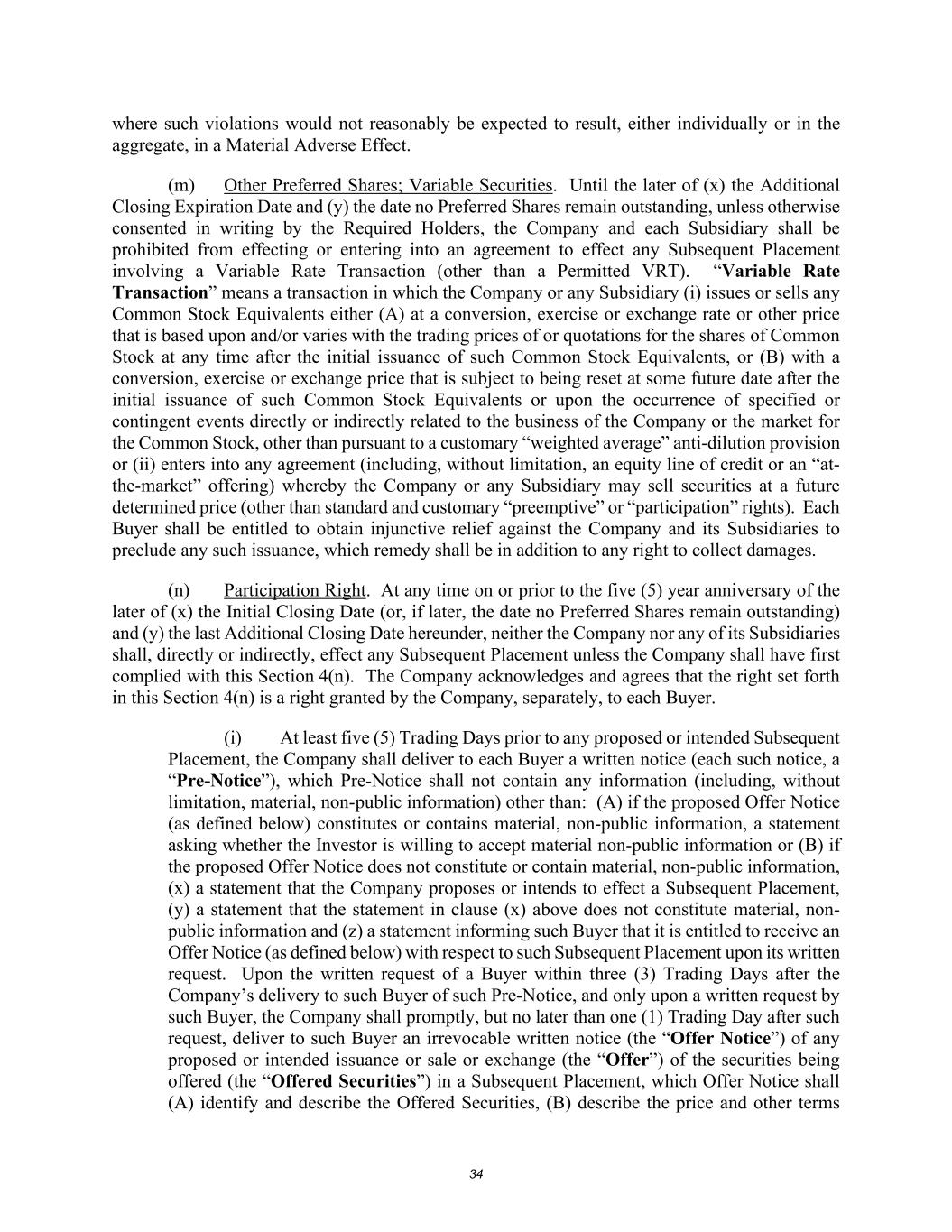 34 where such violations would not reasonably be expected to result, either individually or in the aggregate, in a Material Adverse Effect. (m) Other Preferred Shares; Variable Securities. Until the later of (x) the Additional Closing Expiration Date and (y) the date no Preferred Shares remain outstanding, unless otherwise consented in writing by the Required Holders, the Company and each Subsidiary shall be prohibited from effecting or entering into an agreement to effect any Subsequent Placement involving a Variable Rate Transaction (other than a Permitted VRT). “Variable Rate Transaction” means a transaction in which the Company or any Subsidiary (i) issues or sells any Common Stock Equivalents either (A) at a conversion, exercise or exchange rate or other price that is based upon and/or varies with the trading prices of or quotations for the shares of Common Stock at any time after the initial issuance of such Common Stock Equivalents, or (B) with a conversion, exercise or exchange price that is subject to being reset at some future date after the initial issuance of such Common Stock Equivalents or upon the occurrence of specified or contingent events directly or indirectly related to the business of the Company or the market for the Common Stock, other than pursuant to a customary “weighted average” anti-dilution provision or (ii) enters into any agreement (including, without limitation, an equity line of credit or an “at- the-market” offering) whereby the Company or any Subsidiary may sell securities at a future determined price (other than standard and customary “preemptive” or “participation” rights). Each Buyer shall be entitled to obtain injunctive relief against the Company and its Subsidiaries to preclude any such issuance, which remedy shall be in addition to any right to collect damages. (n) Participation Right. At any time on or prior to the five (5) year anniversary of the later of (x) the Initial Closing Date (or, if later, the date no Preferred Shares remain outstanding) and (y) the last Additional Closing Date hereunder, neither the Company nor any of its Subsidiaries shall, directly or indirectly, effect any Subsequent Placement unless the Company shall have first complied with this Section 4(n). The Company acknowledges and agrees that the right set forth in this Section 4(n) is a right granted by the Company, separately, to each Buyer. (i) At least five (5) Trading Days prior to any proposed or intended Subsequent Placement, the Company shall deliver to each Buyer a written notice (each such notice, a “Pre-Notice”), which Pre-Notice shall not contain any information (including, without limitation, material, non-public information) other than: (A) if the proposed Offer Notice (as defined below) constitutes or contains material, non-public information, a statement asking whether the Investor is willing to accept material non-public information or (B) if the proposed Offer Notice does not constitute or contain material, non-public information, (x) a statement that the Company proposes or intends to effect a Subsequent Placement, (y) a statement that the statement in clause (x) above does not constitute material, non- public information and (z) a statement informing such Buyer that it is entitled to receive an Offer Notice (as defined below) with respect to such Subsequent Placement upon its written request. Upon the written request of a Buyer within three (3) Trading Days after the Company’s delivery to such Buyer of such Pre-Notice, and only upon a written request by such Buyer, the Company shall promptly, but no later than one (1) Trading Day after such request, deliver to such Buyer an irrevocable written notice (the “Offer Notice”) of any proposed or intended issuance or sale or exchange (the “Offer”) of the securities being offered (the “Offered Securities”) in a Subsequent Placement, which Offer Notice shall (A) identify and describe the Offered Securities, (B) describe the price and other terms
