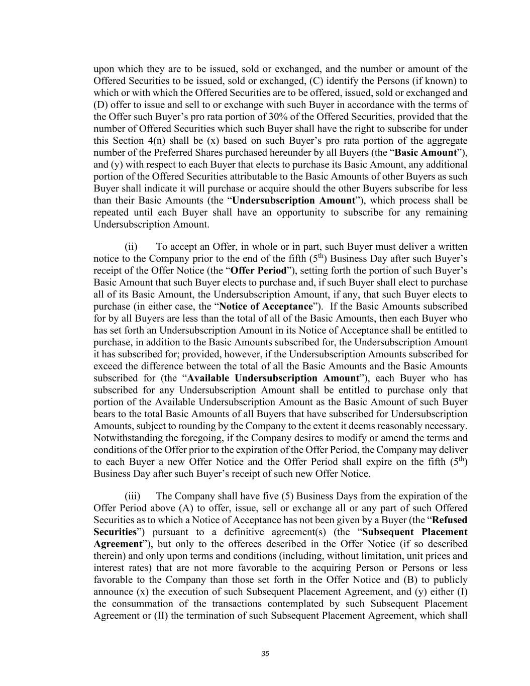 35 upon which they are to be issued, sold or exchanged, and the number or amount of the Offered Securities to be issued, sold or exchanged, (C) identify the Persons (if known) to which or with which the Offered Securities are to be offered, issued, sold or exchanged and (D) offer to issue and sell to or exchange with such Buyer in accordance with the terms of the Offer such Buyer’s pro rata portion of 30% of the Offered Securities, provided that the number of Offered Securities which such Buyer shall have the right to subscribe for under this Section 4(n) shall be (x) based on such Buyer’s pro rata portion of the aggregate number of the Preferred Shares purchased hereunder by all Buyers (the “Basic Amount”), and (y) with respect to each Buyer that elects to purchase its Basic Amount, any additional portion of the Offered Securities attributable to the Basic Amounts of other Buyers as such Buyer shall indicate it will purchase or acquire should the other Buyers subscribe for less than their Basic Amounts (the “Undersubscription Amount”), which process shall be repeated until each Buyer shall have an opportunity to subscribe for any remaining Undersubscription Amount. (ii) To accept an Offer, in whole or in part, such Buyer must deliver a written notice to the Company prior to the end of the fifth (5th) Business Day after such Buyer’s receipt of the Offer Notice (the “Offer Period”), setting forth the portion of such Buyer’s Basic Amount that such Buyer elects to purchase and, if such Buyer shall elect to purchase all of its Basic Amount, the Undersubscription Amount, if any, that such Buyer elects to purchase (in either case, the “Notice of Acceptance”). If the Basic Amounts subscribed for by all Buyers are less than the total of all of the Basic Amounts, then each Buyer who has set forth an Undersubscription Amount in its Notice of Acceptance shall be entitled to purchase, in addition to the Basic Amounts subscribed for, the Undersubscription Amount it has subscribed for; provided, however, if the Undersubscription Amounts subscribed for exceed the difference between the total of all the Basic Amounts and the Basic Amounts subscribed for (the “Available Undersubscription Amount”), each Buyer who has subscribed for any Undersubscription Amount shall be entitled to purchase only that portion of the Available Undersubscription Amount as the Basic Amount of such Buyer bears to the total Basic Amounts of all Buyers that have subscribed for Undersubscription Amounts, subject to rounding by the Company to the extent it deems reasonably necessary. Notwithstanding the foregoing, if the Company desires to modify or amend the terms and conditions of the Offer prior to the expiration of the Offer Period, the Company may deliver to each Buyer a new Offer Notice and the Offer Period shall expire on the fifth (5th) Business Day after such Buyer’s receipt of such new Offer Notice. (iii) The Company shall have five (5) Business Days from the expiration of the Offer Period above (A) to offer, issue, sell or exchange all or any part of such Offered Securities as to which a Notice of Acceptance has not been given by a Buyer (the “Refused Securities”) pursuant to a definitive agreement(s) (the “Subsequent Placement Agreement”), but only to the offerees described in the Offer Notice (if so described therein) and only upon terms and conditions (including, without limitation, unit prices and interest rates) that are not more favorable to the acquiring Person or Persons or less favorable to the Company than those set forth in the Offer Notice and (B) to publicly announce (x) the execution of such Subsequent Placement Agreement, and (y) either (I) the consummation of the transactions contemplated by such Subsequent Placement Agreement or (II) the termination of such Subsequent Placement Agreement, which shall