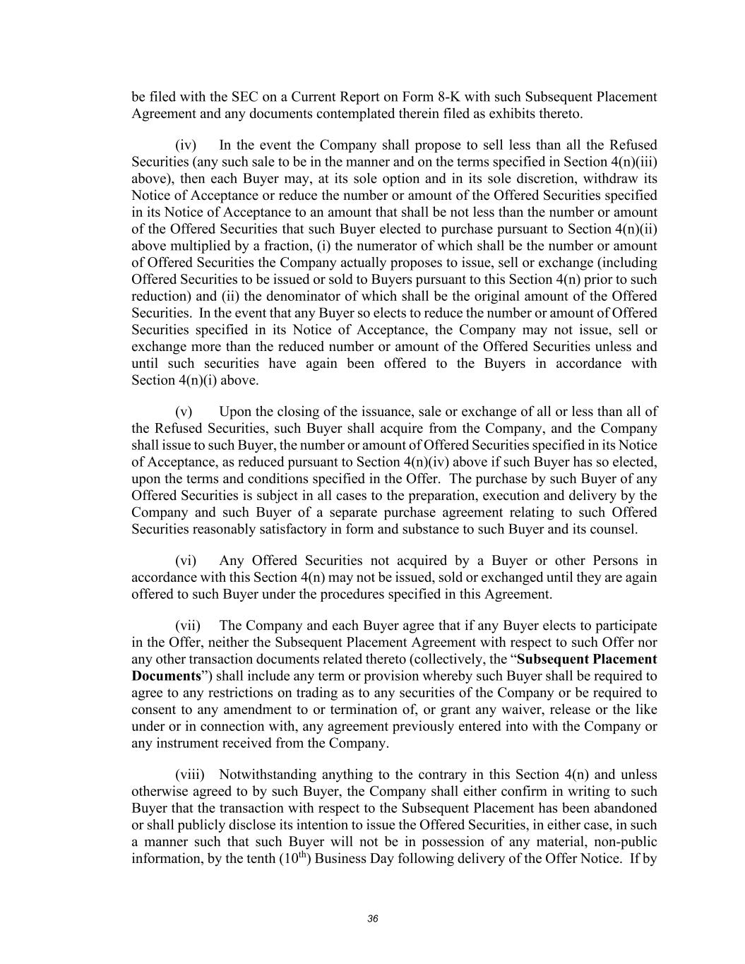 36 be filed with the SEC on a Current Report on Form 8-K with such Subsequent Placement Agreement and any documents contemplated therein filed as exhibits thereto. (iv) In the event the Company shall propose to sell less than all the Refused Securities (any such sale to be in the manner and on the terms specified in Section 4(n)(iii) above), then each Buyer may, at its sole option and in its sole discretion, withdraw its Notice of Acceptance or reduce the number or amount of the Offered Securities specified in its Notice of Acceptance to an amount that shall be not less than the number or amount of the Offered Securities that such Buyer elected to purchase pursuant to Section 4(n)(ii) above multiplied by a fraction, (i) the numerator of which shall be the number or amount of Offered Securities the Company actually proposes to issue, sell or exchange (including Offered Securities to be issued or sold to Buyers pursuant to this Section 4(n) prior to such reduction) and (ii) the denominator of which shall be the original amount of the Offered Securities. In the event that any Buyer so elects to reduce the number or amount of Offered Securities specified in its Notice of Acceptance, the Company may not issue, sell or exchange more than the reduced number or amount of the Offered Securities unless and until such securities have again been offered to the Buyers in accordance with Section 4(n)(i) above. (v) Upon the closing of the issuance, sale or exchange of all or less than all of the Refused Securities, such Buyer shall acquire from the Company, and the Company shall issue to such Buyer, the number or amount of Offered Securities specified in its Notice of Acceptance, as reduced pursuant to Section 4(n)(iv) above if such Buyer has so elected, upon the terms and conditions specified in the Offer. The purchase by such Buyer of any Offered Securities is subject in all cases to the preparation, execution and delivery by the Company and such Buyer of a separate purchase agreement relating to such Offered Securities reasonably satisfactory in form and substance to such Buyer and its counsel. (vi) Any Offered Securities not acquired by a Buyer or other Persons in accordance with this Section 4(n) may not be issued, sold or exchanged until they are again offered to such Buyer under the procedures specified in this Agreement. (vii) The Company and each Buyer agree that if any Buyer elects to participate in the Offer, neither the Subsequent Placement Agreement with respect to such Offer nor any other transaction documents related thereto (collectively, the “Subsequent Placement Documents”) shall include any term or provision whereby such Buyer shall be required to agree to any restrictions on trading as to any securities of the Company or be required to consent to any amendment to or termination of, or grant any waiver, release or the like under or in connection with, any agreement previously entered into with the Company or any instrument received from the Company. (viii) Notwithstanding anything to the contrary in this Section 4(n) and unless otherwise agreed to by such Buyer, the Company shall either confirm in writing to such Buyer that the transaction with respect to the Subsequent Placement has been abandoned or shall publicly disclose its intention to issue the Offered Securities, in either case, in such a manner such that such Buyer will not be in possession of any material, non-public information, by the tenth (10th) Business Day following delivery of the Offer Notice. If by