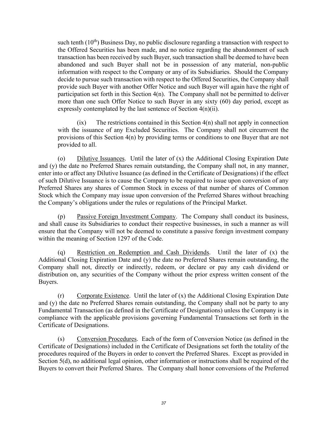 37 such tenth (10th) Business Day, no public disclosure regarding a transaction with respect to the Offered Securities has been made, and no notice regarding the abandonment of such transaction has been received by such Buyer, such transaction shall be deemed to have been abandoned and such Buyer shall not be in possession of any material, non-public information with respect to the Company or any of its Subsidiaries. Should the Company decide to pursue such transaction with respect to the Offered Securities, the Company shall provide such Buyer with another Offer Notice and such Buyer will again have the right of participation set forth in this Section 4(n). The Company shall not be permitted to deliver more than one such Offer Notice to such Buyer in any sixty (60) day period, except as expressly contemplated by the last sentence of Section 4(n)(ii). (ix) The restrictions contained in this Section 4(n) shall not apply in connection with the issuance of any Excluded Securities. The Company shall not circumvent the provisions of this Section 4(n) by providing terms or conditions to one Buyer that are not provided to all. (o) Dilutive Issuances. Until the later of (x) the Additional Closing Expiration Date and (y) the date no Preferred Shares remain outstanding, the Company shall not, in any manner, enter into or affect any Dilutive Issuance (as defined in the Certificate of Designations) if the effect of such Dilutive Issuance is to cause the Company to be required to issue upon conversion of any Preferred Shares any shares of Common Stock in excess of that number of shares of Common Stock which the Company may issue upon conversion of the Preferred Shares without breaching the Company’s obligations under the rules or regulations of the Principal Market. (p) Passive Foreign Investment Company. The Company shall conduct its business, and shall cause its Subsidiaries to conduct their respective businesses, in such a manner as will ensure that the Company will not be deemed to constitute a passive foreign investment company within the meaning of Section 1297 of the Code. (q) Restriction on Redemption and Cash Dividends. Until the later of (x) the Additional Closing Expiration Date and (y) the date no Preferred Shares remain outstanding, the Company shall not, directly or indirectly, redeem, or declare or pay any cash dividend or distribution on, any securities of the Company without the prior express written consent of the Buyers. (r) Corporate Existence. Until the later of (x) the Additional Closing Expiration Date and (y) the date no Preferred Shares remain outstanding, the Company shall not be party to any Fundamental Transaction (as defined in the Certificate of Designations) unless the Company is in compliance with the applicable provisions governing Fundamental Transactions set forth in the Certificate of Designations. (s) Conversion Procedures. Each of the form of Conversion Notice (as defined in the Certificate of Designations) included in the Certificate of Designations set forth the totality of the procedures required of the Buyers in order to convert the Preferred Shares. Except as provided in Section 5(d), no additional legal opinion, other information or instructions shall be required of the Buyers to convert their Preferred Shares. The Company shall honor conversions of the Preferred