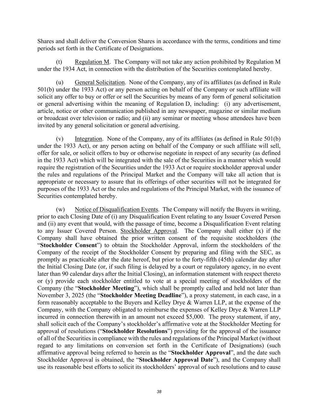 38 Shares and shall deliver the Conversion Shares in accordance with the terms, conditions and time periods set forth in the Certificate of Designations. (t) Regulation M. The Company will not take any action prohibited by Regulation M under the 1934 Act, in connection with the distribution of the Securities contemplated hereby. (u) General Solicitation. None of the Company, any of its affiliates (as defined in Rule 501(b) under the 1933 Act) or any person acting on behalf of the Company or such affiliate will solicit any offer to buy or offer or sell the Securities by means of any form of general solicitation or general advertising within the meaning of Regulation D, including: (i) any advertisement, article, notice or other communication published in any newspaper, magazine or similar medium or broadcast over television or radio; and (ii) any seminar or meeting whose attendees have been invited by any general solicitation or general advertising. (v) Integration. None of the Company, any of its affiliates (as defined in Rule 501(b) under the 1933 Act), or any person acting on behalf of the Company or such affiliate will sell, offer for sale, or solicit offers to buy or otherwise negotiate in respect of any security (as defined in the 1933 Act) which will be integrated with the sale of the Securities in a manner which would require the registration of the Securities under the 1933 Act or require stockholder approval under the rules and regulations of the Principal Market and the Company will take all action that is appropriate or necessary to assure that its offerings of other securities will not be integrated for purposes of the 1933 Act or the rules and regulations of the Principal Market, with the issuance of Securities contemplated hereby. (w) Notice of Disqualification Events. The Company will notify the Buyers in writing, prior to each Closing Date of (i) any Disqualification Event relating to any Issuer Covered Person and (ii) any event that would, with the passage of time, become a Disqualification Event relating to any Issuer Covered Person. Stockholder Approval. The Company shall either (x) if the Company shall have obtained the prior written consent of the requisite stockholders (the “Stockholder Consent”) to obtain the Stockholder Approval, inform the stockholders of the Company of the receipt of the Stockholder Consent by preparing and filing with the SEC, as promptly as practicable after the date hereof, but prior to the forty-fifth (45th) calendar day after the Initial Closing Date (or, if such filing is delayed by a court or regulatory agency, in no event later than 90 calendar days after the Initial Closing), an information statement with respect thereto or (y) provide each stockholder entitled to vote at a special meeting of stockholders of the Company (the “Stockholder Meeting”), which shall be promptly called and held not later than November 3, 2025 (the “Stockholder Meeting Deadline”), a proxy statement, in each case, in a form reasonably acceptable to the Buyers and Kelley Drye & Warren LLP, at the expense of the Company, with the Company obligated to reimburse the expenses of Kelley Drye & Warren LLP incurred in connection therewith in an amount not exceed $5,000. The proxy statement, if any, shall solicit each of the Company’s stockholder’s affirmative vote at the Stockholder Meeting for approval of resolutions (“Stockholder Resolutions”) providing for the approval of the issuance of all of the Securities in compliance with the rules and regulations of the Principal Market (without regard to any limitations on conversion set forth in the Certificate of Designations) (such affirmative approval being referred to herein as the “Stockholder Approval”, and the date such Stockholder Approval is obtained, the “Stockholder Approval Date”), and the Company shall use its reasonable best efforts to solicit its stockholders’ approval of such resolutions and to cause