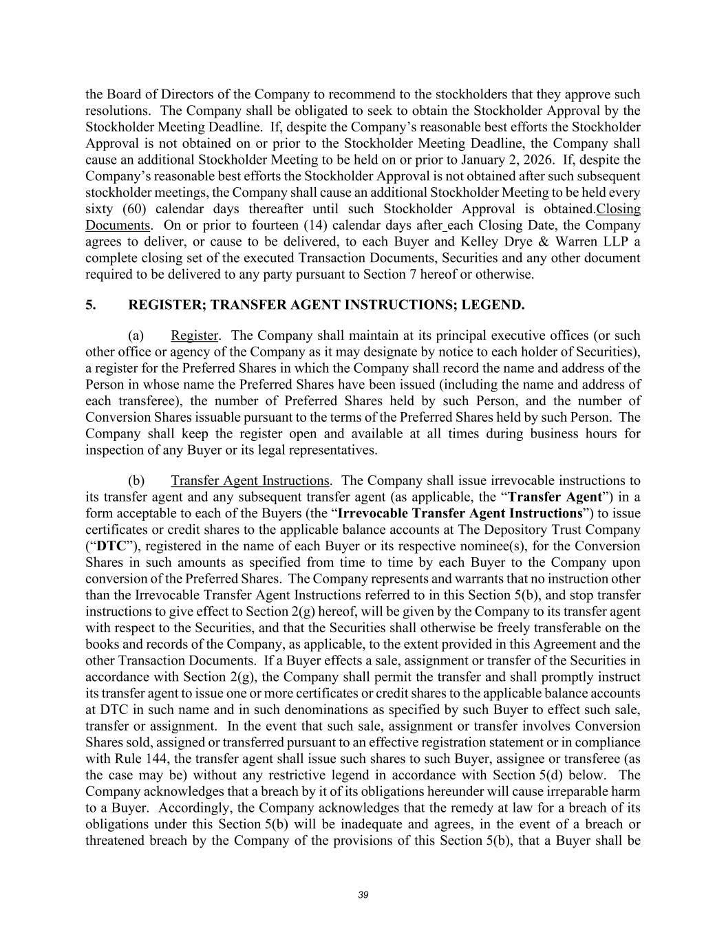 39 the Board of Directors of the Company to recommend to the stockholders that they approve such resolutions. The Company shall be obligated to seek to obtain the Stockholder Approval by the Stockholder Meeting Deadline. If, despite the Company’s reasonable best efforts the Stockholder Approval is not obtained on or prior to the Stockholder Meeting Deadline, the Company shall cause an additional Stockholder Meeting to be held on or prior to January 2, 2026. If, despite the Company’s reasonable best efforts the Stockholder Approval is not obtained after such subsequent stockholder meetings, the Company shall cause an additional Stockholder Meeting to be held every sixty (60) calendar days thereafter until such Stockholder Approval is obtained.Closing Documents. On or prior to fourteen (14) calendar days after each Closing Date, the Company agrees to deliver, or cause to be delivered, to each Buyer and Kelley Drye & Warren LLP a complete closing set of the executed Transaction Documents, Securities and any other document required to be delivered to any party pursuant to Section 7 hereof or otherwise. 5. REGISTER; TRANSFER AGENT INSTRUCTIONS; LEGEND. (a) Register. The Company shall maintain at its principal executive offices (or such other office or agency of the Company as it may designate by notice to each holder of Securities), a register for the Preferred Shares in which the Company shall record the name and address of the Person in whose name the Preferred Shares have been issued (including the name and address of each transferee), the number of Preferred Shares held by such Person, and the number of Conversion Shares issuable pursuant to the terms of the Preferred Shares held by such Person. The Company shall keep the register open and available at all times during business hours for inspection of any Buyer or its legal representatives. (b) Transfer Agent Instructions. The Company shall issue irrevocable instructions to its transfer agent and any subsequent transfer agent (as applicable, the “Transfer Agent”) in a form acceptable to each of the Buyers (the “Irrevocable Transfer Agent Instructions”) to issue certificates or credit shares to the applicable balance accounts at The Depository Trust Company (“DTC”), registered in the name of each Buyer or its respective nominee(s), for the Conversion Shares in such amounts as specified from time to time by each Buyer to the Company upon conversion of the Preferred Shares. The Company represents and warrants that no instruction other than the Irrevocable Transfer Agent Instructions referred to in this Section 5(b), and stop transfer instructions to give effect to Section 2(g) hereof, will be given by the Company to its transfer agent with respect to the Securities, and that the Securities shall otherwise be freely transferable on the books and records of the Company, as applicable, to the extent provided in this Agreement and the other Transaction Documents. If a Buyer effects a sale, assignment or transfer of the Securities in accordance with Section 2(g), the Company shall permit the transfer and shall promptly instruct its transfer agent to issue one or more certificates or credit shares to the applicable balance accounts at DTC in such name and in such denominations as specified by such Buyer to effect such sale, transfer or assignment. In the event that such sale, assignment or transfer involves Conversion Shares sold, assigned or transferred pursuant to an effective registration statement or in compliance with Rule 144, the transfer agent shall issue such shares to such Buyer, assignee or transferee (as the case may be) without any restrictive legend in accordance with Section 5(d) below. The Company acknowledges that a breach by it of its obligations hereunder will cause irreparable harm to a Buyer. Accordingly, the Company acknowledges that the remedy at law for a breach of its obligations under this Section 5(b) will be inadequate and agrees, in the event of a breach or threatened breach by the Company of the provisions of this Section 5(b), that a Buyer shall be