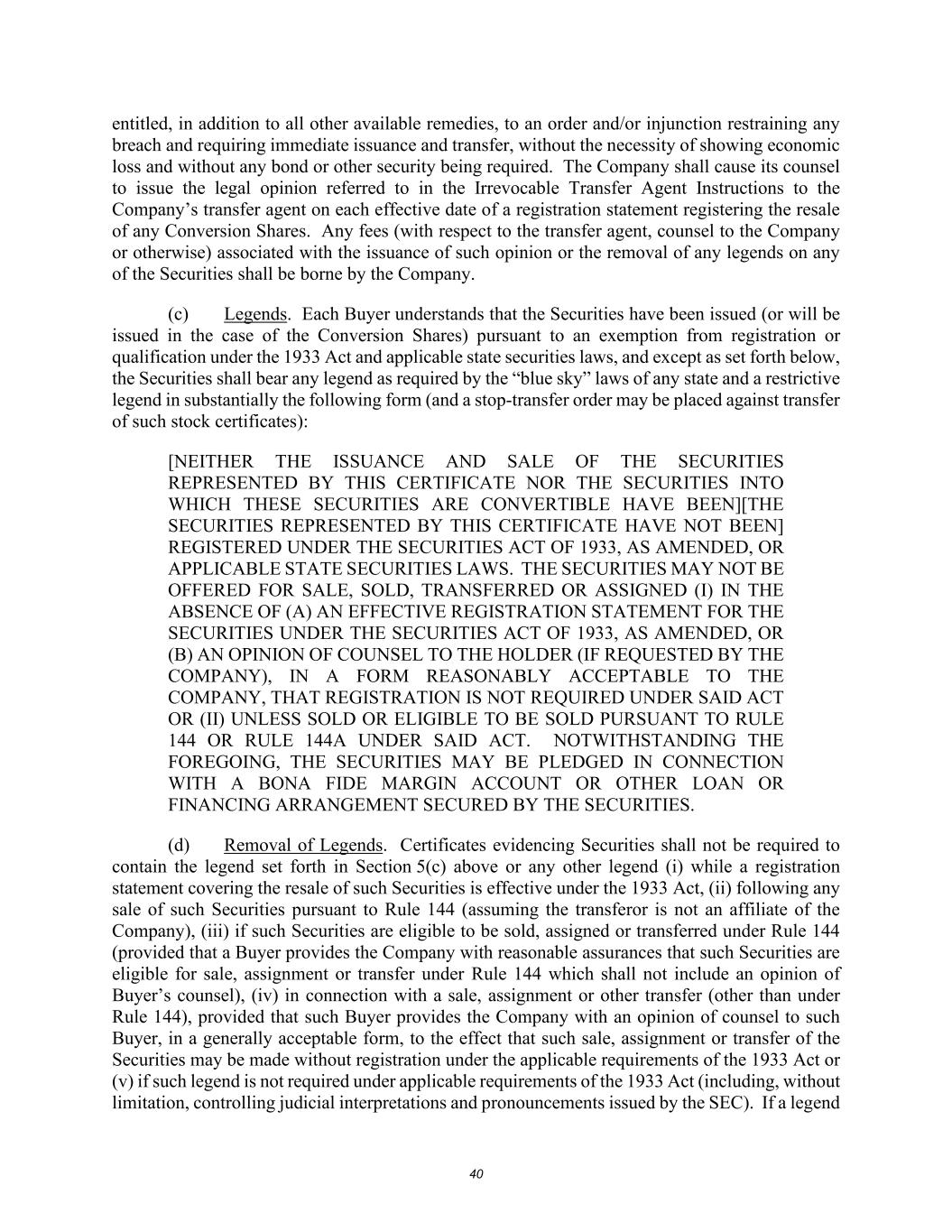 40 entitled, in addition to all other available remedies, to an order and/or injunction restraining any breach and requiring immediate issuance and transfer, without the necessity of showing economic loss and without any bond or other security being required. The Company shall cause its counsel to issue the legal opinion referred to in the Irrevocable Transfer Agent Instructions to the Company’s transfer agent on each effective date of a registration statement registering the resale of any Conversion Shares. Any fees (with respect to the transfer agent, counsel to the Company or otherwise) associated with the issuance of such opinion or the removal of any legends on any of the Securities shall be borne by the Company. (c) Legends. Each Buyer understands that the Securities have been issued (or will be issued in the case of the Conversion Shares) pursuant to an exemption from registration or qualification under the 1933 Act and applicable state securities laws, and except as set forth below, the Securities shall bear any legend as required by the “blue sky” laws of any state and a restrictive legend in substantially the following form (and a stop-transfer order may be placed against transfer of such stock certificates): [NEITHER THE ISSUANCE AND SALE OF THE SECURITIES REPRESENTED BY THIS CERTIFICATE NOR THE SECURITIES INTO WHICH THESE SECURITIES ARE CONVERTIBLE HAVE BEEN][THE SECURITIES REPRESENTED BY THIS CERTIFICATE HAVE NOT BEEN] REGISTERED UNDER THE SECURITIES ACT OF 1933, AS AMENDED, OR APPLICABLE STATE SECURITIES LAWS. THE SECURITIES MAY NOT BE OFFERED FOR SALE, SOLD, TRANSFERRED OR ASSIGNED (I) IN THE ABSENCE OF (A) AN EFFECTIVE REGISTRATION STATEMENT FOR THE SECURITIES UNDER THE SECURITIES ACT OF 1933, AS AMENDED, OR (B) AN OPINION OF COUNSEL TO THE HOLDER (IF REQUESTED BY THE COMPANY), IN A FORM REASONABLY ACCEPTABLE TO THE COMPANY, THAT REGISTRATION IS NOT REQUIRED UNDER SAID ACT OR (II) UNLESS SOLD OR ELIGIBLE TO BE SOLD PURSUANT TO RULE 144 OR RULE 144A UNDER SAID ACT. NOTWITHSTANDING THE FOREGOING, THE SECURITIES MAY BE PLEDGED IN CONNECTION WITH A BONA FIDE MARGIN ACCOUNT OR OTHER LOAN OR FINANCING ARRANGEMENT SECURED BY THE SECURITIES. (d) Removal of Legends. Certificates evidencing Securities shall not be required to contain the legend set forth in Section 5(c) above or any other legend (i) while a registration statement covering the resale of such Securities is effective under the 1933 Act, (ii) following any sale of such Securities pursuant to Rule 144 (assuming the transferor is not an affiliate of the Company), (iii) if such Securities are eligible to be sold, assigned or transferred under Rule 144 (provided that a Buyer provides the Company with reasonable assurances that such Securities are eligible for sale, assignment or transfer under Rule 144 which shall not include an opinion of Buyer’s counsel), (iv) in connection with a sale, assignment or other transfer (other than under Rule 144), provided that such Buyer provides the Company with an opinion of counsel to such Buyer, in a generally acceptable form, to the effect that such sale, assignment or transfer of the Securities may be made without registration under the applicable requirements of the 1933 Act or (v) if such legend is not required under applicable requirements of the 1933 Act (including, without limitation, controlling judicial interpretations and pronouncements issued by the SEC). If a legend