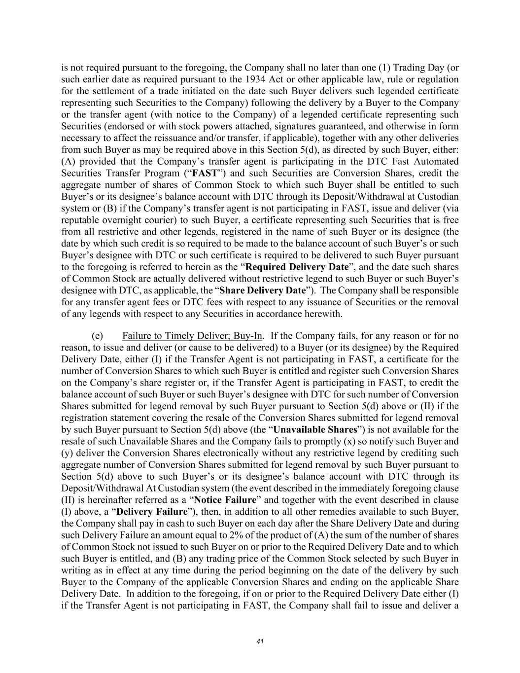 41 is not required pursuant to the foregoing, the Company shall no later than one (1) Trading Day (or such earlier date as required pursuant to the 1934 Act or other applicable law, rule or regulation for the settlement of a trade initiated on the date such Buyer delivers such legended certificate representing such Securities to the Company) following the delivery by a Buyer to the Company or the transfer agent (with notice to the Company) of a legended certificate representing such Securities (endorsed or with stock powers attached, signatures guaranteed, and otherwise in form necessary to affect the reissuance and/or transfer, if applicable), together with any other deliveries from such Buyer as may be required above in this Section 5(d), as directed by such Buyer, either: (A) provided that the Company’s transfer agent is participating in the DTC Fast Automated Securities Transfer Program (“FAST”) and such Securities are Conversion Shares, credit the aggregate number of shares of Common Stock to which such Buyer shall be entitled to such Buyer’s or its designee’s balance account with DTC through its Deposit/Withdrawal at Custodian system or (B) if the Company’s transfer agent is not participating in FAST, issue and deliver (via reputable overnight courier) to such Buyer, a certificate representing such Securities that is free from all restrictive and other legends, registered in the name of such Buyer or its designee (the date by which such credit is so required to be made to the balance account of such Buyer’s or such Buyer’s designee with DTC or such certificate is required to be delivered to such Buyer pursuant to the foregoing is referred to herein as the “Required Delivery Date”, and the date such shares of Common Stock are actually delivered without restrictive legend to such Buyer or such Buyer’s designee with DTC, as applicable, the “Share Delivery Date”). The Company shall be responsible for any transfer agent fees or DTC fees with respect to any issuance of Securities or the removal of any legends with respect to any Securities in accordance herewith. (e) Failure to Timely Deliver; Buy-In. If the Company fails, for any reason or for no reason, to issue and deliver (or cause to be delivered) to a Buyer (or its designee) by the Required Delivery Date, either (I) if the Transfer Agent is not participating in FAST, a certificate for the number of Conversion Shares to which such Buyer is entitled and register such Conversion Shares on the Company’s share register or, if the Transfer Agent is participating in FAST, to credit the balance account of such Buyer or such Buyer’s designee with DTC for such number of Conversion Shares submitted for legend removal by such Buyer pursuant to Section 5(d) above or (II) if the registration statement covering the resale of the Conversion Shares submitted for legend removal by such Buyer pursuant to Section 5(d) above (the “Unavailable Shares”) is not available for the resale of such Unavailable Shares and the Company fails to promptly (x) so notify such Buyer and (y) deliver the Conversion Shares electronically without any restrictive legend by crediting such aggregate number of Conversion Shares submitted for legend removal by such Buyer pursuant to Section 5(d) above to such Buyer’s or its designee’s balance account with DTC through its Deposit/Withdrawal At Custodian system (the event described in the immediately foregoing clause (II) is hereinafter referred as a “Notice Failure” and together with the event described in clause (I) above, a “Delivery Failure”), then, in addition to all other remedies available to such Buyer, the Company shall pay in cash to such Buyer on each day after the Share Delivery Date and during such Delivery Failure an amount equal to 2% of the product of (A) the sum of the number of shares of Common Stock not issued to such Buyer on or prior to the Required Delivery Date and to which such Buyer is entitled, and (B) any trading price of the Common Stock selected by such Buyer in writing as in effect at any time during the period beginning on the date of the delivery by such Buyer to the Company of the applicable Conversion Shares and ending on the applicable Share Delivery Date. In addition to the foregoing, if on or prior to the Required Delivery Date either (I) if the Transfer Agent is not participating in FAST, the Company shall fail to issue and deliver a