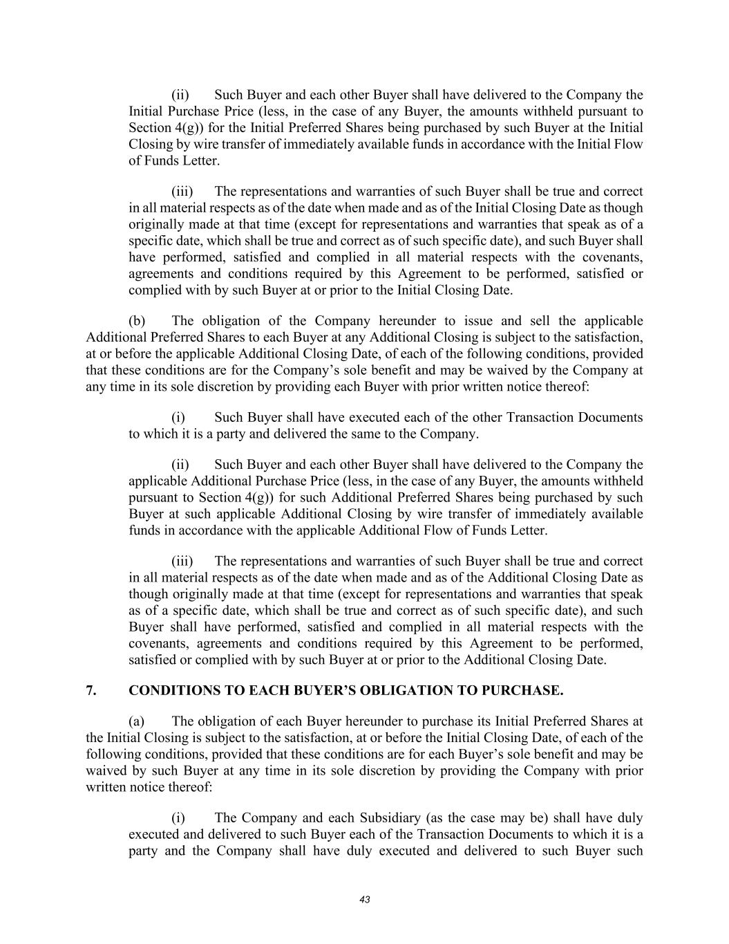 43 (ii) Such Buyer and each other Buyer shall have delivered to the Company the Initial Purchase Price (less, in the case of any Buyer, the amounts withheld pursuant to Section 4(g)) for the Initial Preferred Shares being purchased by such Buyer at the Initial Closing by wire transfer of immediately available funds in accordance with the Initial Flow of Funds Letter. (iii) The representations and warranties of such Buyer shall be true and correct in all material respects as of the date when made and as of the Initial Closing Date as though originally made at that time (except for representations and warranties that speak as of a specific date, which shall be true and correct as of such specific date), and such Buyer shall have performed, satisfied and complied in all material respects with the covenants, agreements and conditions required by this Agreement to be performed, satisfied or complied with by such Buyer at or prior to the Initial Closing Date. (b) The obligation of the Company hereunder to issue and sell the applicable Additional Preferred Shares to each Buyer at any Additional Closing is subject to the satisfaction, at or before the applicable Additional Closing Date, of each of the following conditions, provided that these conditions are for the Company’s sole benefit and may be waived by the Company at any time in its sole discretion by providing each Buyer with prior written notice thereof: (i) Such Buyer shall have executed each of the other Transaction Documents to which it is a party and delivered the same to the Company. (ii) Such Buyer and each other Buyer shall have delivered to the Company the applicable Additional Purchase Price (less, in the case of any Buyer, the amounts withheld pursuant to Section 4(g)) for such Additional Preferred Shares being purchased by such Buyer at such applicable Additional Closing by wire transfer of immediately available funds in accordance with the applicable Additional Flow of Funds Letter. (iii) The representations and warranties of such Buyer shall be true and correct in all material respects as of the date when made and as of the Additional Closing Date as though originally made at that time (except for representations and warranties that speak as of a specific date, which shall be true and correct as of such specific date), and such Buyer shall have performed, satisfied and complied in all material respects with the covenants, agreements and conditions required by this Agreement to be performed, satisfied or complied with by such Buyer at or prior to the Additional Closing Date. 7. CONDITIONS TO EACH BUYER’S OBLIGATION TO PURCHASE. (a) The obligation of each Buyer hereunder to purchase its Initial Preferred Shares at the Initial Closing is subject to the satisfaction, at or before the Initial Closing Date, of each of the following conditions, provided that these conditions are for each Buyer’s sole benefit and may be waived by such Buyer at any time in its sole discretion by providing the Company with prior written notice thereof: (i) The Company and each Subsidiary (as the case may be) shall have duly executed and delivered to such Buyer each of the Transaction Documents to which it is a party and the Company shall have duly executed and delivered to such Buyer such