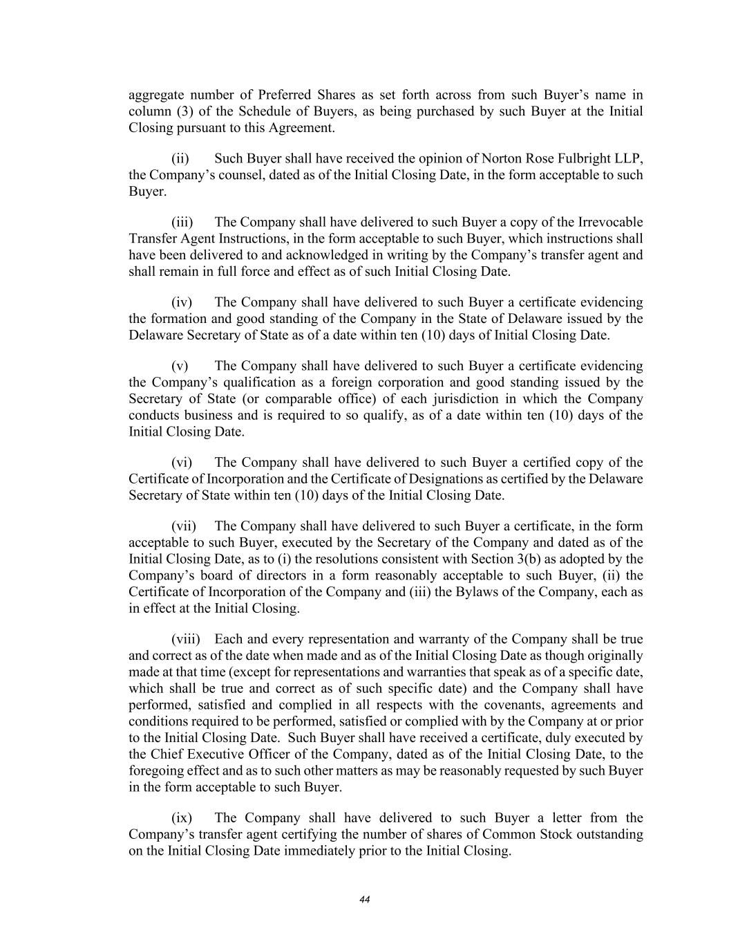 44 aggregate number of Preferred Shares as set forth across from such Buyer’s name in column (3) of the Schedule of Buyers, as being purchased by such Buyer at the Initial Closing pursuant to this Agreement. (ii) Such Buyer shall have received the opinion of Norton Rose Fulbright LLP, the Company’s counsel, dated as of the Initial Closing Date, in the form acceptable to such Buyer. (iii) The Company shall have delivered to such Buyer a copy of the Irrevocable Transfer Agent Instructions, in the form acceptable to such Buyer, which instructions shall have been delivered to and acknowledged in writing by the Company’s transfer agent and shall remain in full force and effect as of such Initial Closing Date. (iv) The Company shall have delivered to such Buyer a certificate evidencing the formation and good standing of the Company in the State of Delaware issued by the Delaware Secretary of State as of a date within ten (10) days of Initial Closing Date. (v) The Company shall have delivered to such Buyer a certificate evidencing the Company’s qualification as a foreign corporation and good standing issued by the Secretary of State (or comparable office) of each jurisdiction in which the Company conducts business and is required to so qualify, as of a date within ten (10) days of the Initial Closing Date. (vi) The Company shall have delivered to such Buyer a certified copy of the Certificate of Incorporation and the Certificate of Designations as certified by the Delaware Secretary of State within ten (10) days of the Initial Closing Date. (vii) The Company shall have delivered to such Buyer a certificate, in the form acceptable to such Buyer, executed by the Secretary of the Company and dated as of the Initial Closing Date, as to (i) the resolutions consistent with Section 3(b) as adopted by the Company’s board of directors in a form reasonably acceptable to such Buyer, (ii) the Certificate of Incorporation of the Company and (iii) the Bylaws of the Company, each as in effect at the Initial Closing. (viii) Each and every representation and warranty of the Company shall be true and correct as of the date when made and as of the Initial Closing Date as though originally made at that time (except for representations and warranties that speak as of a specific date, which shall be true and correct as of such specific date) and the Company shall have performed, satisfied and complied in all respects with the covenants, agreements and conditions required to be performed, satisfied or complied with by the Company at or prior to the Initial Closing Date. Such Buyer shall have received a certificate, duly executed by the Chief Executive Officer of the Company, dated as of the Initial Closing Date, to the foregoing effect and as to such other matters as may be reasonably requested by such Buyer in the form acceptable to such Buyer. (ix) The Company shall have delivered to such Buyer a letter from the Company’s transfer agent certifying the number of shares of Common Stock outstanding on the Initial Closing Date immediately prior to the Initial Closing.