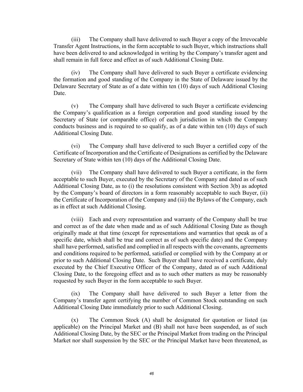 46 (iii) The Company shall have delivered to such Buyer a copy of the Irrevocable Transfer Agent Instructions, in the form acceptable to such Buyer, which instructions shall have been delivered to and acknowledged in writing by the Company’s transfer agent and shall remain in full force and effect as of such Additional Closing Date. (iv) The Company shall have delivered to such Buyer a certificate evidencing the formation and good standing of the Company in the State of Delaware issued by the Delaware Secretary of State as of a date within ten (10) days of such Additional Closing Date. (v) The Company shall have delivered to such Buyer a certificate evidencing the Company’s qualification as a foreign corporation and good standing issued by the Secretary of State (or comparable office) of each jurisdiction in which the Company conducts business and is required to so qualify, as of a date within ten (10) days of such Additional Closing Date. (vi) The Company shall have delivered to such Buyer a certified copy of the Certificate of Incorporation and the Certificate of Designations as certified by the Delaware Secretary of State within ten (10) days of the Additional Closing Date. (vii) The Company shall have delivered to such Buyer a certificate, in the form acceptable to such Buyer, executed by the Secretary of the Company and dated as of such Additional Closing Date, as to (i) the resolutions consistent with Section 3(b) as adopted by the Company’s board of directors in a form reasonably acceptable to such Buyer, (ii) the Certificate of Incorporation of the Company and (iii) the Bylaws of the Company, each as in effect at such Additional Closing. (viii) Each and every representation and warranty of the Company shall be true and correct as of the date when made and as of such Additional Closing Date as though originally made at that time (except for representations and warranties that speak as of a specific date, which shall be true and correct as of such specific date) and the Company shall have performed, satisfied and complied in all respects with the covenants, agreements and conditions required to be performed, satisfied or complied with by the Company at or prior to such Additional Closing Date. Such Buyer shall have received a certificate, duly executed by the Chief Executive Officer of the Company, dated as of such Additional Closing Date, to the foregoing effect and as to such other matters as may be reasonably requested by such Buyer in the form acceptable to such Buyer. (ix) The Company shall have delivered to such Buyer a letter from the Company’s transfer agent certifying the number of Common Stock outstanding on such Additional Closing Date immediately prior to such Additional Closing. (x) The Common Stock (A) shall be designated for quotation or listed (as applicable) on the Principal Market and (B) shall not have been suspended, as of such Additional Closing Date, by the SEC or the Principal Market from trading on the Principal Market nor shall suspension by the SEC or the Principal Market have been threatened, as