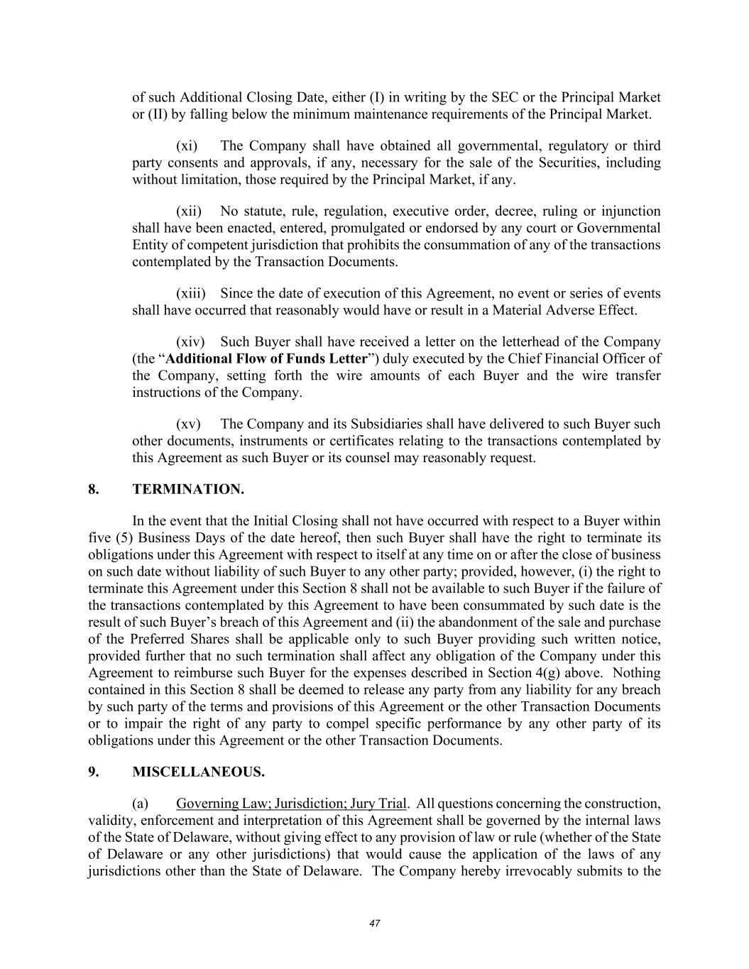 47 of such Additional Closing Date, either (I) in writing by the SEC or the Principal Market or (II) by falling below the minimum maintenance requirements of the Principal Market. (xi) The Company shall have obtained all governmental, regulatory or third party consents and approvals, if any, necessary for the sale of the Securities, including without limitation, those required by the Principal Market, if any. (xii) No statute, rule, regulation, executive order, decree, ruling or injunction shall have been enacted, entered, promulgated or endorsed by any court or Governmental Entity of competent jurisdiction that prohibits the consummation of any of the transactions contemplated by the Transaction Documents. (xiii) Since the date of execution of this Agreement, no event or series of events shall have occurred that reasonably would have or result in a Material Adverse Effect. (xiv) Such Buyer shall have received a letter on the letterhead of the Company (the “Additional Flow of Funds Letter”) duly executed by the Chief Financial Officer of the Company, setting forth the wire amounts of each Buyer and the wire transfer instructions of the Company. (xv) The Company and its Subsidiaries shall have delivered to such Buyer such other documents, instruments or certificates relating to the transactions contemplated by this Agreement as such Buyer or its counsel may reasonably request. 8. TERMINATION. In the event that the Initial Closing shall not have occurred with respect to a Buyer within five (5) Business Days of the date hereof, then such Buyer shall have the right to terminate its obligations under this Agreement with respect to itself at any time on or after the close of business on such date without liability of such Buyer to any other party; provided, however, (i) the right to terminate this Agreement under this Section 8 shall not be available to such Buyer if the failure of the transactions contemplated by this Agreement to have been consummated by such date is the result of such Buyer’s breach of this Agreement and (ii) the abandonment of the sale and purchase of the Preferred Shares shall be applicable only to such Buyer providing such written notice, provided further that no such termination shall affect any obligation of the Company under this Agreement to reimburse such Buyer for the expenses described in Section 4(g) above. Nothing contained in this Section 8 shall be deemed to release any party from any liability for any breach by such party of the terms and provisions of this Agreement or the other Transaction Documents or to impair the right of any party to compel specific performance by any other party of its obligations under this Agreement or the other Transaction Documents. 9. MISCELLANEOUS. (a) Governing Law; Jurisdiction; Jury Trial. All questions concerning the construction, validity, enforcement and interpretation of this Agreement shall be governed by the internal laws of the State of Delaware, without giving effect to any provision of law or rule (whether of the State of Delaware or any other jurisdictions) that would cause the application of the laws of any jurisdictions other than the State of Delaware. The Company hereby irrevocably submits to the