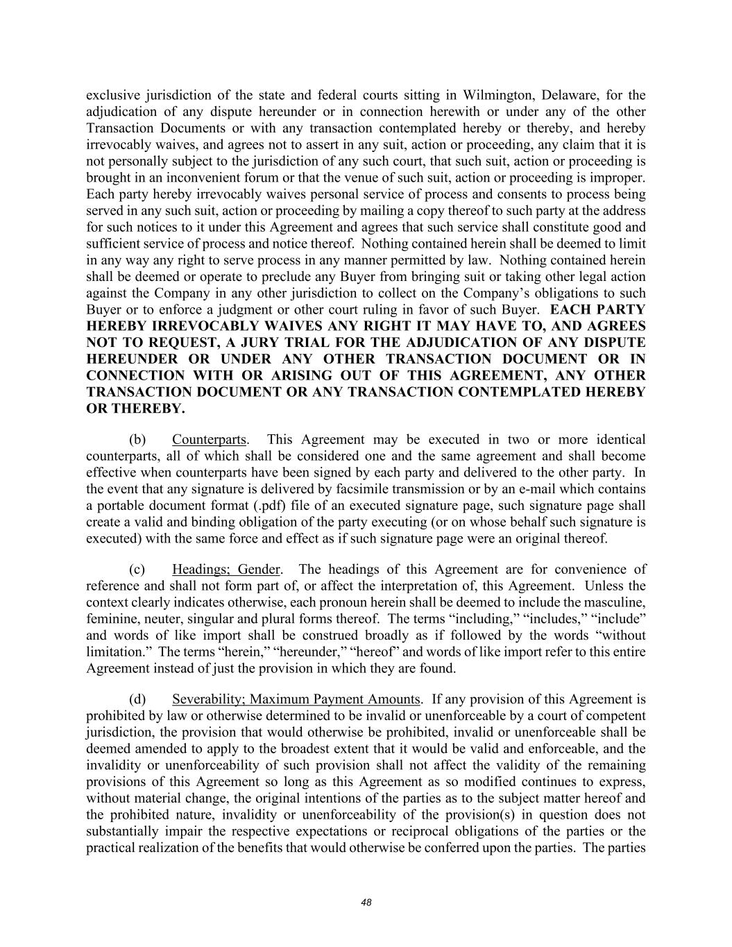 48 exclusive jurisdiction of the state and federal courts sitting in Wilmington, Delaware, for the adjudication of any dispute hereunder or in connection herewith or under any of the other Transaction Documents or with any transaction contemplated hereby or thereby, and hereby irrevocably waives, and agrees not to assert in any suit, action or proceeding, any claim that it is not personally subject to the jurisdiction of any such court, that such suit, action or proceeding is brought in an inconvenient forum or that the venue of such suit, action or proceeding is improper. Each party hereby irrevocably waives personal service of process and consents to process being served in any such suit, action or proceeding by mailing a copy thereof to such party at the address for such notices to it under this Agreement and agrees that such service shall constitute good and sufficient service of process and notice thereof. Nothing contained herein shall be deemed to limit in any way any right to serve process in any manner permitted by law. Nothing contained herein shall be deemed or operate to preclude any Buyer from bringing suit or taking other legal action against the Company in any other jurisdiction to collect on the Company’s obligations to such Buyer or to enforce a judgment or other court ruling in favor of such Buyer. EACH PARTY HEREBY IRREVOCABLY WAIVES ANY RIGHT IT MAY HAVE TO, AND AGREES NOT TO REQUEST, A JURY TRIAL FOR THE ADJUDICATION OF ANY DISPUTE HEREUNDER OR UNDER ANY OTHER TRANSACTION DOCUMENT OR IN CONNECTION WITH OR ARISING OUT OF THIS AGREEMENT, ANY OTHER TRANSACTION DOCUMENT OR ANY TRANSACTION CONTEMPLATED HEREBY OR THEREBY. (b) Counterparts. This Agreement may be executed in two or more identical counterparts, all of which shall be considered one and the same agreement and shall become effective when counterparts have been signed by each party and delivered to the other party. In the event that any signature is delivered by facsimile transmission or by an e-mail which contains a portable document format (.pdf) file of an executed signature page, such signature page shall create a valid and binding obligation of the party executing (or on whose behalf such signature is executed) with the same force and effect as if such signature page were an original thereof. (c) Headings; Gender. The headings of this Agreement are for convenience of reference and shall not form part of, or affect the interpretation of, this Agreement. Unless the context clearly indicates otherwise, each pronoun herein shall be deemed to include the masculine, feminine, neuter, singular and plural forms thereof. The terms “including,” “includes,” “include” and words of like import shall be construed broadly as if followed by the words “without limitation.” The terms “herein,” “hereunder,” “hereof” and words of like import refer to this entire Agreement instead of just the provision in which they are found. (d) Severability; Maximum Payment Amounts. If any provision of this Agreement is prohibited by law or otherwise determined to be invalid or unenforceable by a court of competent jurisdiction, the provision that would otherwise be prohibited, invalid or unenforceable shall be deemed amended to apply to the broadest extent that it would be valid and enforceable, and the invalidity or unenforceability of such provision shall not affect the validity of the remaining provisions of this Agreement so long as this Agreement as so modified continues to express, without material change, the original intentions of the parties as to the subject matter hereof and the prohibited nature, invalidity or unenforceability of the provision(s) in question does not substantially impair the respective expectations or reciprocal obligations of the parties or the practical realization of the benefits that would otherwise be conferred upon the parties. The parties