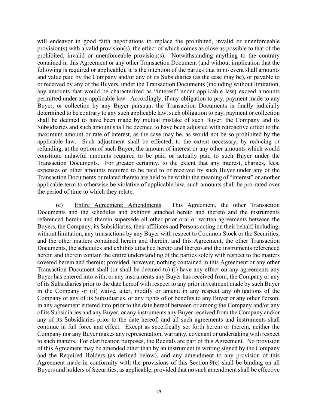 49 will endeavor in good faith negotiations to replace the prohibited, invalid or unenforceable provision(s) with a valid provision(s), the effect of which comes as close as possible to that of the prohibited, invalid or unenforceable provision(s). Notwithstanding anything to the contrary contained in this Agreement or any other Transaction Document (and without implication that the following is required or applicable), it is the intention of the parties that in no event shall amounts and value paid by the Company and/or any of its Subsidiaries (as the case may be), or payable to or received by any of the Buyers, under the Transaction Documents (including without limitation, any amounts that would be characterized as “interest” under applicable law) exceed amounts permitted under any applicable law. Accordingly, if any obligation to pay, payment made to any Buyer, or collection by any Buyer pursuant the Transaction Documents is finally judicially determined to be contrary to any such applicable law, such obligation to pay, payment or collection shall be deemed to have been made by mutual mistake of such Buyer, the Company and its Subsidiaries and such amount shall be deemed to have been adjusted with retroactive effect to the maximum amount or rate of interest, as the case may be, as would not be so prohibited by the applicable law. Such adjustment shall be effected, to the extent necessary, by reducing or refunding, at the option of such Buyer, the amount of interest or any other amounts which would constitute unlawful amounts required to be paid or actually paid to such Buyer under the Transaction Documents. For greater certainty, to the extent that any interest, charges, fees, expenses or other amounts required to be paid to or received by such Buyer under any of the Transaction Documents or related thereto are held to be within the meaning of “interest” or another applicable term to otherwise be violative of applicable law, such amounts shall be pro-rated over the period of time to which they relate. (e) Entire Agreement; Amendments. This Agreement, the other Transaction Documents and the schedules and exhibits attached hereto and thereto and the instruments referenced herein and therein supersede all other prior oral or written agreements between the Buyers, the Company, its Subsidiaries, their affiliates and Persons acting on their behalf, including, without limitation, any transactions by any Buyer with respect to Common Stock or the Securities, and the other matters contained herein and therein, and this Agreement, the other Transaction Documents, the schedules and exhibits attached hereto and thereto and the instruments referenced herein and therein contain the entire understanding of the parties solely with respect to the matters covered herein and therein; provided, however, nothing contained in this Agreement or any other Transaction Document shall (or shall be deemed to) (i) have any effect on any agreements any Buyer has entered into with, or any instruments any Buyer has received from, the Company or any of its Subsidiaries prior to the date hereof with respect to any prior investment made by such Buyer in the Company or (ii) waive, alter, modify or amend in any respect any obligations of the Company or any of its Subsidiaries, or any rights of or benefits to any Buyer or any other Person, in any agreement entered into prior to the date hereof between or among the Company and/or any of its Subsidiaries and any Buyer, or any instruments any Buyer received from the Company and/or any of its Subsidiaries prior to the date hereof, and all such agreements and instruments shall continue in full force and effect. Except as specifically set forth herein or therein, neither the Company nor any Buyer makes any representation, warranty, covenant or undertaking with respect to such matters. For clarification purposes, the Recitals are part of this Agreement. No provision of this Agreement may be amended other than by an instrument in writing signed by the Company and the Required Holders (as defined below), and any amendment to any provision of this Agreement made in conformity with the provisions of this Section 9(e) shall be binding on all Buyers and holders of Securities, as applicable; provided that no such amendment shall be effective