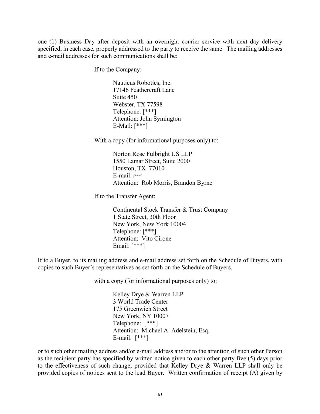 51 one (1) Business Day after deposit with an overnight courier service with next day delivery specified, in each case, properly addressed to the party to receive the same. The mailing addresses and e-mail addresses for such communications shall be: If to the Company: Nauticus Robotics, Inc. 17146 Feathercraft Lane Suite 450 Webster, TX 77598 Telephone: [***] Attention: John Symington E-Mail: [***] With a copy (for informational purposes only) to: Norton Rose Fulbright US LLP 1550 Lamar Street, Suite 2000 Houston, TX 77010 E-mail: [***] Attention: Rob Morris, Brandon Byrne If to the Transfer Agent: Continental Stock Transfer & Trust Company 1 State Street, 30th Floor New York, New York 10004 Telephone: [***] Attention: Vito Cirone Email: [***] If to a Buyer, to its mailing address and e-mail address set forth on the Schedule of Buyers, with copies to such Buyer’s representatives as set forth on the Schedule of Buyers, with a copy (for informational purposes only) to: Kelley Drye & Warren LLP 3 World Trade Center 175 Greenwich Street New York, NY 10007 Telephone: [***] Attention: Michael A. Adelstein, Esq. E-mail: [***] or to such other mailing address and/or e-mail address and/or to the attention of such other Person as the recipient party has specified by written notice given to each other party five (5) days prior to the effectiveness of such change, provided that Kelley Drye & Warren LLP shall only be provided copies of notices sent to the lead Buyer. Written confirmation of receipt (A) given by