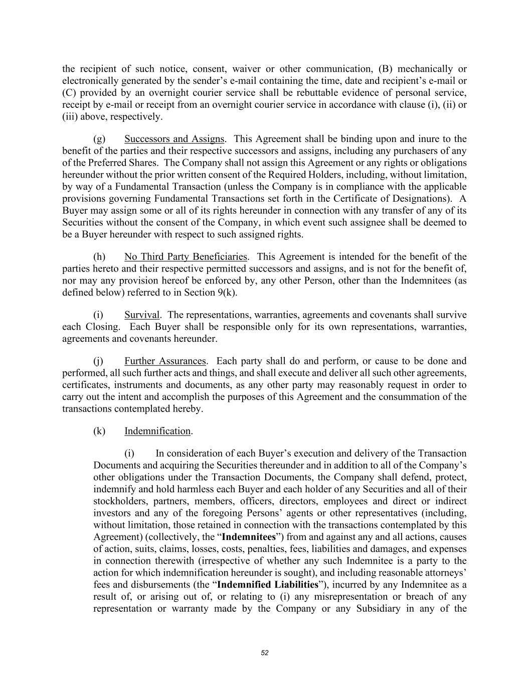 52 the recipient of such notice, consent, waiver or other communication, (B) mechanically or electronically generated by the sender’s e-mail containing the time, date and recipient’s e-mail or (C) provided by an overnight courier service shall be rebuttable evidence of personal service, receipt by e-mail or receipt from an overnight courier service in accordance with clause (i), (ii) or (iii) above, respectively. (g) Successors and Assigns. This Agreement shall be binding upon and inure to the benefit of the parties and their respective successors and assigns, including any purchasers of any of the Preferred Shares. The Company shall not assign this Agreement or any rights or obligations hereunder without the prior written consent of the Required Holders, including, without limitation, by way of a Fundamental Transaction (unless the Company is in compliance with the applicable provisions governing Fundamental Transactions set forth in the Certificate of Designations). A Buyer may assign some or all of its rights hereunder in connection with any transfer of any of its Securities without the consent of the Company, in which event such assignee shall be deemed to be a Buyer hereunder with respect to such assigned rights. (h) No Third Party Beneficiaries. This Agreement is intended for the benefit of the parties hereto and their respective permitted successors and assigns, and is not for the benefit of, nor may any provision hereof be enforced by, any other Person, other than the Indemnitees (as defined below) referred to in Section 9(k). (i) Survival. The representations, warranties, agreements and covenants shall survive each Closing. Each Buyer shall be responsible only for its own representations, warranties, agreements and covenants hereunder. (j) Further Assurances. Each party shall do and perform, or cause to be done and performed, all such further acts and things, and shall execute and deliver all such other agreements, certificates, instruments and documents, as any other party may reasonably request in order to carry out the intent and accomplish the purposes of this Agreement and the consummation of the transactions contemplated hereby. (k) Indemnification. (i) In consideration of each Buyer’s execution and delivery of the Transaction Documents and acquiring the Securities thereunder and in addition to all of the Company’s other obligations under the Transaction Documents, the Company shall defend, protect, indemnify and hold harmless each Buyer and each holder of any Securities and all of their stockholders, partners, members, officers, directors, employees and direct or indirect investors and any of the foregoing Persons’ agents or other representatives (including, without limitation, those retained in connection with the transactions contemplated by this Agreement) (collectively, the “Indemnitees”) from and against any and all actions, causes of action, suits, claims, losses, costs, penalties, fees, liabilities and damages, and expenses in connection therewith (irrespective of whether any such Indemnitee is a party to the action for which indemnification hereunder is sought), and including reasonable attorneys’ fees and disbursements (the “Indemnified Liabilities”), incurred by any Indemnitee as a result of, or arising out of, or relating to (i) any misrepresentation or breach of any representation or warranty made by the Company or any Subsidiary in any of the