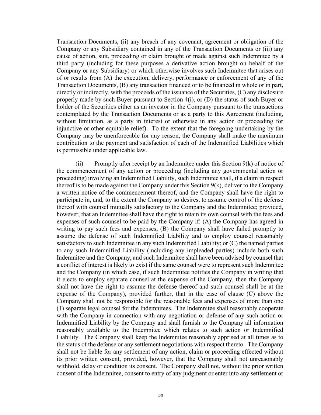 53 Transaction Documents, (ii) any breach of any covenant, agreement or obligation of the Company or any Subsidiary contained in any of the Transaction Documents or (iii) any cause of action, suit, proceeding or claim brought or made against such Indemnitee by a third party (including for these purposes a derivative action brought on behalf of the Company or any Subsidiary) or which otherwise involves such Indemnitee that arises out of or results from (A) the execution, delivery, performance or enforcement of any of the Transaction Documents, (B) any transaction financed or to be financed in whole or in part, directly or indirectly, with the proceeds of the issuance of the Securities, (C) any disclosure properly made by such Buyer pursuant to Section 4(i), or (D) the status of such Buyer or holder of the Securities either as an investor in the Company pursuant to the transactions contemplated by the Transaction Documents or as a party to this Agreement (including, without limitation, as a party in interest or otherwise in any action or proceeding for injunctive or other equitable relief). To the extent that the foregoing undertaking by the Company may be unenforceable for any reason, the Company shall make the maximum contribution to the payment and satisfaction of each of the Indemnified Liabilities which is permissible under applicable law. (ii) Promptly after receipt by an Indemnitee under this Section 9(k) of notice of the commencement of any action or proceeding (including any governmental action or proceeding) involving an Indemnified Liability, such Indemnitee shall, if a claim in respect thereof is to be made against the Company under this Section 9(k), deliver to the Company a written notice of the commencement thereof, and the Company shall have the right to participate in, and, to the extent the Company so desires, to assume control of the defense thereof with counsel mutually satisfactory to the Company and the Indemnitee; provided, however, that an Indemnitee shall have the right to retain its own counsel with the fees and expenses of such counsel to be paid by the Company if: (A) the Company has agreed in writing to pay such fees and expenses; (B) the Company shall have failed promptly to assume the defense of such Indemnified Liability and to employ counsel reasonably satisfactory to such Indemnitee in any such Indemnified Liability; or (C) the named parties to any such Indemnified Liability (including any impleaded parties) include both such Indemnitee and the Company, and such Indemnitee shall have been advised by counsel that a conflict of interest is likely to exist if the same counsel were to represent such Indemnitee and the Company (in which case, if such Indemnitee notifies the Company in writing that it elects to employ separate counsel at the expense of the Company, then the Company shall not have the right to assume the defense thereof and such counsel shall be at the expense of the Company), provided further, that in the case of clause (C) above the Company shall not be responsible for the reasonable fees and expenses of more than one (1) separate legal counsel for the Indemnitees. The Indemnitee shall reasonably cooperate with the Company in connection with any negotiation or defense of any such action or Indemnified Liability by the Company and shall furnish to the Company all information reasonably available to the Indemnitee which relates to such action or Indemnified Liability. The Company shall keep the Indemnitee reasonably apprised at all times as to the status of the defense or any settlement negotiations with respect thereto. The Company shall not be liable for any settlement of any action, claim or proceeding effected without its prior written consent, provided, however, that the Company shall not unreasonably withhold, delay or condition its consent. The Company shall not, without the prior written consent of the Indemnitee, consent to entry of any judgment or enter into any settlement or