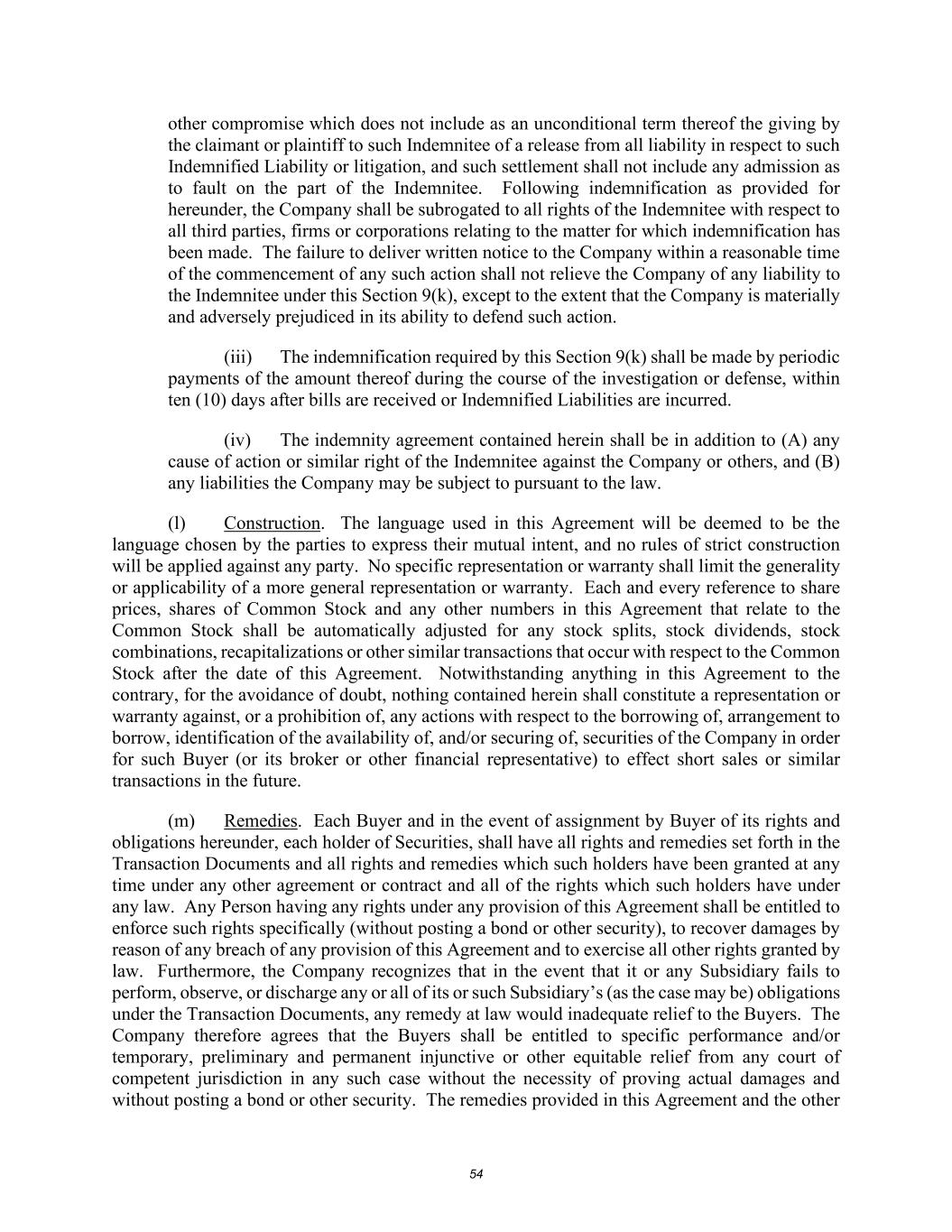 54 other compromise which does not include as an unconditional term thereof the giving by the claimant or plaintiff to such Indemnitee of a release from all liability in respect to such Indemnified Liability or litigation, and such settlement shall not include any admission as to fault on the part of the Indemnitee. Following indemnification as provided for hereunder, the Company shall be subrogated to all rights of the Indemnitee with respect to all third parties, firms or corporations relating to the matter for which indemnification has been made. The failure to deliver written notice to the Company within a reasonable time of the commencement of any such action shall not relieve the Company of any liability to the Indemnitee under this Section 9(k), except to the extent that the Company is materially and adversely prejudiced in its ability to defend such action. (iii) The indemnification required by this Section 9(k) shall be made by periodic payments of the amount thereof during the course of the investigation or defense, within ten (10) days after bills are received or Indemnified Liabilities are incurred. (iv) The indemnity agreement contained herein shall be in addition to (A) any cause of action or similar right of the Indemnitee against the Company or others, and (B) any liabilities the Company may be subject to pursuant to the law. (l) Construction. The language used in this Agreement will be deemed to be the language chosen by the parties to express their mutual intent, and no rules of strict construction will be applied against any party. No specific representation or warranty shall limit the generality or applicability of a more general representation or warranty. Each and every reference to share prices, shares of Common Stock and any other numbers in this Agreement that relate to the Common Stock shall be automatically adjusted for any stock splits, stock dividends, stock combinations, recapitalizations or other similar transactions that occur with respect to the Common Stock after the date of this Agreement. Notwithstanding anything in this Agreement to the contrary, for the avoidance of doubt, nothing contained herein shall constitute a representation or warranty against, or a prohibition of, any actions with respect to the borrowing of, arrangement to borrow, identification of the availability of, and/or securing of, securities of the Company in order for such Buyer (or its broker or other financial representative) to effect short sales or similar transactions in the future. (m) Remedies. Each Buyer and in the event of assignment by Buyer of its rights and obligations hereunder, each holder of Securities, shall have all rights and remedies set forth in the Transaction Documents and all rights and remedies which such holders have been granted at any time under any other agreement or contract and all of the rights which such holders have under any law. Any Person having any rights under any provision of this Agreement shall be entitled to enforce such rights specifically (without posting a bond or other security), to recover damages by reason of any breach of any provision of this Agreement and to exercise all other rights granted by law. Furthermore, the Company recognizes that in the event that it or any Subsidiary fails to perform, observe, or discharge any or all of its or such Subsidiary’s (as the case may be) obligations under the Transaction Documents, any remedy at law would inadequate relief to the Buyers. The Company therefore agrees that the Buyers shall be entitled to specific performance and/or temporary, preliminary and permanent injunctive or other equitable relief from any court of competent jurisdiction in any such case without the necessity of proving actual damages and without posting a bond or other security. The remedies provided in this Agreement and the other