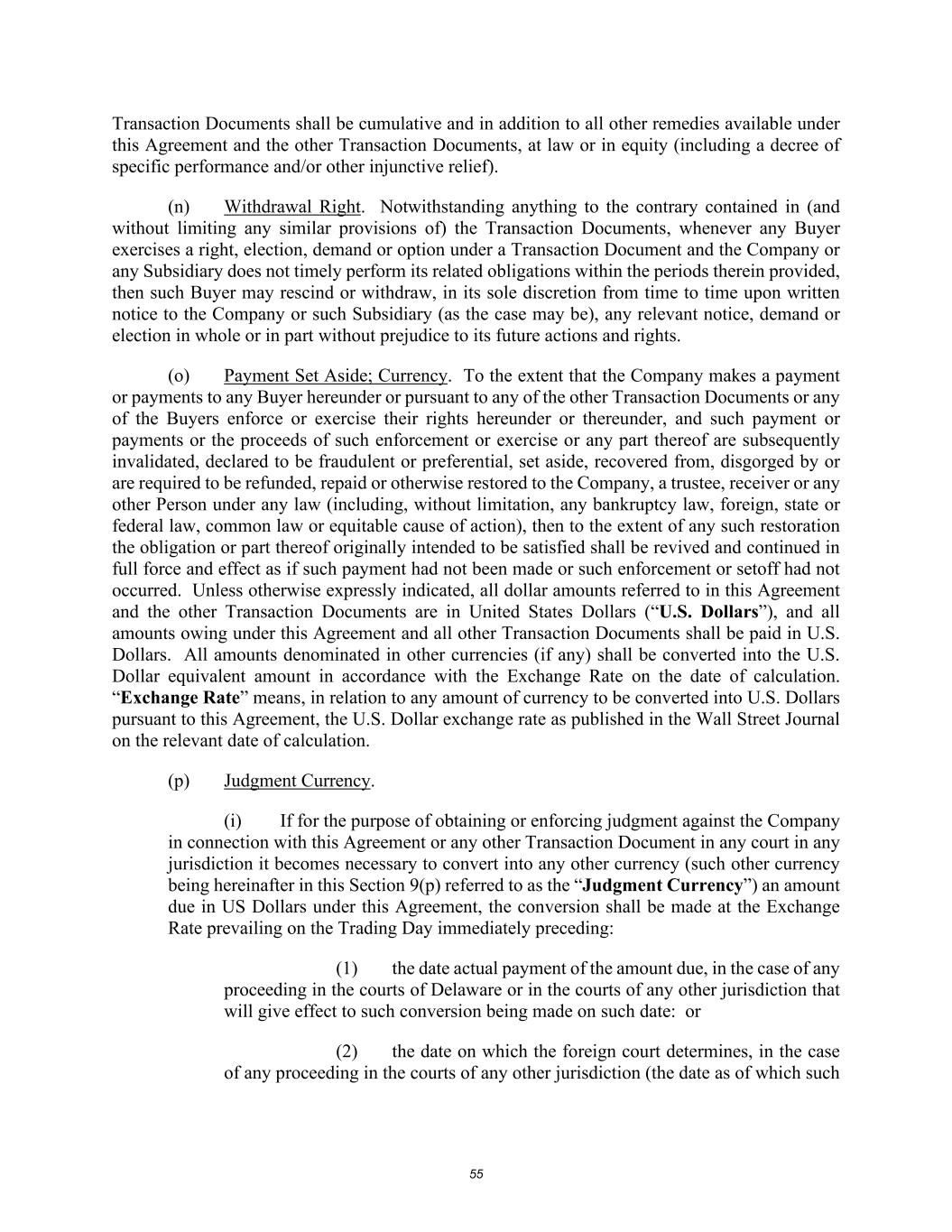 55 Transaction Documents shall be cumulative and in addition to all other remedies available under this Agreement and the other Transaction Documents, at law or in equity (including a decree of specific performance and/or other injunctive relief). (n) Withdrawal Right. Notwithstanding anything to the contrary contained in (and without limiting any similar provisions of) the Transaction Documents, whenever any Buyer exercises a right, election, demand or option under a Transaction Document and the Company or any Subsidiary does not timely perform its related obligations within the periods therein provided, then such Buyer may rescind or withdraw, in its sole discretion from time to time upon written notice to the Company or such Subsidiary (as the case may be), any relevant notice, demand or election in whole or in part without prejudice to its future actions and rights. (o) Payment Set Aside; Currency. To the extent that the Company makes a payment or payments to any Buyer hereunder or pursuant to any of the other Transaction Documents or any of the Buyers enforce or exercise their rights hereunder or thereunder, and such payment or payments or the proceeds of such enforcement or exercise or any part thereof are subsequently invalidated, declared to be fraudulent or preferential, set aside, recovered from, disgorged by or are required to be refunded, repaid or otherwise restored to the Company, a trustee, receiver or any other Person under any law (including, without limitation, any bankruptcy law, foreign, state or federal law, common law or equitable cause of action), then to the extent of any such restoration the obligation or part thereof originally intended to be satisfied shall be revived and continued in full force and effect as if such payment had not been made or such enforcement or setoff had not occurred. Unless otherwise expressly indicated, all dollar amounts referred to in this Agreement and the other Transaction Documents are in United States Dollars (“U.S. Dollars”), and all amounts owing under this Agreement and all other Transaction Documents shall be paid in U.S. Dollars. All amounts denominated in other currencies (if any) shall be converted into the U.S. Dollar equivalent amount in accordance with the Exchange Rate on the date of calculation. “Exchange Rate” means, in relation to any amount of currency to be converted into U.S. Dollars pursuant to this Agreement, the U.S. Dollar exchange rate as published in the Wall Street Journal on the relevant date of calculation. (p) Judgment Currency. (i) If for the purpose of obtaining or enforcing judgment against the Company in connection with this Agreement or any other Transaction Document in any court in any jurisdiction it becomes necessary to convert into any other currency (such other currency being hereinafter in this Section 9(p) referred to as the “Judgment Currency”) an amount due in US Dollars under this Agreement, the conversion shall be made at the Exchange Rate prevailing on the Trading Day immediately preceding: (1) the date actual payment of the amount due, in the case of any proceeding in the courts of Delaware or in the courts of any other jurisdiction that will give effect to such conversion being made on such date: or (2) the date on which the foreign court determines, in the case of any proceeding in the courts of any other jurisdiction (the date as of which such