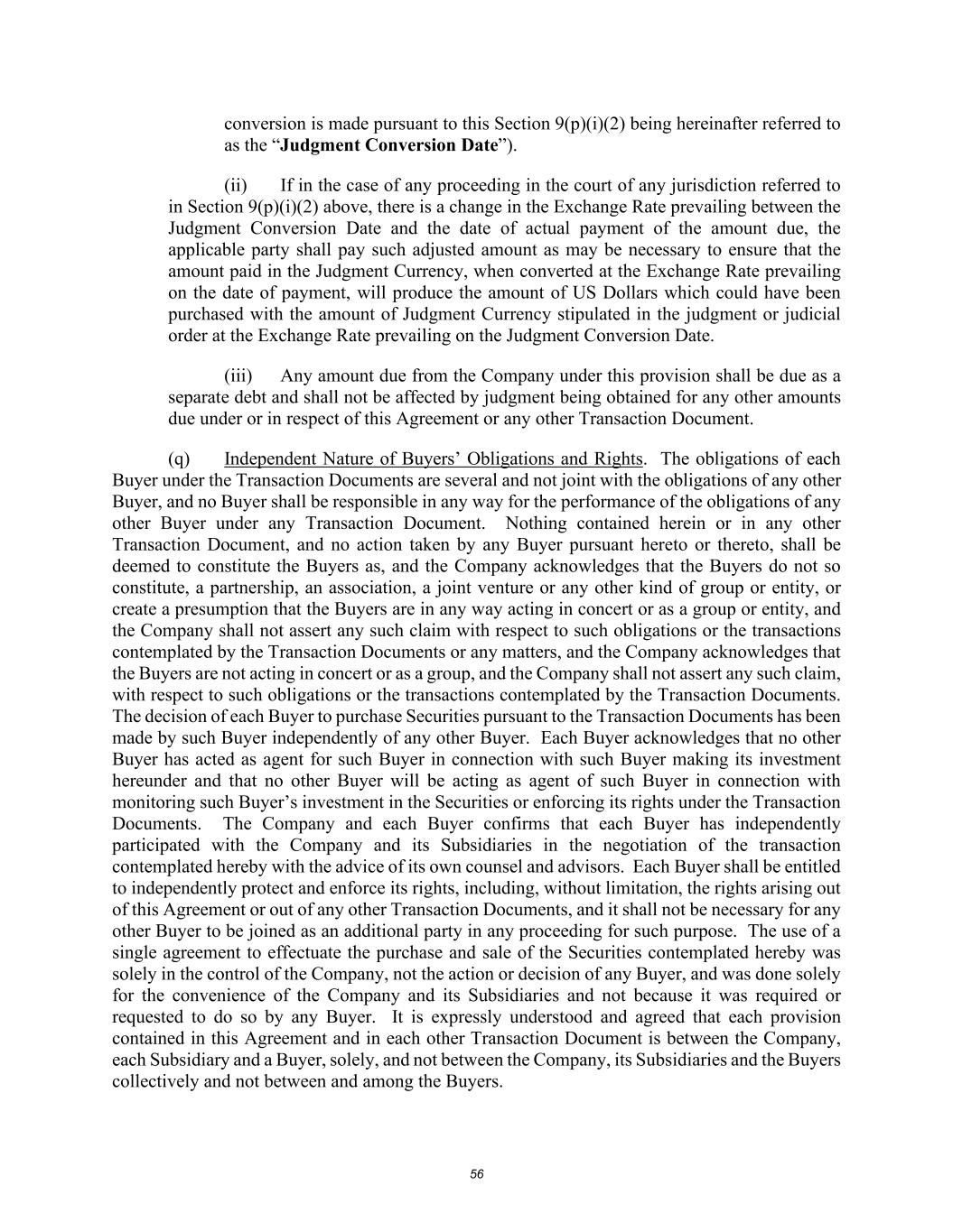 56 conversion is made pursuant to this Section 9(p)(i)(2) being hereinafter referred to as the “Judgment Conversion Date”). (ii) If in the case of any proceeding in the court of any jurisdiction referred to in Section 9(p)(i)(2) above, there is a change in the Exchange Rate prevailing between the Judgment Conversion Date and the date of actual payment of the amount due, the applicable party shall pay such adjusted amount as may be necessary to ensure that the amount paid in the Judgment Currency, when converted at the Exchange Rate prevailing on the date of payment, will produce the amount of US Dollars which could have been purchased with the amount of Judgment Currency stipulated in the judgment or judicial order at the Exchange Rate prevailing on the Judgment Conversion Date. (iii) Any amount due from the Company under this provision shall be due as a separate debt and shall not be affected by judgment being obtained for any other amounts due under or in respect of this Agreement or any other Transaction Document. (q) Independent Nature of Buyers’ Obligations and Rights. The obligations of each Buyer under the Transaction Documents are several and not joint with the obligations of any other Buyer, and no Buyer shall be responsible in any way for the performance of the obligations of any other Buyer under any Transaction Document. Nothing contained herein or in any other Transaction Document, and no action taken by any Buyer pursuant hereto or thereto, shall be deemed to constitute the Buyers as, and the Company acknowledges that the Buyers do not so constitute, a partnership, an association, a joint venture or any other kind of group or entity, or create a presumption that the Buyers are in any way acting in concert or as a group or entity, and the Company shall not assert any such claim with respect to such obligations or the transactions contemplated by the Transaction Documents or any matters, and the Company acknowledges that the Buyers are not acting in concert or as a group, and the Company shall not assert any such claim, with respect to such obligations or the transactions contemplated by the Transaction Documents. The decision of each Buyer to purchase Securities pursuant to the Transaction Documents has been made by such Buyer independently of any other Buyer. Each Buyer acknowledges that no other Buyer has acted as agent for such Buyer in connection with such Buyer making its investment hereunder and that no other Buyer will be acting as agent of such Buyer in connection with monitoring such Buyer’s investment in the Securities or enforcing its rights under the Transaction Documents. The Company and each Buyer confirms that each Buyer has independently participated with the Company and its Subsidiaries in the negotiation of the transaction contemplated hereby with the advice of its own counsel and advisors. Each Buyer shall be entitled to independently protect and enforce its rights, including, without limitation, the rights arising out of this Agreement or out of any other Transaction Documents, and it shall not be necessary for any other Buyer to be joined as an additional party in any proceeding for such purpose. The use of a single agreement to effectuate the purchase and sale of the Securities contemplated hereby was solely in the control of the Company, not the action or decision of any Buyer, and was done solely for the convenience of the Company and its Subsidiaries and not because it was required or requested to do so by any Buyer. It is expressly understood and agreed that each provision contained in this Agreement and in each other Transaction Document is between the Company, each Subsidiary and a Buyer, solely, and not between the Company, its Subsidiaries and the Buyers collectively and not between and among the Buyers.