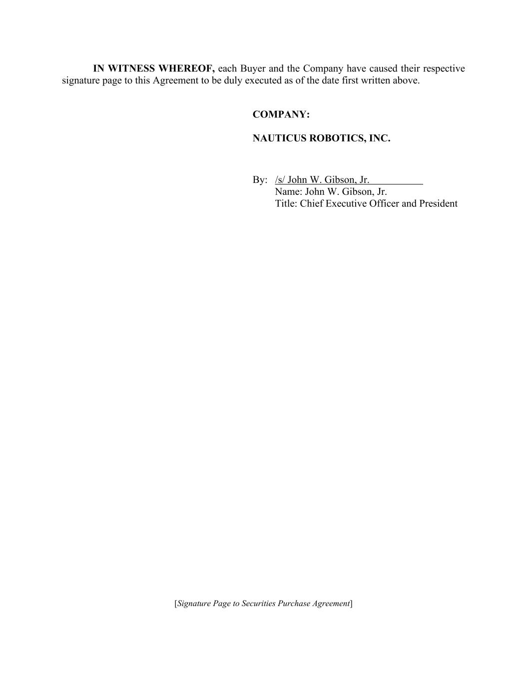 IN WITNESS WHEREOF, each Buyer and the Company have caused their respective signature page to this Agreement to be duly executed as of the date first written above. COMPANY: NAUTICUS ROBOTICS, INC. By: /s/ John W. Gibson, Jr. Name: John W. Gibson, Jr. Title: Chief Executive Officer and President [Signature Page to Securities Purchase Agreement]