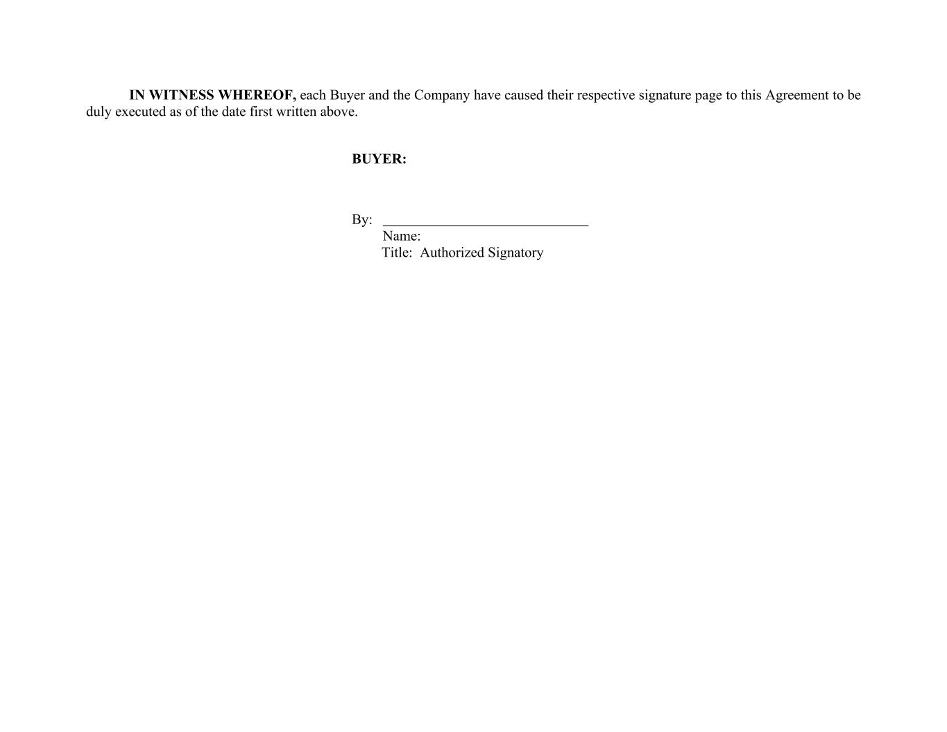 IN WITNESS WHEREOF, each Buyer and the Company have caused their respective signature page to this Agreement to be duly executed as of the date first written above. BUYER: By: Name: Title: Authorized Signatory