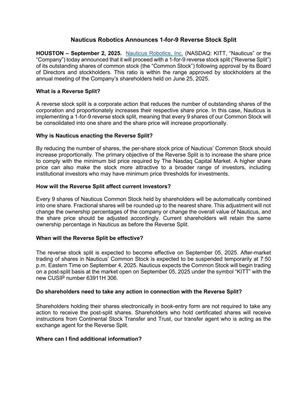 Nauticus Robotics Announces 1-for-9 Reverse Stock Split HOUSTON – September 2, 2025. Nauticus Robotics, Inc. (NASDAQ: KITT, “Nauticus” or the “Company”) today announced that it will proceed with a 1-for-9 reverse stock split (“Reverse Split”) of its outstanding shares of common stock (the “Common Stock”) following approval by its Board of Directors and stockholders. This ratio is within the range approved by stockholders at the annual meeting of the Company’s shareholders held on June 25, 2025. What is a Reverse Split? A reverse stock split is a corporate action that reduces the number of outstanding shares of the corporation and proportionately increases their respective share price. In this case, Nauticus is implementing a 1-for-9 reverse stock split, meaning that every 9 shares of our Common Stock will be consolidated into one share and the share price will increase proportionally. Why is Nauticus enacting the Reverse Split? By reducing the number of shares, the per-share stock price of Nauticus’ Common Stock should increase proportionally. The primary objective of the Reverse Split is to increase the share price to comply with the minimum bid price required by The Nasdaq Capital Market. A higher share price can also make the stock more attractive to a broader range of investors, including institutional investors who may have minimum price thresholds for investments. How will the Reverse Split affect current investors? Every 9 shares of Nauticus Common Stock held by shareholders will be automatically combined into one share. Fractional shares will be rounded up to the nearest share. This adjustment will not change the ownership percentages of the company or change the overall value of Nauticus, and the share price should be adjusted accordingly. Current shareholders will retain the same ownership percentage in Nauticus as before the Reverse Split. When will the Reverse Split be effective? The reverse stock split is expected to become effective on September 05, 2025. After-market trading of shares in Nauticus’ Common Stock is expected to be suspended temporarily at 7:50 p.m. Eastern Time on September 4, 2025. Nauticus expects the Common Stock will begin trading on a post-split basis at the market open on September 05, 2025 under the symbol “KITT” with the new CUSIP number 63911H 306. Do shareholders need to take any action in connection with the Reverse Split? Shareholders holding their shares electronically in book-entry form are not required to take any action to receive the post-split shares. Shareholders who hold certificated shares will receive instructions from Continental Stock Transfer and Trust, our transfer agent who is acting as the exchange agent for the Reverse Split. Where can I find additional information?