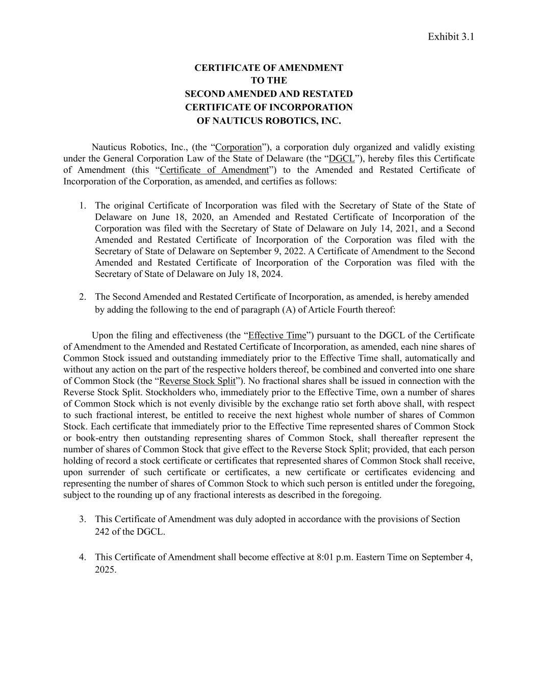 Exhibit 3.1 CERTIFICATE OF AMENDMENT TO THE SECOND AMENDED AND RESTATED CERTIFICATE OF INCORPORATION OF NAUTICUS ROBOTICS, INC. Nauticus Robotics, Inc., (the “Corporation”), a corporation duly organized and validly existing under the General Corporation Law of the State of Delaware (the “DGCL”), hereby files this Certificate of Amendment (this “Certificate of Amendment”) to the Amended and Restated Certificate of Incorporation of the Corporation, as amended, and certifies as follows: 1. The original Certificate of Incorporation was filed with the Secretary of State of the State of Delaware on June 18, 2020, an Amended and Restated Certificate of Incorporation of the Corporation was filed with the Secretary of State of Delaware on July 14, 2021, and a Second Amended and Restated Certificate of Incorporation of the Corporation was filed with the Secretary of State of Delaware on September 9, 2022. A Certificate of Amendment to the Second Amended and Restated Certificate of Incorporation of the Corporation was filed with the Secretary of State of Delaware on July 18, 2024. 2. The Second Amended and Restated Certificate of Incorporation, as amended, is hereby amended by adding the following to the end of paragraph (A) of Article Fourth thereof: Upon the filing and effectiveness (the “Effective Time”) pursuant to the DGCL of the Certificate of Amendment to the Amended and Restated Certificate of Incorporation, as amended, each nine shares of Common Stock issued and outstanding immediately prior to the Effective Time shall, automatically and without any action on the part of the respective holders thereof, be combined and converted into one share of Common Stock (the “Reverse Stock Split”). No fractional shares shall be issued in connection with the Reverse Stock Split. Stockholders who, immediately prior to the Effective Time, own a number of shares of Common Stock which is not evenly divisible by the exchange ratio set forth above shall, with respect to such fractional interest, be entitled to receive the next highest whole number of shares of Common Stock. Each certificate that immediately prior to the Effective Time represented shares of Common Stock or book-entry then outstanding representing shares of Common Stock, shall thereafter represent the number of shares of Common Stock that give effect to the Reverse Stock Split; provided, that each person holding of record a stock certificate or certificates that represented shares of Common Stock shall receive, upon surrender of such certificate or certificates, a new certificate or certificates evidencing and representing the number of shares of Common Stock to which such person is entitled under the foregoing, subject to the rounding up of any fractional interests as described in the foregoing. 3. This Certificate of Amendment was duly adopted in accordance with the provisions of Section 242 of the DGCL. 4. This Certificate of Amendment shall become effective at 8:01 p.m. Eastern Time on September 4, 2025.