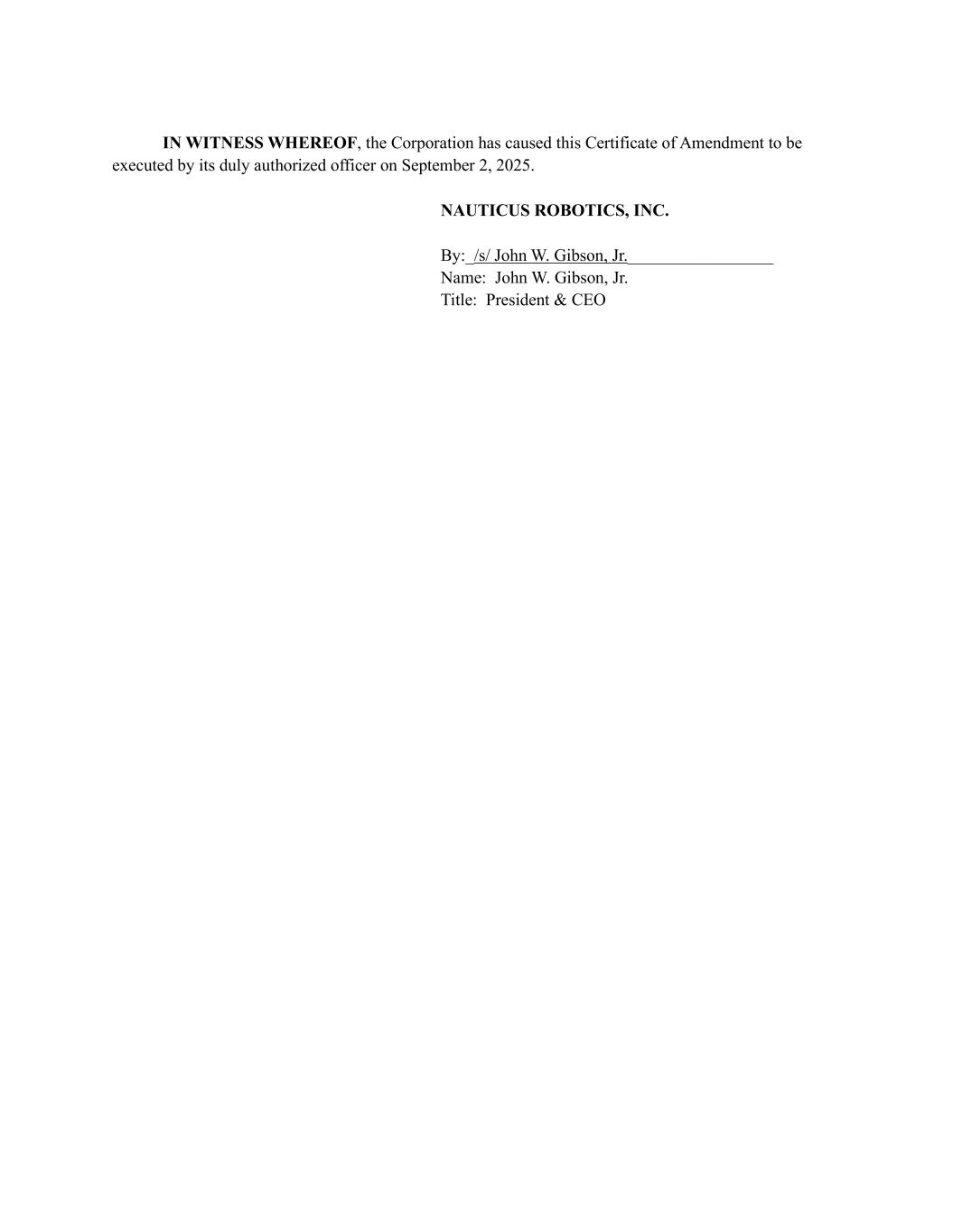 IN WITNESS WHEREOF, the Corporation has caused this Certificate of Amendment to be executed by its duly authorized officer on September 2, 2025. NAUTICUS ROBOTICS, INC. By:_/s/ John W. Gibson, Jr._________________ Name: John W. Gibson, Jr. Title: President & CEO
