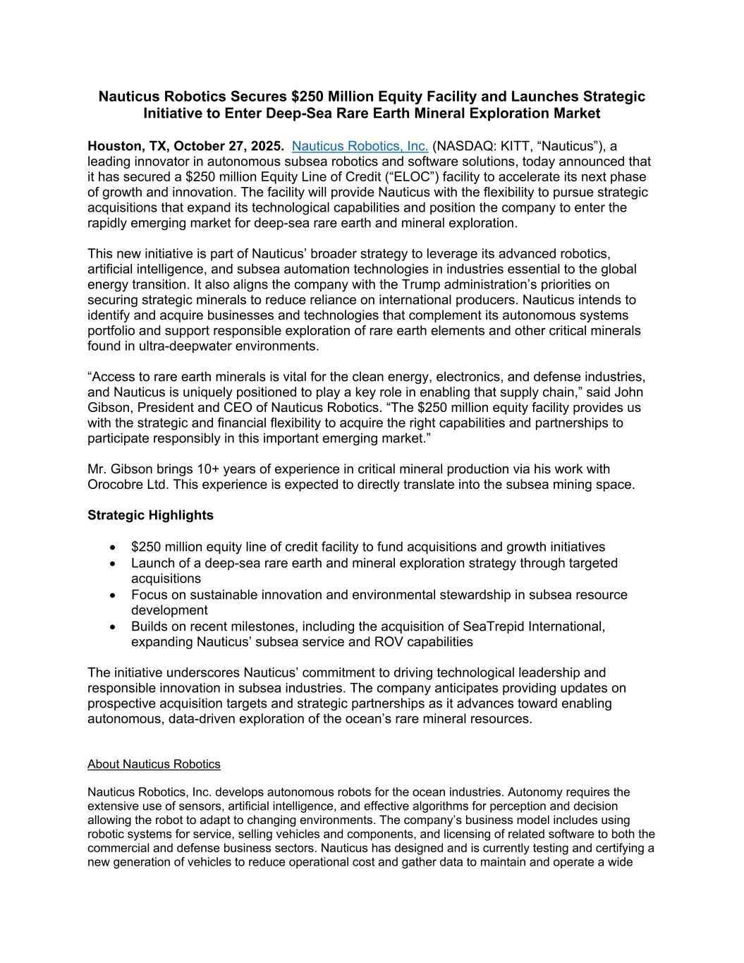 Nauticus Robotics Secures $250 Million Equity Facility and Launches Strategic Initiative to Enter Deep-Sea Rare Earth Mineral Exploration Market Houston, TX, October 27, 2025. Nauticus Robotics, Inc. (NASDAQ: KITT, “Nauticus”), a leading innovator in autonomous subsea robotics and software solutions, today announced that it has secured a $250 million Equity Line of Credit (“ELOC”) facility to accelerate its next phase of growth and innovation. The facility will provide Nauticus with the flexibility to pursue strategic acquisitions that expand its technological capabilities and position the company to enter the rapidly emerging market for deep-sea rare earth and mineral exploration. This new initiative is part of Nauticus’ broader strategy to leverage its advanced robotics, artificial intelligence, and subsea automation technologies in industries essential to the global energy transition. It also aligns the company with the Trump administration’s priorities on securing strategic minerals to reduce reliance on international producers. Nauticus intends to identify and acquire businesses and technologies that complement its autonomous systems portfolio and support responsible exploration of rare earth elements and other critical minerals found in ultra-deepwater environments. “Access to rare earth minerals is vital for the clean energy, electronics, and defense industries, and Nauticus is uniquely positioned to play a key role in enabling that supply chain,” said John Gibson, President and CEO of Nauticus Robotics. “The $250 million equity facility provides us with the strategic and financial flexibility to acquire the right capabilities and partnerships to participate responsibly in this important emerging market.” Mr. Gibson brings 10+ years of experience in critical mineral production via his work with Orocobre Ltd. This experience is expected to directly translate into the subsea mining space. Strategic Highlights • $250 million equity line of credit facility to fund acquisitions and growth initiatives • Launch of a deep-sea rare earth and mineral exploration strategy through targeted acquisitions • Focus on sustainable innovation and environmental stewardship in subsea resource development • Builds on recent milestones, including the acquisition of SeaTrepid International, expanding Nauticus’ subsea service and ROV capabilities The initiative underscores Nauticus’ commitment to driving technological leadership and responsible innovation in subsea industries. The company anticipates providing updates on prospective acquisition targets and strategic partnerships as it advances toward enabling autonomous, data-driven exploration of the ocean’s rare mineral resources. About Nauticus Robotics Nauticus Robotics, Inc. develops autonomous robots for the ocean industries. Autonomy requires the extensive use of sensors, artificial intelligence, and effective algorithms for perception and decision allowing the robot to adapt to changing environments. The company’s business model includes using robotic systems for service, selling vehicles and components, and licensing of related software to both the commercial and defense business sectors. Nauticus has designed and is currently testing and certifying a new generation of vehicles to reduce operational cost and gather data to maintain and operate a wide