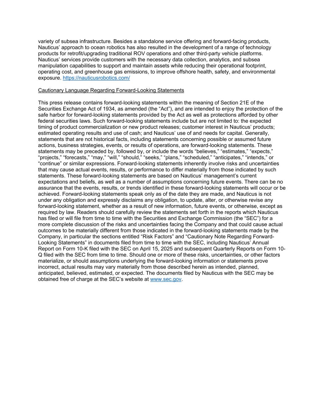 variety of subsea infrastructure. Besides a standalone service offering and forward-facing products, Nauticus’ approach to ocean robotics has also resulted in the development of a range of technology products for retrofit/upgrading traditional ROV operations and other third-party vehicle platforms. Nauticus’ services provide customers with the necessary data collection, analytics, and subsea manipulation capabilities to support and maintain assets while reducing their operational footprint, operating cost, and greenhouse gas emissions, to improve offshore health, safety, and environmental exposure. https://nauticusrobotics.com/ Cautionary Language Regarding Forward-Looking Statements This press release contains forward-looking statements within the meaning of Section 21E of the Securities Exchange Act of 1934, as amended (the “Act”), and are intended to enjoy the protection of the safe harbor for forward-looking statements provided by the Act as well as protections afforded by other federal securities laws. Such forward-looking statements include but are not limited to: the expected timing of product commercialization or new product releases; customer interest in Nauticus’ products; estimated operating results and use of cash; and Nauticus’ use of and needs for capital. Generally, statements that are not historical facts, including statements concerning possible or assumed future actions, business strategies, events, or results of operations, are forward-looking statements. These statements may be preceded by, followed by, or include the words “believes,” “estimates,” “expects,” “projects,” “forecasts,” “may,” “will,” “should,” “seeks,” “plans,” “scheduled,” “anticipates,” “intends,” or “continue” or similar expressions. Forward-looking statements inherently involve risks and uncertainties that may cause actual events, results, or performance to differ materially from those indicated by such statements. These forward-looking statements are based on Nauticus’ management’s current expectations and beliefs, as well as a number of assumptions concerning future events. There can be no assurance that the events, results, or trends identified in these forward-looking statements will occur or be achieved. Forward-looking statements speak only as of the date they are made, and Nauticus is not under any obligation and expressly disclaims any obligation, to update, alter, or otherwise revise any forward-looking statement, whether as a result of new information, future events, or otherwise, except as required by law. Readers should carefully review the statements set forth in the reports which Nauticus has filed or will file from time to time with the Securities and Exchange Commission (the “SEC”) for a more complete discussion of the risks and uncertainties facing the Company and that could cause actual outcomes to be materially different from those indicated in the forward-looking statements made by the Company, in particular the sections entitled “Risk Factors” and “Cautionary Note Regarding Forward- Looking Statements” in documents filed from time to time with the SEC, including Nauticus’ Annual Report on Form 10-K filed with the SEC on April 15, 2025 and subsequent Quarterly Reports on Form 10- Q filed with the SEC from time to time. Should one or more of these risks, uncertainties, or other factors materialize, or should assumptions underlying the forward-looking information or statements prove incorrect, actual results may vary materially from those described herein as intended, planned, anticipated, believed, estimated, or expected. The documents filed by Nauticus with the SEC may be obtained free of charge at the SEC’s website at www.sec.gov.