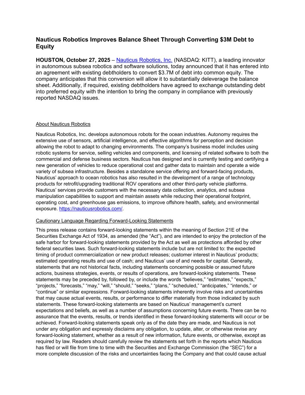 Nauticus Robotics Improves Balance Sheet Through Converting $3M Debt to Equity HOUSTON, October 27, 2025 – Nauticus Robotics, Inc. (NASDAQ: KITT), a leading innovator in autonomous subsea robotics and software solutions, today announced that it has entered into an agreement with existing debtholders to convert $3.7M of debt into common equity. The company anticipates that this conversion will allow it to substantially deleverage the balance sheet. Additionally, if required, existing debtholders have agreed to exchange outstanding debt into preferred equity with the intention to bring the company in compliance with previously reported NASDAQ issues. About Nauticus Robotics Nauticus Robotics, Inc. develops autonomous robots for the ocean industries. Autonomy requires the extensive use of sensors, artificial intelligence, and effective algorithms for perception and decision allowing the robot to adapt to changing environments. The company’s business model includes using robotic systems for service, selling vehicles and components, and licensing of related software to both the commercial and defense business sectors. Nauticus has designed and is currently testing and certifying a new generation of vehicles to reduce operational cost and gather data to maintain and operate a wide variety of subsea infrastructure. Besides a standalone service offering and forward-facing products, Nauticus’ approach to ocean robotics has also resulted in the development of a range of technology products for retrofit/upgrading traditional ROV operations and other third-party vehicle platforms. Nauticus’ services provide customers with the necessary data collection, analytics, and subsea manipulation capabilities to support and maintain assets while reducing their operational footprint, operating cost, and greenhouse gas emissions, to improve offshore health, safety, and environmental exposure. https://nauticusrobotics.com/. Cautionary Language Regarding Forward-Looking Statements This press release contains forward-looking statements within the meaning of Section 21E of the Securities Exchange Act of 1934, as amended (the “Act”), and are intended to enjoy the protection of the safe harbor for forward-looking statements provided by the Act as well as protections afforded by other federal securities laws. Such forward-looking statements include but are not limited to: the expected timing of product commercialization or new product releases; customer interest in Nauticus’ products; estimated operating results and use of cash; and Nauticus’ use of and needs for capital. Generally, statements that are not historical facts, including statements concerning possible or assumed future actions, business strategies, events, or results of operations, are forward-looking statements. These statements may be preceded by, followed by, or include the words “believes,” “estimates,” “expects,” “projects,” “forecasts,” “may,” “will,” “should,” “seeks,” “plans,” “scheduled,” “anticipates,” “intends,” or “continue” or similar expressions. Forward-looking statements inherently involve risks and uncertainties that may cause actual events, results, or performance to differ materially from those indicated by such statements. These forward-looking statements are based on Nauticus’ management’s current expectations and beliefs, as well as a number of assumptions concerning future events. There can be no assurance that the events, results, or trends identified in these forward-looking statements will occur or be achieved. Forward-looking statements speak only as of the date they are made, and Nauticus is not under any obligation and expressly disclaims any obligation, to update, alter, or otherwise revise any forward-looking statement, whether as a result of new information, future events, or otherwise, except as required by law. Readers should carefully review the statements set forth in the reports which Nauticus has filed or will file from time to time with the Securities and Exchange Commission (the “SEC”) for a more complete discussion of the risks and uncertainties facing the Company and that could cause actual