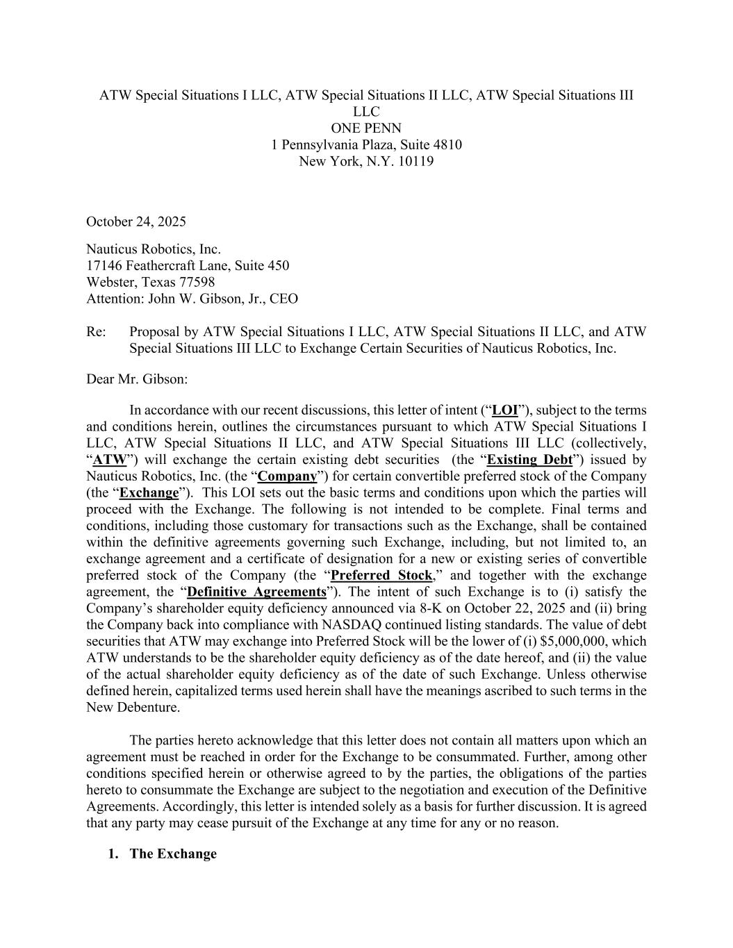 ATW Special Situations I LLC, ATW Special Situations II LLC, ATW Special Situations III LLC ONE PENN 1 Pennsylvania Plaza, Suite 4810 New York, N.Y. 10119 October 24, 2025 Nauticus Robotics, Inc. 17146 Feathercraft Lane, Suite 450 Webster, Texas 77598 Attention: John W. Gibson, Jr., CEO Re: Proposal by ATW Special Situations I LLC, ATW Special Situations II LLC, and ATW Special Situations III LLC to Exchange Certain Securities of Nauticus Robotics, Inc. Dear Mr. Gibson: In accordance with our recent discussions, this letter of intent (“LOI”), subject to the terms and conditions herein, outlines the circumstances pursuant to which ATW Special Situations I LLC, ATW Special Situations II LLC, and ATW Special Situations III LLC (collectively, “ATW”) will exchange the certain existing debt securities (the “Existing Debt”) issued by Nauticus Robotics, Inc. (the “Company”) for certain convertible preferred stock of the Company (the “Exchange”). This LOI sets out the basic terms and conditions upon which the parties will proceed with the Exchange. The following is not intended to be complete. Final terms and conditions, including those customary for transactions such as the Exchange, shall be contained within the definitive agreements governing such Exchange, including, but not limited to, an exchange agreement and a certificate of designation for a new or existing series of convertible preferred stock of the Company (the “Preferred Stock,” and together with the exchange agreement, the “Definitive Agreements”). The intent of such Exchange is to (i) satisfy the Company’s shareholder equity deficiency announced via 8-K on October 22, 2025 and (ii) bring the Company back into compliance with NASDAQ continued listing standards. The value of debt securities that ATW may exchange into Preferred Stock will be the lower of (i) $5,000,000, which ATW understands to be the shareholder equity deficiency as of the date hereof, and (ii) the value of the actual shareholder equity deficiency as of the date of such Exchange. Unless otherwise defined herein, capitalized terms used herein shall have the meanings ascribed to such terms in the New Debenture. The parties hereto acknowledge that this letter does not contain all matters upon which an agreement must be reached in order for the Exchange to be consummated. Further, among other conditions specified herein or otherwise agreed to by the parties, the obligations of the parties hereto to consummate the Exchange are subject to the negotiation and execution of the Definitive Agreements. Accordingly, this letter is intended solely as a basis for further discussion. It is agreed that any party may cease pursuit of the Exchange at any time for any or no reason. 1. The Exchange