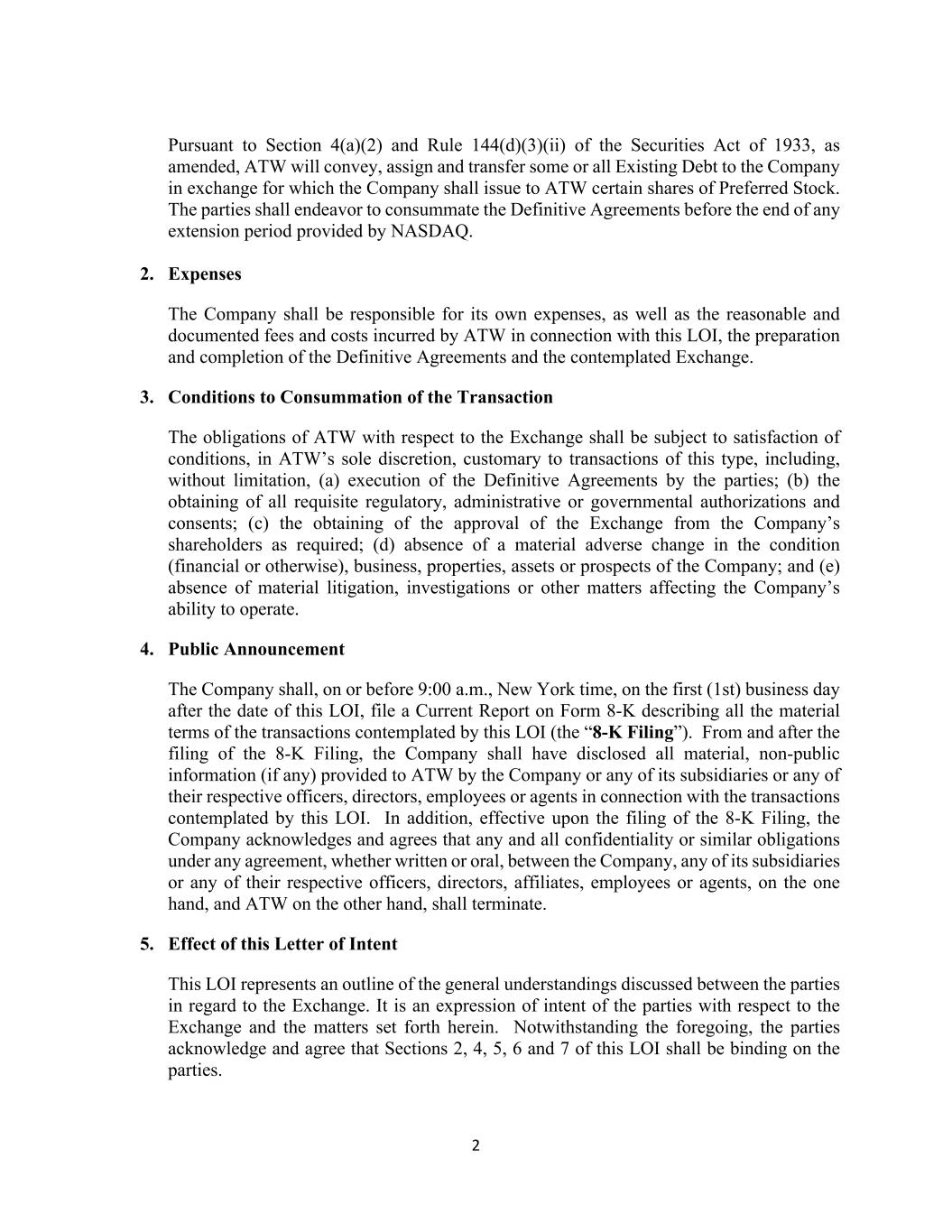 2 Pursuant to Section 4(a)(2) and Rule 144(d)(3)(ii) of the Securities Act of 1933, as amended, ATW will convey, assign and transfer some or all Existing Debt to the Company in exchange for which the Company shall issue to ATW certain shares of Preferred Stock. The parties shall endeavor to consummate the Definitive Agreements before the end of any extension period provided by NASDAQ. 2. Expenses The Company shall be responsible for its own expenses, as well as the reasonable and documented fees and costs incurred by ATW in connection with this LOI, the preparation and completion of the Definitive Agreements and the contemplated Exchange. 3. Conditions to Consummation of the Transaction The obligations of ATW with respect to the Exchange shall be subject to satisfaction of conditions, in ATW’s sole discretion, customary to transactions of this type, including, without limitation, (a) execution of the Definitive Agreements by the parties; (b) the obtaining of all requisite regulatory, administrative or governmental authorizations and consents; (c) the obtaining of the approval of the Exchange from the Company’s shareholders as required; (d) absence of a material adverse change in the condition (financial or otherwise), business, properties, assets or prospects of the Company; and (e) absence of material litigation, investigations or other matters affecting the Company’s ability to operate. 4. Public Announcement The Company shall, on or before 9:00 a.m., New York time, on the first (1st) business day after the date of this LOI, file a Current Report on Form 8-K describing all the material terms of the transactions contemplated by this LOI (the “8-K Filing”). From and after the filing of the 8-K Filing, the Company shall have disclosed all material, non-public information (if any) provided to ATW by the Company or any of its subsidiaries or any of their respective officers, directors, employees or agents in connection with the transactions contemplated by this LOI. In addition, effective upon the filing of the 8-K Filing, the Company acknowledges and agrees that any and all confidentiality or similar obligations under any agreement, whether written or oral, between the Company, any of its subsidiaries or any of their respective officers, directors, affiliates, employees or agents, on the one hand, and ATW on the other hand, shall terminate. 5. Effect of this Letter of Intent This LOI represents an outline of the general understandings discussed between the parties in regard to the Exchange. It is an expression of intent of the parties with respect to the Exchange and the matters set forth herein. Notwithstanding the foregoing, the parties acknowledge and agree that Sections 2, 4, 5, 6 and 7 of this LOI shall be binding on the parties.