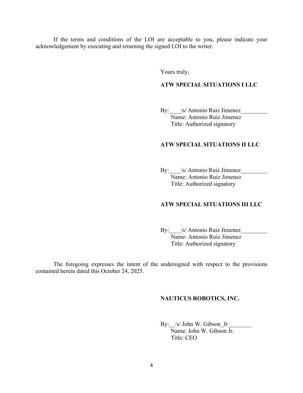 4 If the terms and conditions of the LOI are acceptable to you, please indicate your acknowledgement by executing and returning the signed LOI to the writer. Yours truly, ATW SPECIAL SITUATIONS I LLC By:____/s/ Antonio Ruiz Jimenez_________ Name: Antonio Ruiz Jimenez Title: Authorized signatory ATW SPECIAL SITUATIONS II LLC By:____/s/ Antonio Ruiz Jimenez_________ Name: Antonio Ruiz Jimenez Title: Authorized signatory ATW SPECIAL SITUATIONS III LLC By:____/s/ Antonio Ruiz Jimenez_________ Name: Antonio Ruiz Jimenez Title: Authorized signatory The foregoing expresses the intent of the undersigned with respect to the provisions contained herein dated this October 24, 2025. NAUTICUS ROBOTICS, INC. By:__/s/ John W. Gibson_Jr________ Name: John W. Gibson Jr. Title: CEO