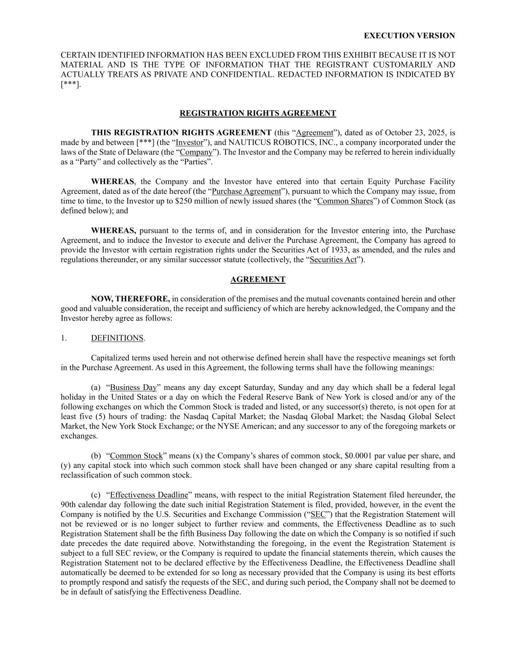 EXECUTION VERSION CERTAIN IDENTIFIED INFORMATION HAS BEEN EXCLUDED FROM THIS EXHIBIT BECAUSE IT IS NOT MATERIAL AND IS THE TYPE OF INFORMATION THAT THE REGISTRANT CUSTOMARILY AND ACTUALLY TREATS AS PRIVATE AND CONFIDENTIAL. REDACTED INFORMATION IS INDICATED BY [***]. REGISTRATION RIGHTS AGREEMENT THIS REGISTRATION RIGHTS AGREEMENT (this “Agreement”), dated as of October 23, 2025, is made by and between [***] (the “Investor”), and NAUTICUS ROBOTICS, INC., a company incorporated under the laws of the State of Delaware (the “Company”). The Investor and the Company may be referred to herein individually as a “Party” and collectively as the “Parties”. WHEREAS, the Company and the Investor have entered into that certain Equity Purchase Facility Agreement, dated as of the date hereof (the “Purchase Agreement”), pursuant to which the Company may issue, from time to time, to the Investor up to $250 million of newly issued shares (the “Common Shares”) of Common Stock (as defined below); and WHEREAS, pursuant to the terms of, and in consideration for the Investor entering into, the Purchase Agreement, and to induce the Investor to execute and deliver the Purchase Agreement, the Company has agreed to provide the Investor with certain registration rights under the Securities Act of 1933, as amended, and the rules and regulations thereunder, or any similar successor statute (collectively, the “Securities Act”). AGREEMENT NOW, THEREFORE, in consideration of the premises and the mutual covenants contained herein and other good and valuable consideration, the receipt and sufficiency of which are hereby acknowledged, the Company and the Investor hereby agree as follows: 1. DEFINITIONS. Capitalized terms used herein and not otherwise defined herein shall have the respective meanings set forth in the Purchase Agreement. As used in this Agreement, the following terms shall have the following meanings: (a) “Business Day” means any day except Saturday, Sunday and any day which shall be a federal legal holiday in the United States or a day on which the Federal Reserve Bank of New York is closed and/or any of the following exchanges on which the Common Stock is traded and listed, or any successor(s) thereto, is not open for at least five (5) hours of trading: the Nasdaq Capital Market; the Nasdaq Global Market; the Nasdaq Global Select Market, the New York Stock Exchange; or the NYSE American; and any successor to any of the foregoing markets or exchanges. (b) “Common Stock” means (x) the Company’s shares of common stock, $0.0001 par value per share, and (y) any capital stock into which such common stock shall have been changed or any share capital resulting from a reclassification of such common stock. (c) “Effectiveness Deadline” means, with respect to the initial Registration Statement filed hereunder, the 90th calendar day following the date such initial Registration Statement is filed, provided, however, in the event the Company is notified by the U.S. Securities and Exchange Commission (“SEC”) that the Registration Statement will not be reviewed or is no longer subject to further review and comments, the Effectiveness Deadline as to such Registration Statement shall be the fifth Business Day following the date on which the Company is so notified if such date precedes the date required above. Notwithstanding the foregoing, in the event the Registration Statement is subject to a full SEC review, or the Company is required to update the financial statements therein, which causes the Registration Statement not to be declared effective by the Effectiveness Deadline, the Effectiveness Deadline shall automatically be deemed to be extended for so long as necessary provided that the Company is using its best efforts to promptly respond and satisfy the requests of the SEC, and during such period, the Company shall not be deemed to be in default of satisfying the Effectiveness Deadline.