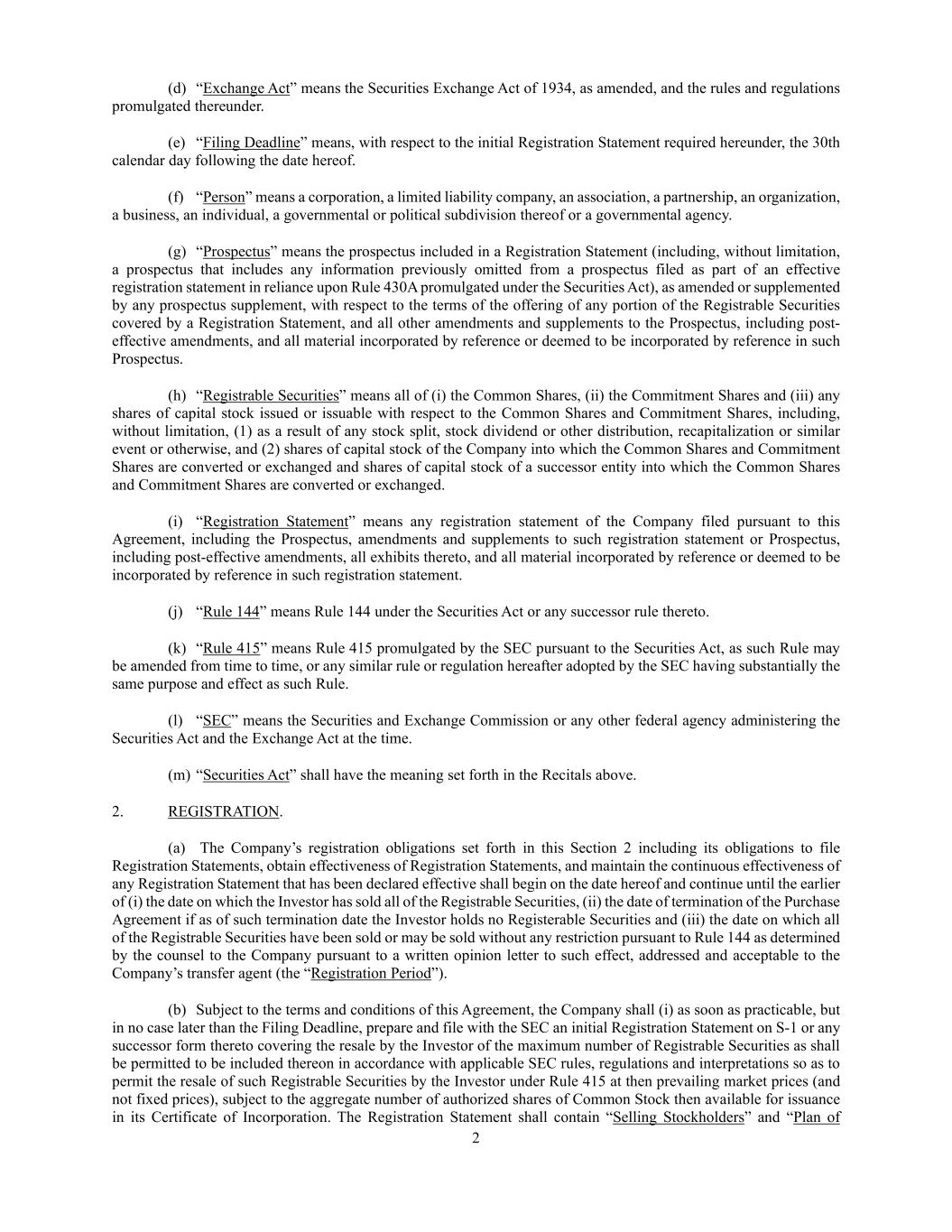 2 (d) “Exchange Act” means the Securities Exchange Act of 1934, as amended, and the rules and regulations promulgated thereunder. (e) “Filing Deadline” means, with respect to the initial Registration Statement required hereunder, the 30th calendar day following the date hereof. (f) “Person” means a corporation, a limited liability company, an association, a partnership, an organization, a business, an individual, a governmental or political subdivision thereof or a governmental agency. (g) “Prospectus” means the prospectus included in a Registration Statement (including, without limitation, a prospectus that includes any information previously omitted from a prospectus filed as part of an effective registration statement in reliance upon Rule 430A promulgated under the Securities Act), as amended or supplemented by any prospectus supplement, with respect to the terms of the offering of any portion of the Registrable Securities covered by a Registration Statement, and all other amendments and supplements to the Prospectus, including post- effective amendments, and all material incorporated by reference or deemed to be incorporated by reference in such Prospectus. (h) “Registrable Securities” means all of (i) the Common Shares, (ii) the Commitment Shares and (iii) any shares of capital stock issued or issuable with respect to the Common Shares and Commitment Shares, including, without limitation, (1) as a result of any stock split, stock dividend or other distribution, recapitalization or similar event or otherwise, and (2) shares of capital stock of the Company into which the Common Shares and Commitment Shares are converted or exchanged and shares of capital stock of a successor entity into which the Common Shares and Commitment Shares are converted or exchanged. (i) “Registration Statement” means any registration statement of the Company filed pursuant to this Agreement, including the Prospectus, amendments and supplements to such registration statement or Prospectus, including post-effective amendments, all exhibits thereto, and all material incorporated by reference or deemed to be incorporated by reference in such registration statement. (j) “Rule 144” means Rule 144 under the Securities Act or any successor rule thereto. (k) “Rule 415” means Rule 415 promulgated by the SEC pursuant to the Securities Act, as such Rule may be amended from time to time, or any similar rule or regulation hereafter adopted by the SEC having substantially the same purpose and effect as such Rule. (l) “SEC” means the Securities and Exchange Commission or any other federal agency administering the Securities Act and the Exchange Act at the time. (m) “Securities Act” shall have the meaning set forth in the Recitals above. 2. REGISTRATION. (a) The Company’s registration obligations set forth in this Section 2 including its obligations to file Registration Statements, obtain effectiveness of Registration Statements, and maintain the continuous effectiveness of any Registration Statement that has been declared effective shall begin on the date hereof and continue until the earlier of (i) the date on which the Investor has sold all of the Registrable Securities, (ii) the date of termination of the Purchase Agreement if as of such termination date the Investor holds no Registerable Securities and (iii) the date on which all of the Registrable Securities have been sold or may be sold without any restriction pursuant to Rule 144 as determined by the counsel to the Company pursuant to a written opinion letter to such effect, addressed and acceptable to the Company’s transfer agent (the “Registration Period”). (b) Subject to the terms and conditions of this Agreement, the Company shall (i) as soon as practicable, but in no case later than the Filing Deadline, prepare and file with the SEC an initial Registration Statement on S-1 or any successor form thereto covering the resale by the Investor of the maximum number of Registrable Securities as shall be permitted to be included thereon in accordance with applicable SEC rules, regulations and interpretations so as to permit the resale of such Registrable Securities by the Investor under Rule 415 at then prevailing market prices (and not fixed prices), subject to the aggregate number of authorized shares of Common Stock then available for issuance in its Certificate of Incorporation. The Registration Statement shall contain “Selling Stockholders” and “Plan of