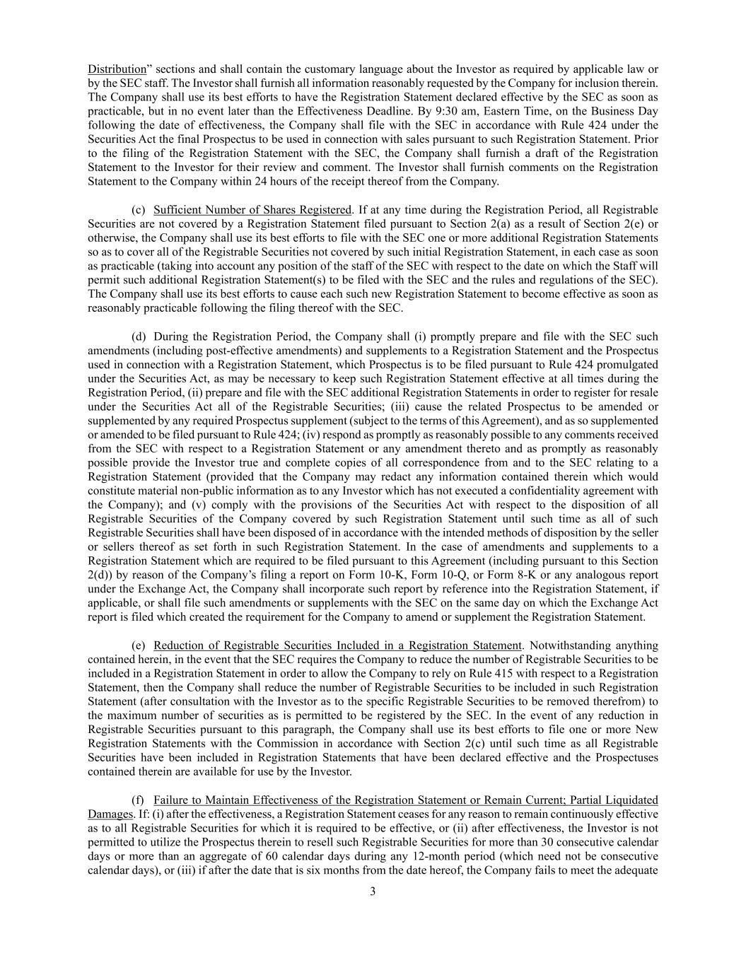 3 Distribution” sections and shall contain the customary language about the Investor as required by applicable law or by the SEC staff. The Investor shall furnish all information reasonably requested by the Company for inclusion therein. The Company shall use its best efforts to have the Registration Statement declared effective by the SEC as soon as practicable, but in no event later than the Effectiveness Deadline. By 9:30 am, Eastern Time, on the Business Day following the date of effectiveness, the Company shall file with the SEC in accordance with Rule 424 under the Securities Act the final Prospectus to be used in connection with sales pursuant to such Registration Statement. Prior to the filing of the Registration Statement with the SEC, the Company shall furnish a draft of the Registration Statement to the Investor for their review and comment. The Investor shall furnish comments on the Registration Statement to the Company within 24 hours of the receipt thereof from the Company. (c) Sufficient Number of Shares Registered. If at any time during the Registration Period, all Registrable Securities are not covered by a Registration Statement filed pursuant to Section 2(a) as a result of Section 2(e) or otherwise, the Company shall use its best efforts to file with the SEC one or more additional Registration Statements so as to cover all of the Registrable Securities not covered by such initial Registration Statement, in each case as soon as practicable (taking into account any position of the staff of the SEC with respect to the date on which the Staff will permit such additional Registration Statement(s) to be filed with the SEC and the rules and regulations of the SEC). The Company shall use its best efforts to cause each such new Registration Statement to become effective as soon as reasonably practicable following the filing thereof with the SEC. (d) During the Registration Period, the Company shall (i) promptly prepare and file with the SEC such amendments (including post-effective amendments) and supplements to a Registration Statement and the Prospectus used in connection with a Registration Statement, which Prospectus is to be filed pursuant to Rule 424 promulgated under the Securities Act, as may be necessary to keep such Registration Statement effective at all times during the Registration Period, (ii) prepare and file with the SEC additional Registration Statements in order to register for resale under the Securities Act all of the Registrable Securities; (iii) cause the related Prospectus to be amended or supplemented by any required Prospectus supplement (subject to the terms of this Agreement), and as so supplemented or amended to be filed pursuant to Rule 424; (iv) respond as promptly as reasonably possible to any comments received from the SEC with respect to a Registration Statement or any amendment thereto and as promptly as reasonably possible provide the Investor true and complete copies of all correspondence from and to the SEC relating to a Registration Statement (provided that the Company may redact any information contained therein which would constitute material non-public information as to any Investor which has not executed a confidentiality agreement with the Company); and (v) comply with the provisions of the Securities Act with respect to the disposition of all Registrable Securities of the Company covered by such Registration Statement until such time as all of such Registrable Securities shall have been disposed of in accordance with the intended methods of disposition by the seller or sellers thereof as set forth in such Registration Statement. In the case of amendments and supplements to a Registration Statement which are required to be filed pursuant to this Agreement (including pursuant to this Section 2(d)) by reason of the Company’s filing a report on Form 10-K, Form 10-Q, or Form 8-K or any analogous report under the Exchange Act, the Company shall incorporate such report by reference into the Registration Statement, if applicable, or shall file such amendments or supplements with the SEC on the same day on which the Exchange Act report is filed which created the requirement for the Company to amend or supplement the Registration Statement. (e) Reduction of Registrable Securities Included in a Registration Statement. Notwithstanding anything contained herein, in the event that the SEC requires the Company to reduce the number of Registrable Securities to be included in a Registration Statement in order to allow the Company to rely on Rule 415 with respect to a Registration Statement, then the Company shall reduce the number of Registrable Securities to be included in such Registration Statement (after consultation with the Investor as to the specific Registrable Securities to be removed therefrom) to the maximum number of securities as is permitted to be registered by the SEC. In the event of any reduction in Registrable Securities pursuant to this paragraph, the Company shall use its best efforts to file one or more New Registration Statements with the Commission in accordance with Section 2(c) until such time as all Registrable Securities have been included in Registration Statements that have been declared effective and the Prospectuses contained therein are available for use by the Investor. (f) Failure to Maintain Effectiveness of the Registration Statement or Remain Current; Partial Liquidated Damages. If: (i) after the effectiveness, a Registration Statement ceases for any reason to remain continuously effective as to all Registrable Securities for which it is required to be effective, or (ii) after effectiveness, the Investor is not permitted to utilize the Prospectus therein to resell such Registrable Securities for more than 30 consecutive calendar days or more than an aggregate of 60 calendar days during any 12-month period (which need not be consecutive calendar days), or (iii) if after the date that is six months from the date 
