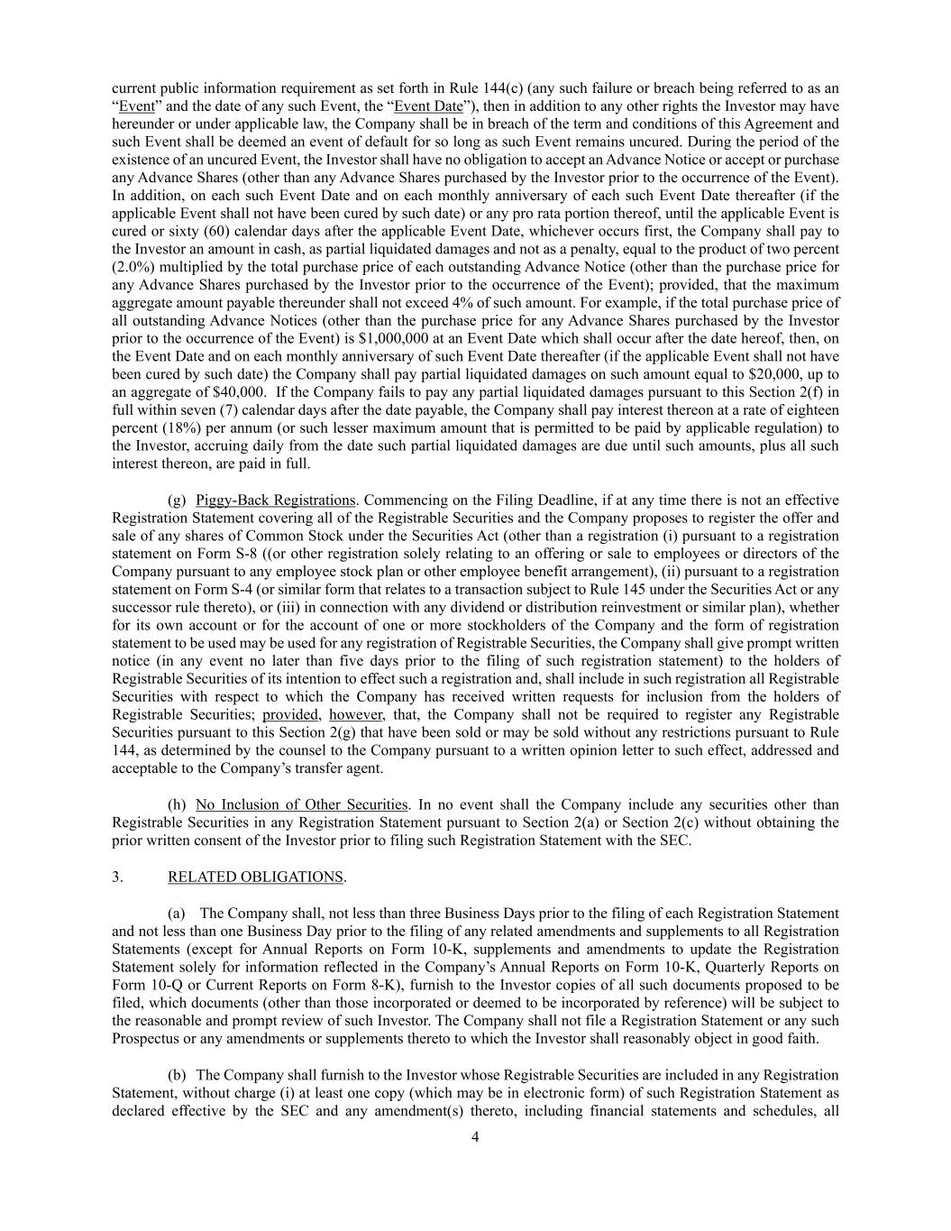 4 current public information requirement as set forth in Rule 144(c) (any such failure or breach being referred to as an “Event” and the date of any such Event, the “Event Date”), then in addition to any other rights the Investor may have hereunder or under applicable law, the Company shall be in breach of the term and conditions of this Agreement and such Event shall be deemed an event of default for so long as such Event remains uncured. During the period of the existence of an uncured Event, the Investor shall have no obligation to accept an Advance Notice or accept or purchase any Advance Shares (other than any Advance Shares purchased by the Investor prior to the occurrence of the Event). In addition, on each such Event Date and on each monthly anniversary of each such Event Date thereafter (if the applicable Event shall not have been cured by such date) or any pro rata portion thereof, until the applicable Event is cured or sixty (60) calendar days after the applicable Event Date, whichever occurs first, the Company shall pay to the Investor an amount in cash, as partial liquidated damages and not as a penalty, equal to the product of two percent (2.0%) multiplied by the total purchase price of each outstanding Advance Notice (other than the purchase price for any Advance Shares purchased by the Investor prior to the occurrence of the Event); provided, that the maximum aggregate amount payable thereunder shall not exceed 4% of such amount. For example, if the total purchase price of all outstanding Advance Notices (other than the purchase price for any Advance Shares purchased by the Investor prior to the occurrence of the Event) is $1,000,000 at an Event Date which shall occur after the date hereof, then, on the Event Date and on each monthly anniversary of such Event Date thereafter (if the applicable Event shall not have been cured by such date) the Company shall pay partial liquidated damages on such amount equal to $20,000, up to an aggregate of $40,000. If the Company fails to pay any partial liquidated damages pursuant to this Section 2(f) in full within seven (7) calendar days after the date payable, the Company shall pay interest thereon at a rate of eighteen percent (18%) per annum (or such lesser maximum amount that is permitted to be paid by applicable regulation) to the Investor, accruing daily from the date such partial liquidated damages are due until such amounts, plus all such interest thereon, are paid in full. (g) Piggy-Back Registrations. Commencing on the Filing Deadline, if at any time there is not an effective Registration Statement covering all of the Registrable Securities and the Company proposes to register the offer and sale of any shares of Common Stock under the Securities Act (other than a registration (i) pursuant to a registration statement on Form S-8 ((or other registration solely relating to an offering or sale to employees or directors of the Company pursuant to any employee stock plan or other employee benefit arrangement), (ii) pursuant to a registration statement on Form S-4 (or similar form that relates to a transaction subject to Rule 145 under the Securities Act or any successor rule thereto), or (iii) in connection with any dividend or distribution reinvestment or similar plan), whether for its own account or for the account of one or more stockholders of the Company and the form of registration statement to be used may be used for any registration of Registrable Securities, the Company shall give prompt written notice (in any event no later than five days prior to the filing of such registration statement) to the holders of Registrable Securities of its intention to effect such a registration and, shall include in such registration all Registrable Securities with respect to which the Company has received written requests for inclusion from the holders of Registrable Securities; provided, however, that, the Company shall not be required to register any Registrable Securities pursuant to this Section 2(g) that have been sold or may be sold without any restrictions pursuant to Rule 144, as determined by the counsel to the Company pursuant to a written opinion letter to such effect, addressed and acceptable to the Company’s transfer agent. (h) No Inclusion of Other Securities. In no event shall the Company include any securities other than Registrable Securities in any Registration Statement pursuant to Section 2(a) or Section 2(c) without obtaining the prior written consent of the Investor prior to filing such Registration Statement with the SEC. 3. RELATED OBLIGATIONS. (a) The Company shall, not less than three Business Days prior to the filing of each Registration Statement and not less than one Business Day prior to the filing of any related amendments and supplements to all Registration Statements (except for Annual Reports on Form 10-K, supplements and amendments to update the Registration Statement solely for information reflected in the Company’s Annual Reports on Form 10-K, Quarterly Reports on Form 10-Q or Current Reports on Form 8-K), furnish to the Investor copies of all such documents proposed to be filed, which documents (other than those incorporated or deemed to be incorporated by reference) will be subject to the reasonable and prompt review of such Investor. The Company shall not file a Registration Statement or any such Prospectus or any amendments or supplements thereto to which the Investor shall reasonably object in good faith. (b) The Company shall furnish to the Investor whose Registrable Securities are included in any Registration Statement, without charge (i) at least one copy (which may be in electronic form) of such Registration Statement as declared effective by the SEC and any amendment(s) thereto, including financial statements and schedules, all
