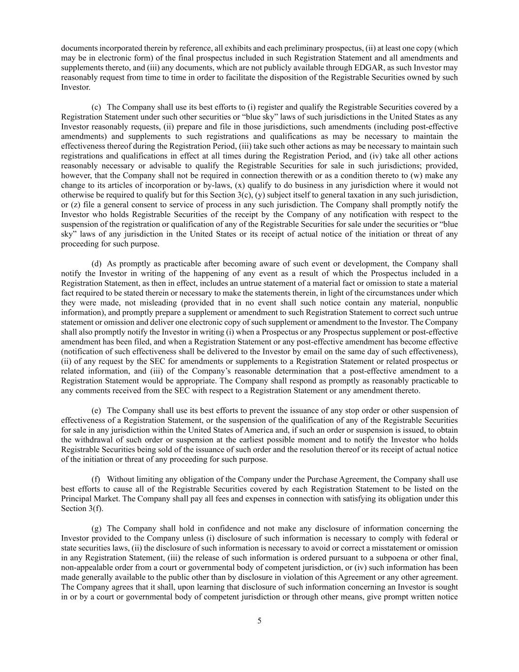 5 documents incorporated therein by reference, all exhibits and each preliminary prospectus, (ii) at least one copy (which may be in electronic form) of the final prospectus included in such Registration Statement and all amendments and supplements thereto, and (iii) any documents, which are not publicly available through EDGAR, as such Investor may reasonably request from time to time in order to facilitate the disposition of the Registrable Securities owned by such Investor. (c) The Company shall use its best efforts to (i) register and qualify the Registrable Securities covered by a Registration Statement under such other securities or “blue sky” laws of such jurisdictions in the United States as any Investor reasonably requests, (ii) prepare and file in those jurisdictions, such amendments (including post-effective amendments) and supplements to such registrations and qualifications as may be necessary to maintain the effectiveness thereof during the Registration Period, (iii) take such other actions as may be necessary to maintain such registrations and qualifications in effect at all times during the Registration Period, and (iv) take all other actions reasonably necessary or advisable to qualify the Registrable Securities for sale in such jurisdictions; provided, however, that the Company shall not be required in connection therewith or as a condition thereto to (w) make any change to its articles of incorporation or by-laws, (x) qualify to do business in any jurisdiction where it would not otherwise be required to qualify but for this Section 3(c), (y) subject itself to general taxation in any such jurisdiction, or (z) file a general consent to service of process in any such jurisdiction. The Company shall promptly notify the Investor who holds Registrable Securities of the receipt by the Company of any notification with respect to the suspension of the registration or qualification of any of the Registrable Securities for sale under the securities or “blue sky” laws of any jurisdiction in the United States or its receipt of actual notice of the initiation or threat of any proceeding for such purpose. (d) As promptly as practicable after becoming aware of such event or development, the Company shall notify the Investor in writing of the happening of any event as a result of which the Prospectus included in a Registration Statement, as then in effect, includes an untrue statement of a material fact or omission to state a material fact required to be stated therein or necessary to make the statements therein, in light of the circumstances under which they were made, not misleading (provided that in no event shall such notice contain any material, nonpublic information), and promptly prepare a supplement or amendment to such Registration Statement to correct such untrue statement or omission and deliver one electronic copy of such supplement or amendment to the Investor. The Company shall also promptly notify the Investor in writing (i) when a Prospectus or any Prospectus supplement or post-effective amendment has been filed, and when a Registration Statement or any post-effective amendment has become effective (notification of such effectiveness shall be delivered to the Investor by email on the same day of such effectiveness), (ii) of any request by the SEC for amendments or supplements to a Registration Statement or related prospectus or related information, and (iii) of the Company’s reasonable determination that a post-effective amendment to a Registration Statement would be appropriate. The Company shall respond as promptly as reasonably practicable to any comments received from the SEC with respect to a Registration Statement or any amendment thereto. (e) The Company shall use its best efforts to prevent the issuance of any stop order or other suspension of effectiveness of a Registration Statement, or the suspension of the qualification of any of the Registrable Securities for sale in any jurisdiction within the United States of America and, if such an order or suspension is issued, to obtain the withdrawal of such order or suspension at the earliest possible moment and to notify the Investor who holds Registrable Securities being sold of the issuance of such order and the resolution thereof or its receipt of actual notice of the initiation or threat of any proceeding for such purpose. (f) Without limiting any obligation of the Company under the Purchase Agreement, the Company shall use best efforts to cause all of the Registrable Securities covered by each Registration Statement to be listed on the Principal Market. The Company shall pay all fees and expenses in connection with satisfying its obligation under this Section 3(f). (g) The Company shall hold in confidence and not make any disclosure of information concerning the Investor provided to the Company unless (i) disclosure of such information is necessary to comply with federal or state securities laws, (ii) the disclosure of such information is necessary to avoid or correct a misstatement or omission in any Registration Statement, (iii) the release of such information is ordered pursuant to a subpoena or other final, non-appealable order from a court or governmental body of competent jurisdiction, or (iv) such information has been made generally available to the public other than by disclosure in violation of this Agreement or any other agreement. The Company agrees that it shall, upon learning that disclosure of such information concerning an Investor is sought in or by a court or governmental body of competent jurisdiction or through other means, give prompt written notice