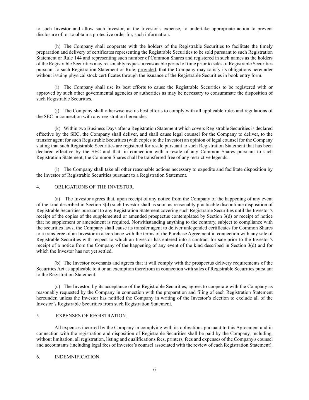 6 to such Investor and allow such Investor, at the Investor’s expense, to undertake appropriate action to prevent disclosure of, or to obtain a protective order for, such information. (h) The Company shall cooperate with the holders of the Registrable Securities to facilitate the timely preparation and delivery of certificates representing the Registrable Securities to be sold pursuant to such Registration Statement or Rule 144 and representing such number of Common Shares and registered in such names as the holders of the Registrable Securities may reasonably request a reasonable period of time prior to sales of Registrable Securities pursuant to such Registration Statement or Rule; provided, that the Company may satisfy its obligations hereunder without issuing physical stock certificates through the issuance of the Registrable Securities in book entry form. (i) The Company shall use its best efforts to cause the Registrable Securities to be registered with or approved by such other governmental agencies or authorities as may be necessary to consummate the disposition of such Registrable Securities. (j) The Company shall otherwise use its best efforts to comply with all applicable rules and regulations of the SEC in connection with any registration hereunder. (k) Within two Business Days after a Registration Statement which covers Registrable Securities is declared effective by the SEC, the Company shall deliver, and shall cause legal counsel for the Company to deliver, to the transfer agent for such Registrable Securities (with copies to the Investor) an opinion of legal counsel for the Company stating that such Registrable Securities are registered for resale pursuant to such Registration Statement that has been declared effective by the SEC and that, in connection with a resale of any Common Shares pursuant to such Registration Statement, the Common Shares shall be transferred free of any restrictive legends. (l) The Company shall take all other reasonable actions necessary to expedite and facilitate disposition by the Investor of Registrable Securities pursuant to a Registration Statement. 4. OBLIGATIONS OF THE INVESTOR. (a) The Investor agrees that, upon receipt of any notice from the Company of the happening of any event of the kind described in Section 3(d) such Investor shall as soon as reasonably practicable discontinue disposition of Registrable Securities pursuant to any Registration Statement covering such Registrable Securities until the Investor’s receipt of the copies of the supplemented or amended prospectus contemplated by Section 3(d) or receipt of notice that no supplement or amendment is required. Notwithstanding anything to the contrary, subject to compliance with the securities laws, the Company shall cause its transfer agent to deliver unlegended certificates for Common Shares to a transferee of an Investor in accordance with the terms of the Purchase Agreement in connection with any sale of Registrable Securities with respect to which an Investor has entered into a contract for sale prior to the Investor’s receipt of a notice from the Company of the happening of any event of the kind described in Section 3(d) and for which the Investor has not yet settled. (b) The Investor covenants and agrees that it will comply with the prospectus delivery requirements of the Securities Act as applicable to it or an exemption therefrom in connection with sales of Registrable Securities pursuant to the Registration Statement. (c) The Investor, by its acceptance of the Registrable Securities, agrees to cooperate with the Company as reasonably requested by the Company in connection with the preparation and filing of each Registration Statement hereunder, unless the Investor has notified the Company in writing of the Investor’s election to exclude all of the Investor’s Registrable Securities from such Registration Statement. 5. EXPENSES OF REGISTRATION. All expenses incurred by the Company in complying with its obligations pursuant to this Agreement and in connection with the registration and disposition of Registrable Securities shall be paid by the Company, including, without limitation, all registration, listing and qualifications fees, printers, fees and expenses of the Company's counsel and accountants (including legal fees of Investor’s counsel associated with the review of each Registration Statement). 6. INDEMNIFICATION.