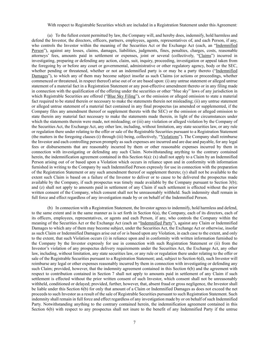 7 With respect to Registrable Securities which are included in a Registration Statement under this Agreement: (a) To the fullest extent permitted by law, the Company will, and hereby does, indemnify, hold harmless and defend the Investor, the directors, officers, partners, employees, agents, representatives of, and each Person, if any, who controls the Investor within the meaning of the Securities Act or the Exchange Act (each, an “Indemnified Person”), against any losses, claims, damages, liabilities, judgments, fines, penalties, charges, costs, reasonable attorneys’ fees, amounts paid in settlement or expenses, joint or several (collectively, “Claims”) incurred in investigating, preparing or defending any action, claim, suit, inquiry, proceeding, investigation or appeal taken from the foregoing by or before any court or governmental, administrative or other regulatory agency, body or the SEC, whether pending or threatened, whether or not an indemnified party is or may be a party thereto (“Indemnified Damages”), to which any of them may become subject insofar as such Claims (or actions or proceedings, whether commenced or threatened, in respect thereof) arise out of or are based upon: (i) any untrue statement or alleged untrue statement of a material fact in a Registration Statement or any post-effective amendment thereto or in any filing made in connection with the qualification of the offering under the securities or other “blue sky” laws of any jurisdiction in which Registrable Securities are offered (“Blue Sky Filing”), or the omission or alleged omission to state a material fact required to be stated therein or necessary to make the statements therein not misleading; (ii) any untrue statement or alleged untrue statement of a material fact contained in any final prospectus (as amended or supplemented, if the Company files any amendment thereof or supplement thereto with the SEC) or the omission or alleged omission to state therein any material fact necessary to make the statements made therein, in light of the circumstances under which the statements therein were made, not misleading; or (iii) any violation or alleged violation by the Company of the Securities Act, the Exchange Act, any other law, including, without limitation, any state securities law, or any rule or regulation there under relating to the offer or sale of the Registrable Securities pursuant to a Registration Statement (the matters in the foregoing clauses (i) through (iii) being, collectively, “Violations”). The Company shall reimburse the Investor and each controlling person promptly as such expenses are incurred and are due and payable, for any legal fees or disbursements that are reasonably incurred by them or other reasonable expenses incurred by them in connection with investigating or defending any such Claim. Notwithstanding anything to the contrary contained herein, the indemnification agreement contained in this Section 6(a): (x) shall not apply to a Claim by an Indemnified Person arising out of or based upon a Violation which occurs in reliance upon and in conformity with information furnished in writing to the Company by such Indemnified Person expressly for use in connection with the preparation of the Registration Statement or any such amendment thereof or supplement thereto; (y) shall not be available to the extent such Claim is based on a failure of the Investor to deliver or to cause to be delivered the prospectus made available by the Company, if such prospectus was timely made available by the Company pursuant to Section 3(b); and (z) shall not apply to amounts paid in settlement of any Claim if such settlement is effected without the prior written consent of the Company, which consent shall not be unreasonably withheld. Such indemnity shall remain in full force and effect regardless of any investigation made by or on behalf of the Indemnified Person. (b) In connection with a Registration Statement, the Investor agrees to indemnify, hold harmless and defend, to the same extent and in the same manner as is set forth in Section 6(a), the Company, each of its directors, each of its officers, employees, representatives, or agents and each Person, if any, who controls the Company within the meaning of the Securities Act or the Exchange Act (each an “Indemnified Party”), against any Claim or Indemnified Damages to which any of them may become subject, under the Securities Act, the Exchange Act or otherwise, insofar as such Claim or Indemnified Damages arise out of or is based upon any Violation, in each case to the extent, and only to the extent, that such Violation occurs (i) in reliance upon and in conformity with written information furnished to the Company by the Investor expressly for use in connection with such Registration Statement or (ii) from the Investor’s violation of any prospectus delivery requirements under the Securities Act, the Exchange Act, any other law, including, without limitation, any state securities law, or any rule or regulation there under relating to the offer or sale of the Registrable Securities pursuant to a Registration Statement; and, subject to Section 6(d), such Investor will reimburse any legal or other expenses reasonably incurred by them in connection with investigating or defending any such Claim; provided, however, that the indemnity agreement contained in this Section 6(b) and the agreement with respect to contribution contained in Section 7 shall not apply to amounts paid in settlement of any Claim if such settlement is effected without the prior written consent of such Investor, which consent shall not be unreasonably withheld, conditioned or delayed; provided, further, however, that, absent fraud or gross negligence, the Investor shall be liable under this Section 6(b) for only that amount of a Claim or Indemnified Damages as does not exceed the net proceeds to such Investor as a result of the sale of Registrable Securities pur