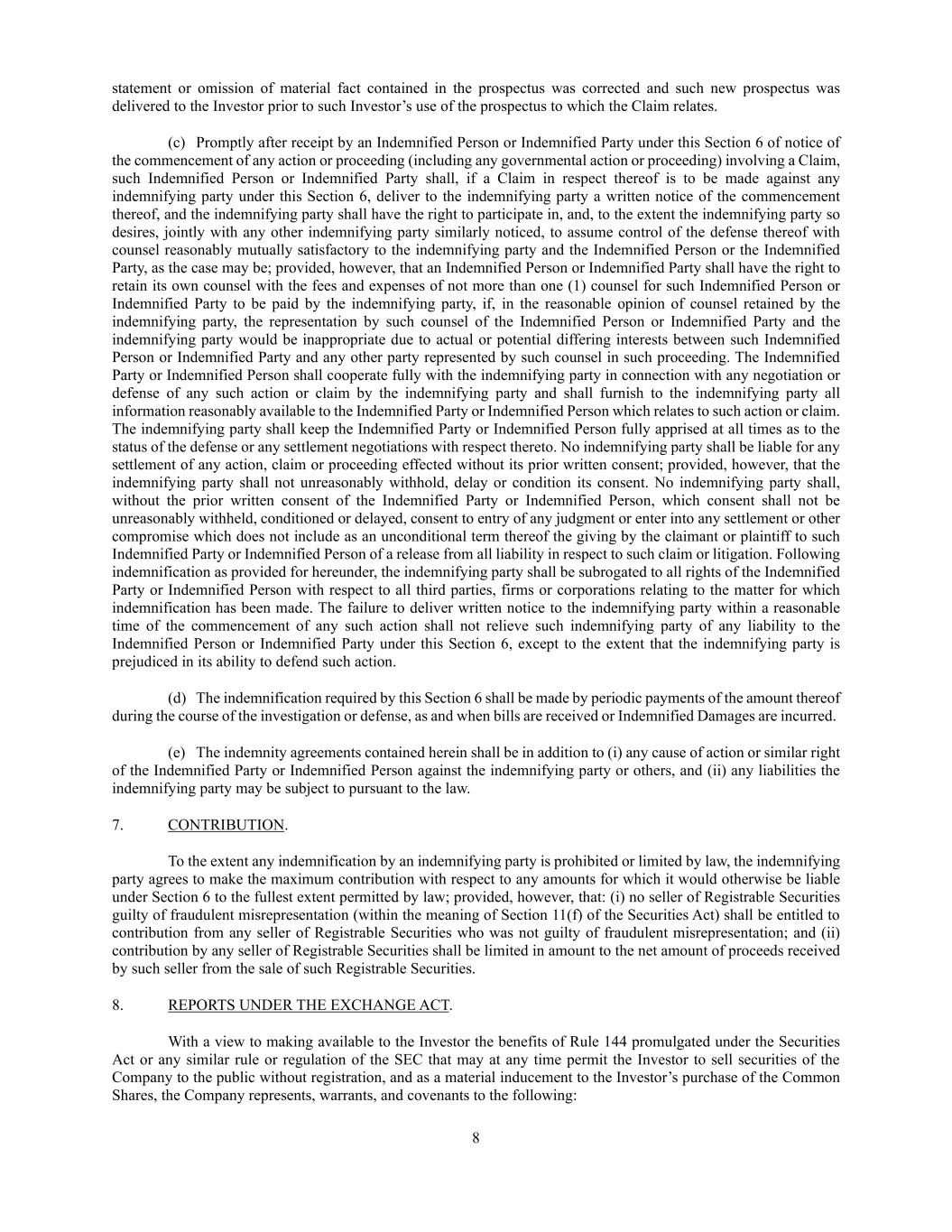 8 statement or omission of material fact contained in the prospectus was corrected and such new prospectus was delivered to the Investor prior to such Investor’s use of the prospectus to which the Claim relates. (c) Promptly after receipt by an Indemnified Person or Indemnified Party under this Section 6 of notice of the commencement of any action or proceeding (including any governmental action or proceeding) involving a Claim, such Indemnified Person or Indemnified Party shall, if a Claim in respect thereof is to be made against any indemnifying party under this Section 6, deliver to the indemnifying party a written notice of the commencement thereof, and the indemnifying party shall have the right to participate in, and, to the extent the indemnifying party so desires, jointly with any other indemnifying party similarly noticed, to assume control of the defense thereof with counsel reasonably mutually satisfactory to the indemnifying party and the Indemnified Person or the Indemnified Party, as the case may be; provided, however, that an Indemnified Person or Indemnified Party shall have the right to retain its own counsel with the fees and expenses of not more than one (1) counsel for such Indemnified Person or Indemnified Party to be paid by the indemnifying party, if, in the reasonable opinion of counsel retained by the indemnifying party, the representation by such counsel of the Indemnified Person or Indemnified Party and the indemnifying party would be inappropriate due to actual or potential differing interests between such Indemnified Person or Indemnified Party and any other party represented by such counsel in such proceeding. The Indemnified Party or Indemnified Person shall cooperate fully with the indemnifying party in connection with any negotiation or defense of any such action or claim by the indemnifying party and shall furnish to the indemnifying party all information reasonably available to the Indemnified Party or Indemnified Person which relates to such action or claim. The indemnifying party shall keep the Indemnified Party or Indemnified Person fully apprised at all times as to the status of the defense or any settlement negotiations with respect thereto. No indemnifying party shall be liable for any settlement of any action, claim or proceeding effected without its prior written consent; provided, however, that the indemnifying party shall not unreasonably withhold, delay or condition its consent. No indemnifying party shall, without the prior written consent of the Indemnified Party or Indemnified Person, which consent shall not be unreasonably withheld, conditioned or delayed, consent to entry of any judgment or enter into any settlement or other compromise which does not include as an unconditional term thereof the giving by the claimant or plaintiff to such Indemnified Party or Indemnified Person of a release from all liability in respect to such claim or litigation. Following indemnification as provided for hereunder, the indemnifying party shall be subrogated to all rights of the Indemnified Party or Indemnified Person with respect to all third parties, firms or corporations relating to the matter for which indemnification has been made. The failure to deliver written notice to the indemnifying party within a reasonable time of the commencement of any such action shall not relieve such indemnifying party of any liability to the Indemnified Person or Indemnified Party under this Section 6, except to the extent that the indemnifying party is prejudiced in its ability to defend such action. (d) The indemnification required by this Section 6 shall be made by periodic payments of the amount thereof during the course of the investigation or defense, as and when bills are received or Indemnified Damages are incurred. (e) The indemnity agreements contained herein shall be in addition to (i) any cause of action or similar right of the Indemnified Party or Indemnified Person against the indemnifying party or others, and (ii) any liabilities the indemnifying party may be subject to pursuant to the law. 7. CONTRIBUTION. To the extent any indemnification by an indemnifying party is prohibited or limited by law, the indemnifying party agrees to make the maximum contribution with respect to any amounts for which it would otherwise be liable under Section 6 to the fullest extent permitted by law; provided, however, that: (i) no seller of Registrable Securities guilty of fraudulent misrepresentation (within the meaning of Section 11(f) of the Securities Act) shall be entitled to contribution from any seller of Registrable Securities who was not guilty of fraudulent misrepresentation; and (ii) contribution by any seller of Registrable Securities shall be limited in amount to the net amount of proceeds received by such seller from the sale of such Registrable Securities. 8. REPORTS UNDER THE EXCHANGE ACT. With a view to making available to the Investor the benefits of Rule 144 promulgated under the Securities Act or any similar rule or regulation of the SEC that may at any time permit the Investor to sell securities of the Company to the public without registration, and as a material inducement to the Investor’s purchase of the Common Shares, the Company represents, warrants, and covenants to the following: