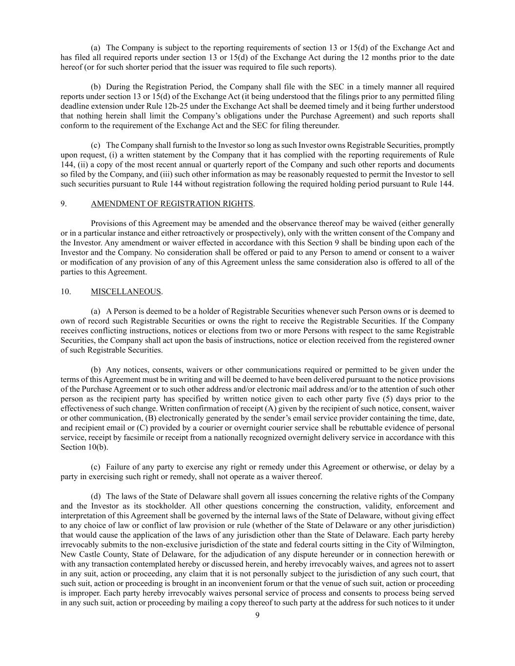9 (a) The Company is subject to the reporting requirements of section 13 or 15(d) of the Exchange Act and has filed all required reports under section 13 or 15(d) of the Exchange Act during the 12 months prior to the date hereof (or for such shorter period that the issuer was required to file such reports). (b) During the Registration Period, the Company shall file with the SEC in a timely manner all required reports under section 13 or 15(d) of the Exchange Act (it being understood that the filings prior to any permitted filing deadline extension under Rule 12b-25 under the Exchange Act shall be deemed timely and it being further understood that nothing herein shall limit the Company’s obligations under the Purchase Agreement) and such reports shall conform to the requirement of the Exchange Act and the SEC for filing thereunder. (c) The Company shall furnish to the Investor so long as such Investor owns Registrable Securities, promptly upon request, (i) a written statement by the Company that it has complied with the reporting requirements of Rule 144, (ii) a copy of the most recent annual or quarterly report of the Company and such other reports and documents so filed by the Company, and (iii) such other information as may be reasonably requested to permit the Investor to sell such securities pursuant to Rule 144 without registration following the required holding period pursuant to Rule 144. 9. AMENDMENT OF REGISTRATION RIGHTS. Provisions of this Agreement may be amended and the observance thereof may be waived (either generally or in a particular instance and either retroactively or prospectively), only with the written consent of the Company and the Investor. Any amendment or waiver effected in accordance with this Section 9 shall be binding upon each of the Investor and the Company. No consideration shall be offered or paid to any Person to amend or consent to a waiver or modification of any provision of any of this Agreement unless the same consideration also is offered to all of the parties to this Agreement. 10. MISCELLANEOUS. (a) A Person is deemed to be a holder of Registrable Securities whenever such Person owns or is deemed to own of record such Registrable Securities or owns the right to receive the Registrable Securities. If the Company receives conflicting instructions, notices or elections from two or more Persons with respect to the same Registrable Securities, the Company shall act upon the basis of instructions, notice or election received from the registered owner of such Registrable Securities. (b) Any notices, consents, waivers or other communications required or permitted to be given under the terms of this Agreement must be in writing and will be deemed to have been delivered pursuant to the notice provisions of the Purchase Agreement or to such other address and/or electronic mail address and/or to the attention of such other person as the recipient party has specified by written notice given to each other party five (5) days prior to the effectiveness of such change. Written confirmation of receipt (A) given by the recipient of such notice, consent, waiver or other communication, (B) electronically generated by the sender’s email service provider containing the time, date, and recipient email or (C) provided by a courier or overnight courier service shall be rebuttable evidence of personal service, receipt by facsimile or receipt from a nationally recognized overnight delivery service in accordance with this Section 10(b). (c) Failure of any party to exercise any right or remedy under this Agreement or otherwise, or delay by a party in exercising such right or remedy, shall not operate as a waiver thereof. (d) The laws of the State of Delaware shall govern all issues concerning the relative rights of the Company and the Investor as its stockholder. All other questions concerning the construction, validity, enforcement and interpretation of this Agreement shall be governed by the internal laws of the State of Delaware, without giving effect to any choice of law or conflict of law provision or rule (whether of the State of Delaware or any other jurisdiction) that would cause the application of the laws of any jurisdiction other than the State of Delaware. Each party hereby irrevocably submits to the non-exclusive jurisdiction of the state and federal courts sitting in the City of Wilmington, New Castle County, State of Delaware, for the adjudication of any dispute hereunder or in connection herewith or with any transaction contemplated hereby or discussed herein, and hereby irrevocably waives, and agrees not to assert in any suit, action or proceeding, any claim that it is not personally subject to the jurisdiction of any such court, that such suit, action or proceeding is brought in an inconvenient forum or that the venue of such suit, action or proceeding is improper. Each party hereby irrevocably waives personal service of process and consents to process being served in any such suit, action or proceeding by mailing a copy thereof to such party at the address for such notices to it under