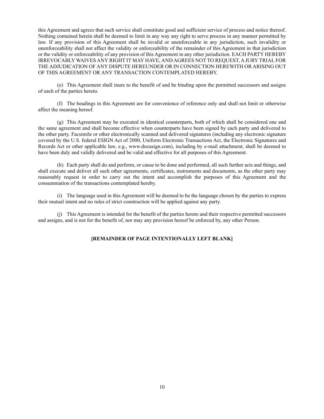 10 this Agreement and agrees that such service shall constitute good and sufficient service of process and notice thereof. Nothing contained herein shall be deemed to limit in any way any right to serve process in any manner permitted by law. If any provision of this Agreement shall be invalid or unenforceable in any jurisdiction, such invalidity or unenforceability shall not affect the validity or enforceability of the remainder of this Agreement in that jurisdiction or the validity or enforceability of any provision of this Agreement in any other jurisdiction. EACH PARTY HEREBY IRREVOCABLY WAIVES ANY RIGHT IT MAY HAVE, AND AGREES NOT TO REQUEST, A JURY TRIAL FOR THE ADJUDICATION OF ANY DISPUTE HEREUNDER OR IN CONNECTION HEREWITH OR ARISING OUT OF THIS AGREEMENT OR ANY TRANSACTION CONTEMPLATED HEREBY. (e) This Agreement shall inure to the benefit of and be binding upon the permitted successors and assigns of each of the parties hereto. (f) The headings in this Agreement are for convenience of reference only and shall not limit or otherwise affect the meaning hereof. (g) This Agreement may be executed in identical counterparts, both of which shall be considered one and the same agreement and shall become effective when counterparts have been signed by each party and delivered to the other party. Facsimile or other electronically scanned and delivered signatures (including any electronic signature covered by the U.S. federal ESIGN Act of 2000, Uniform Electronic Transactions Act, the Electronic Signatures and Records Act or other applicable law, e.g., www.docusign.com), including by e-mail attachment, shall be deemed to have been duly and validly delivered and be valid and effective for all purposes of this Agreement. (h) Each party shall do and perform, or cause to be done and performed, all such further acts and things, and shall execute and deliver all such other agreements, certificates, instruments and documents, as the other party may reasonably request in order to carry out the intent and accomplish the purposes of this Agreement and the consummation of the transactions contemplated hereby. (i) The language used in this Agreement will be deemed to be the language chosen by the parties to express their mutual intent and no rules of strict construction will be applied against any party. (j) This Agreement is intended for the benefit of the parties hereto and their respective permitted successors and assigns, and is not for the benefit of, nor may any provision hereof be enforced by, any other Person. [REMAINDER OF PAGE INTENTIONALLY LEFT BLANK]