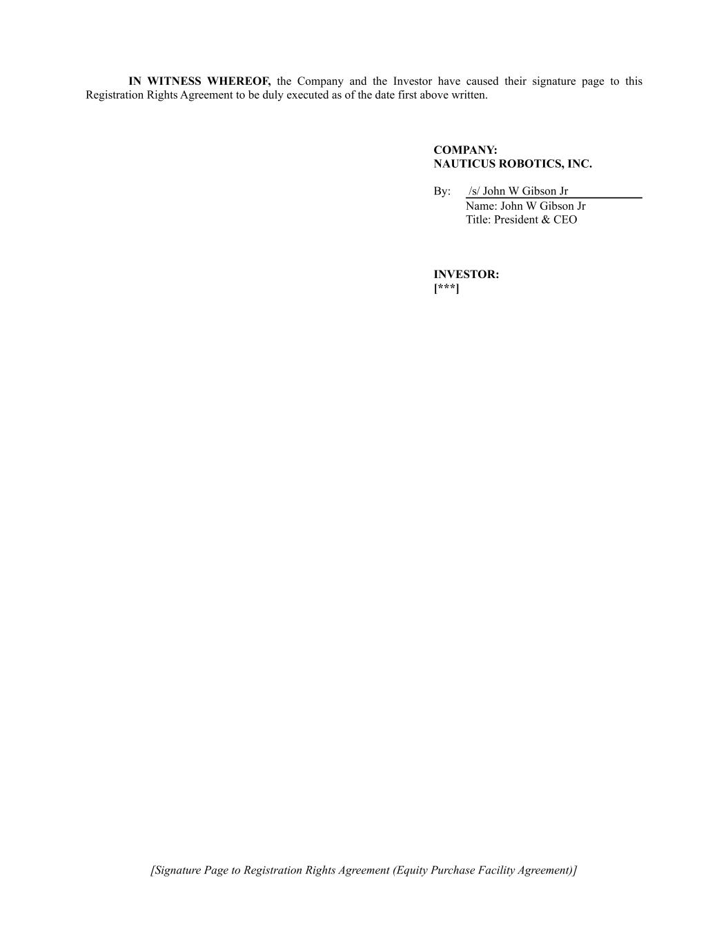[Signature Page to Registration Rights Agreement (Equity Purchase Facility Agreement)] IN WITNESS WHEREOF, the Company and the Investor have caused their signature page to this Registration Rights Agreement to be duly executed as of the date first above written. COMPANY: NAUTICUS ROBOTICS, INC. By: /s/ John W Gibson Jr Name: John W Gibson Jr Title: President & CEO INVESTOR: [***]