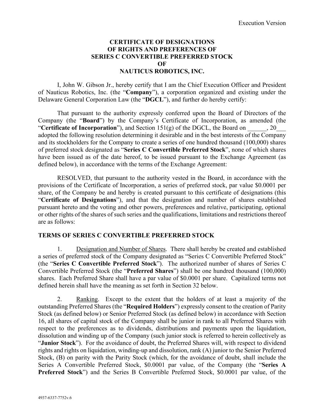 Execution Version 4937-6337-7752v.6 CERTIFICATE OF DESIGNATIONS OF RIGHTS AND PREFERENCES OF SERIES C CONVERTIBLE PREFERRED STOCK OF NAUTICUS ROBOTICS, INC. I, John W. Gibson Jr., hereby certify that I am the Chief Execution Officer and President of Nauticus Robotics, Inc. (the “Company”), a corporation organized and existing under the Delaware General Corporation Law (the “DGCL”), and further do hereby certify: That pursuant to the authority expressly conferred upon the Board of Directors of the Company (the “Board”) by the Company’s Certificate of Incorporation, as amended (the “Certificate of Incorporation”), and Section 151(g) of the DGCL, the Board on ______, 20___ adopted the following resolution determining it desirable and in the best interests of the Company and its stockholders for the Company to create a series of one hundred thousand (100,000) shares of preferred stock designated as “Series C Convertible Preferred Stock”, none of which shares have been issued as of the date hereof, to be issued pursuant to the Exchange Agreement (as defined below), in accordance with the terms of the Exchange Agreement: RESOLVED, that pursuant to the authority vested in the Board, in accordance with the provisions of the Certificate of Incorporation, a series of preferred stock, par value $0.0001 per share, of the Company be and hereby is created pursuant to this certificate of designations (this “Certificate of Designations”), and that the designation and number of shares established pursuant hereto and the voting and other powers, preferences and relative, participating, optional or other rights of the shares of such series and the qualifications, limitations and restrictions thereof are as follows: TERMS OF SERIES C CONVERTIBLE PREFERRED STOCK 1. Designation and Number of Shares. There shall hereby be created and established a series of preferred stock of the Company designated as “Series C Convertible Preferred Stock” (the “Series C Convertible Preferred Stock”). The authorized number of shares of Series C Convertible Preferred Stock (the “Preferred Shares”) shall be one hundred thousand (100,000) shares. Each Preferred Share shall have a par value of $0.0001 per share. Capitalized terms not defined herein shall have the meaning as set forth in Section 32 below. 2. Ranking. Except to the extent that the holders of at least a majority of the outstanding Preferred Shares (the “Required Holders”) expressly consent to the creation of Parity Stock (as defined below) or Senior Preferred Stock (as defined below) in accordance with Section 16, all shares of capital stock of the Company shall be junior in rank to all Preferred Shares with respect to the preferences as to dividends, distributions and payments upon the liquidation, dissolution and winding up of the Company (such junior stock is referred to herein collectively as “Junior Stock”). For the avoidance of doubt, the Preferred Shares will, with respect to dividend rights and rights on liquidation, winding-up and dissolution, rank (A) junior to the Senior Preferred Stock, (B) on parity with the Parity Stock (which, for the avoidance of doubt, shall include the Series A Convertible Preferred Stock, $0.0001 par value, of the Company (the “Series A Preferred Stock”) and the Series B Convertible Preferred Stock, $0.0001 par value, of the