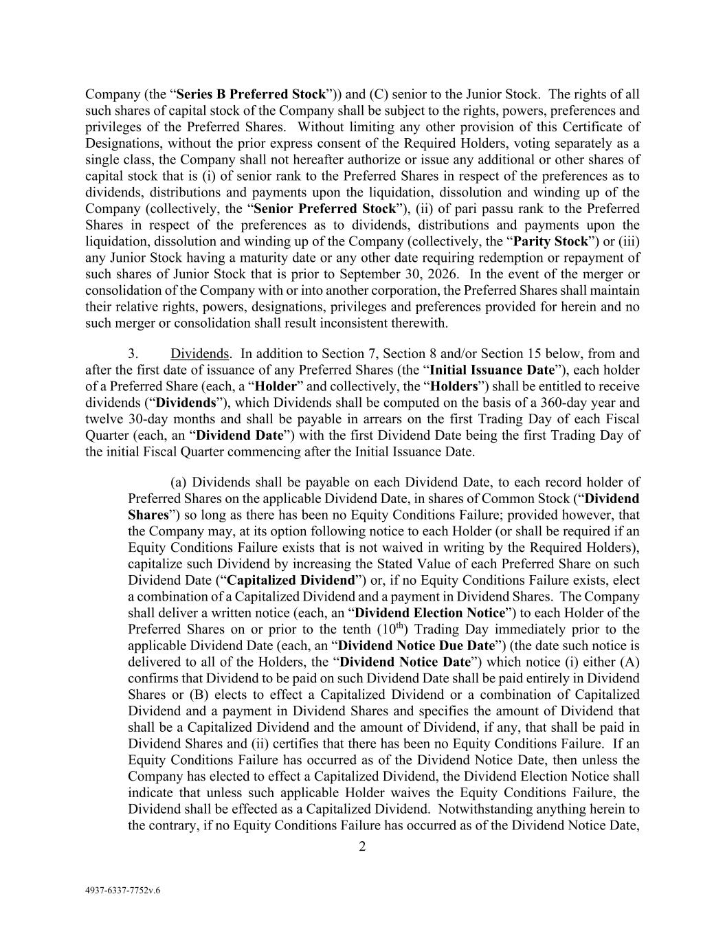 2 4937-6337-7752v.6 Company (the “Series B Preferred Stock”)) and (C) senior to the Junior Stock. The rights of all such shares of capital stock of the Company shall be subject to the rights, powers, preferences and privileges of the Preferred Shares. Without limiting any other provision of this Certificate of Designations, without the prior express consent of the Required Holders, voting separately as a single class, the Company shall not hereafter authorize or issue any additional or other shares of capital stock that is (i) of senior rank to the Preferred Shares in respect of the preferences as to dividends, distributions and payments upon the liquidation, dissolution and winding up of the Company (collectively, the “Senior Preferred Stock”), (ii) of pari passu rank to the Preferred Shares in respect of the preferences as to dividends, distributions and payments upon the liquidation, dissolution and winding up of the Company (collectively, the “Parity Stock”) or (iii) any Junior Stock having a maturity date or any other date requiring redemption or repayment of such shares of Junior Stock that is prior to September 30, 2026. In the event of the merger or consolidation of the Company with or into another corporation, the Preferred Shares shall maintain their relative rights, powers, designations, privileges and preferences provided for herein and no such merger or consolidation shall result inconsistent therewith. 3. Dividends. In addition to Section 7, Section 8 and/or Section 15 below, from and after the first date of issuance of any Preferred Shares (the “Initial Issuance Date”), each holder of a Preferred Share (each, a “Holder” and collectively, the “Holders”) shall be entitled to receive dividends (“Dividends”), which Dividends shall be computed on the basis of a 360-day year and twelve 30-day months and shall be payable in arrears on the first Trading Day of each Fiscal Quarter (each, an “Dividend Date”) with the first Dividend Date being the first Trading Day of the initial Fiscal Quarter commencing after the Initial Issuance Date. (a) Dividends shall be payable on each Dividend Date, to each record holder of Preferred Shares on the applicable Dividend Date, in shares of Common Stock (“Dividend Shares”) so long as there has been no Equity Conditions Failure; provided however, that the Company may, at its option following notice to each Holder (or shall be required if an Equity Conditions Failure exists that is not waived in writing by the Required Holders), capitalize such Dividend by increasing the Stated Value of each Preferred Share on such Dividend Date (“Capitalized Dividend”) or, if no Equity Conditions Failure exists, elect a combination of a Capitalized Dividend and a payment in Dividend Shares. The Company shall deliver a written notice (each, an “Dividend Election Notice”) to each Holder of the Preferred Shares on or prior to the tenth (10th) Trading Day immediately prior to the applicable Dividend Date (each, an “Dividend Notice Due Date”) (the date such notice is delivered to all of the Holders, the “Dividend Notice Date”) which notice (i) either (A) confirms that Dividend to be paid on such Dividend Date shall be paid entirely in Dividend Shares or (B) elects to effect a Capitalized Dividend or a combination of Capitalized Dividend and a payment in Dividend Shares and specifies the amount of Dividend that shall be a Capitalized Dividend and the amount of Dividend, if any, that shall be paid in Dividend Shares and (ii) certifies that there has been no Equity Conditions Failure. If an Equity Conditions Failure has occurred as of the Dividend Notice Date, then unless the Company has elected to effect a Capitalized Dividend, the Dividend Election Notice shall indicate that unless such applicable Holder waives the Equity Conditions Failure, the Dividend shall be effected as a Capitalized Dividend. Notwithstanding anything herein to the contrary, if no Equity Conditions Failure has occurred as of the Dividend Notice Date,