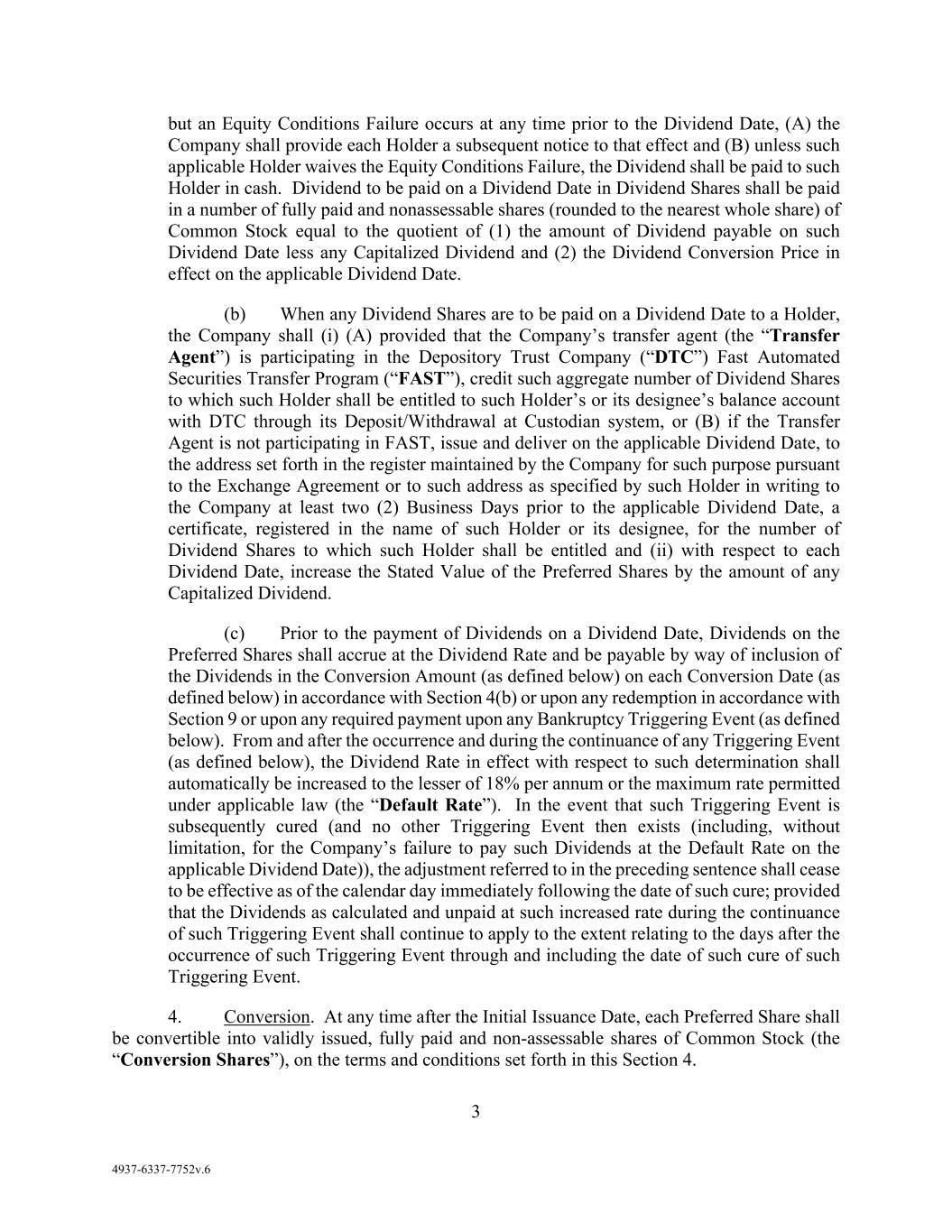 3 4937-6337-7752v.6 but an Equity Conditions Failure occurs at any time prior to the Dividend Date, (A) the Company shall provide each Holder a subsequent notice to that effect and (B) unless such applicable Holder waives the Equity Conditions Failure, the Dividend shall be paid to such Holder in cash. Dividend to be paid on a Dividend Date in Dividend Shares shall be paid in a number of fully paid and nonassessable shares (rounded to the nearest whole share) of Common Stock equal to the quotient of (1) the amount of Dividend payable on such Dividend Date less any Capitalized Dividend and (2) the Dividend Conversion Price in effect on the applicable Dividend Date. (b) When any Dividend Shares are to be paid on a Dividend Date to a Holder, the Company shall (i) (A) provided that the Company’s transfer agent (the “Transfer Agent”) is participating in the Depository Trust Company (“DTC”) Fast Automated Securities Transfer Program (“FAST”), credit such aggregate number of Dividend Shares to which such Holder shall be entitled to such Holder’s or its designee’s balance account with DTC through its Deposit/Withdrawal at Custodian system, or (B) if the Transfer Agent is not participating in FAST, issue and deliver on the applicable Dividend Date, to the address set forth in the register maintained by the Company for such purpose pursuant to the Exchange Agreement or to such address as specified by such Holder in writing to the Company at least two (2) Business Days prior to the applicable Dividend Date, a certificate, registered in the name of such Holder or its designee, for the number of Dividend Shares to which such Holder shall be entitled and (ii) with respect to each Dividend Date, increase the Stated Value of the Preferred Shares by the amount of any Capitalized Dividend. (c) Prior to the payment of Dividends on a Dividend Date, Dividends on the Preferred Shares shall accrue at the Dividend Rate and be payable by way of inclusion of the Dividends in the Conversion Amount (as defined below) on each Conversion Date (as defined below) in accordance with Section 4(b) or upon any redemption in accordance with Section 9 or upon any required payment upon any Bankruptcy Triggering Event (as defined below). From and after the occurrence and during the continuance of any Triggering Event (as defined below), the Dividend Rate in effect with respect to such determination shall automatically be increased to the lesser of 18% per annum or the maximum rate permitted under applicable law (the “Default Rate”). In the event that such Triggering Event is subsequently cured (and no other Triggering Event then exists (including, without limitation, for the Company’s failure to pay such Dividends at the Default Rate on the applicable Dividend Date)), the adjustment referred to in the preceding sentence shall cease to be effective as of the calendar day immediately following the date of such cure; provided that the Dividends as calculated and unpaid at such increased rate during the continuance of such Triggering Event shall continue to apply to the extent relating to the days after the occurrence of such Triggering Event through and including the date of such cure of such Triggering Event. 4. Conversion. At any time after the Initial Issuance Date, each Preferred Share shall be convertible into validly issued, fully paid and non-assessable shares of Common Stock (the “Conversion Shares”), on the terms and conditions set forth in this Section 4.